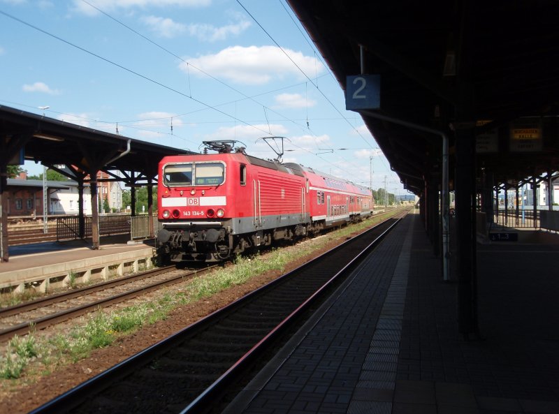 143 134 als RB 41 Nordhausen - Heiligenstadt (Eichsfeld) bei der Einfahrt in Leinefelde. 05.07.2008