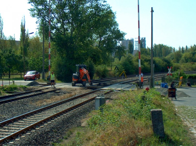 In der Nacht vom 26.08. auf den 27.08.2009 wurde das Gleis 2 in Karsdorf in Richtung Laucha neu gestopft. Danach fanden am Vormittag auch Bauarbeiten am Bahnübergang neben dem Stellwerk B3 statt. Frank Thomas
