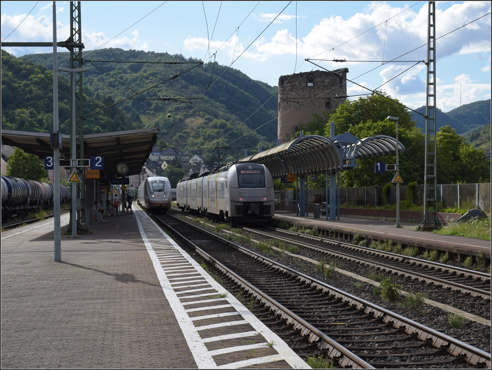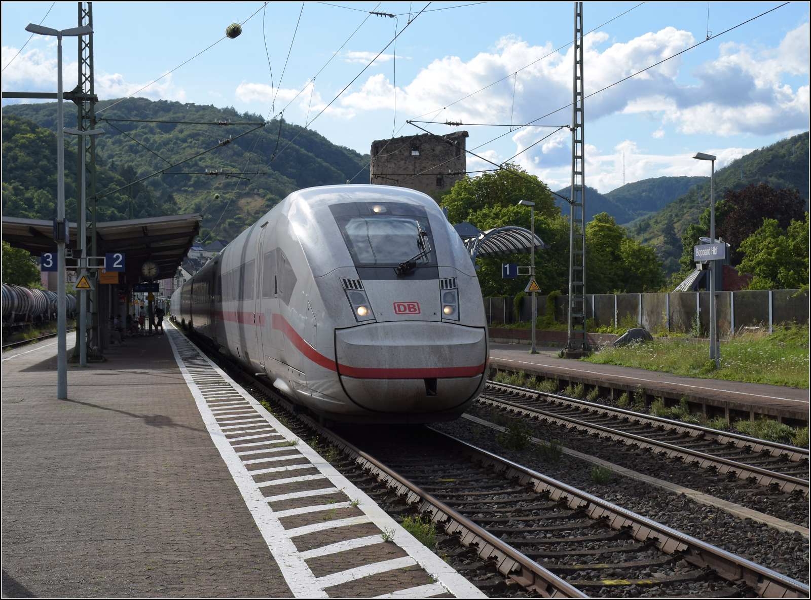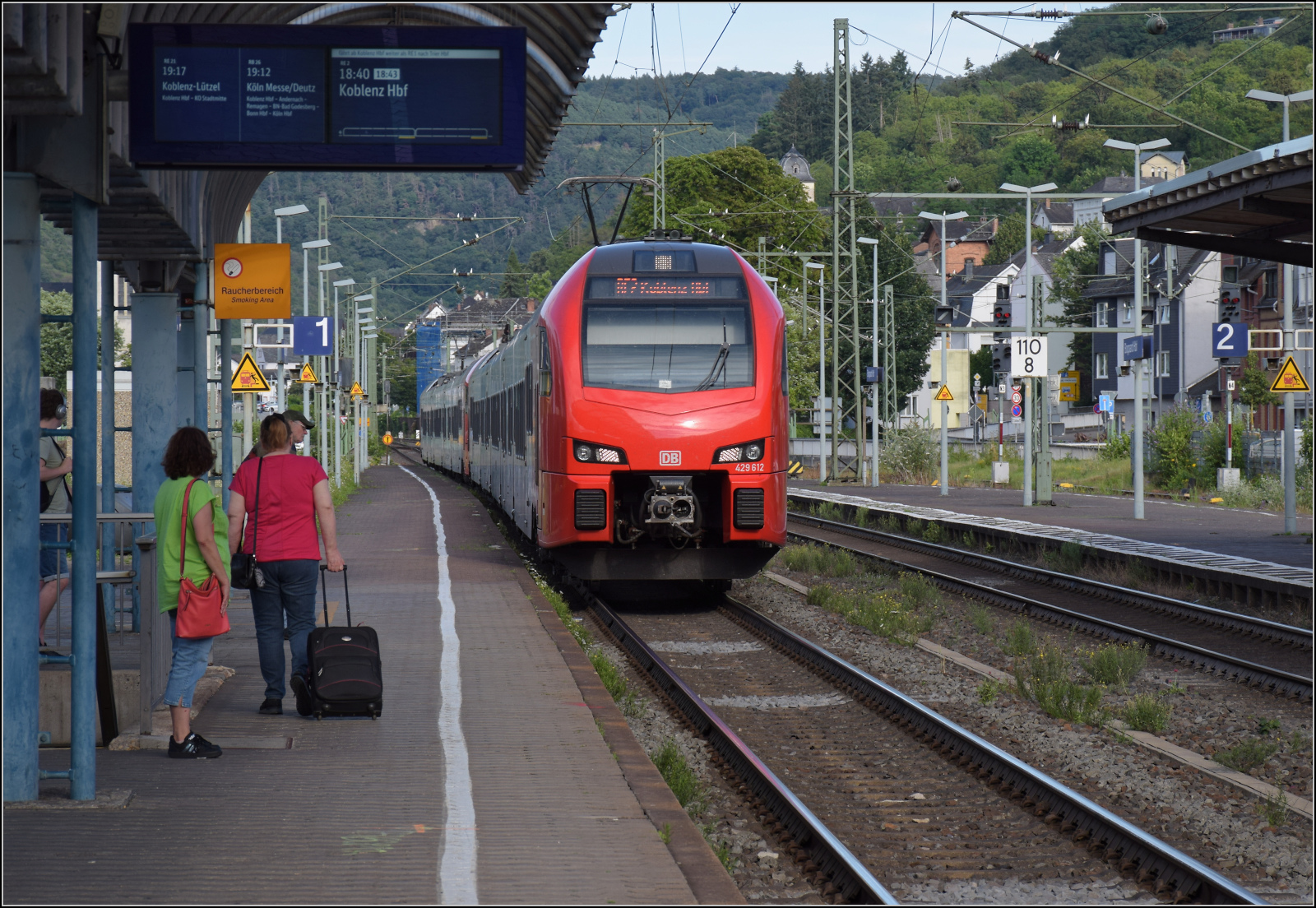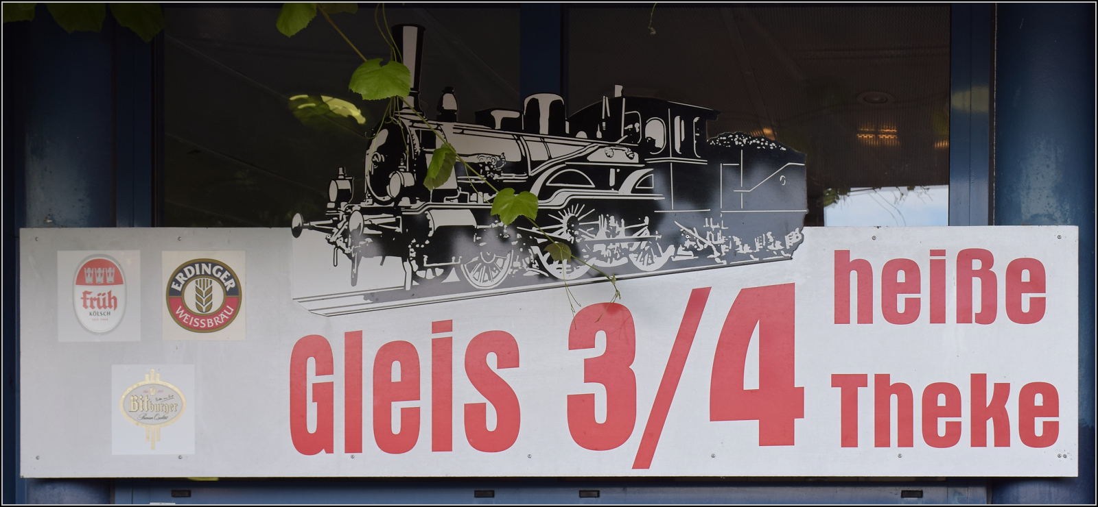 Gleis 3/4 hat als Maskottchen eine Dampflok mit der Achsfolge 1'B. Diese lässt sich als preußische P 31 identifizieren. Sie dürfte wohl der Rheinischen Eisenbahn-Gesellschaft erinnern. Die preußische P 31 war im Umnummerierungsplan für 34 7001-7012 vorgesehen. Tatsächlich wurden nur noch baugleiche mecklenburgische Loks der Gattung IV in 34 7301 bis 7308 und die etwas schwereren in 34 7351-7354 umgezeichnet. Wer auch immer das Schild designte, hatte offenbar einen etwas besseres Verständnis von Eisenbahn. Boppard, Juli 2024. km0