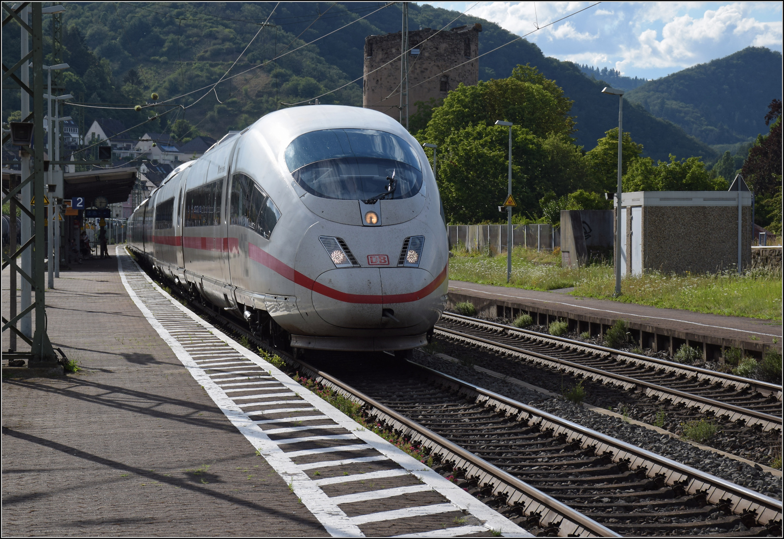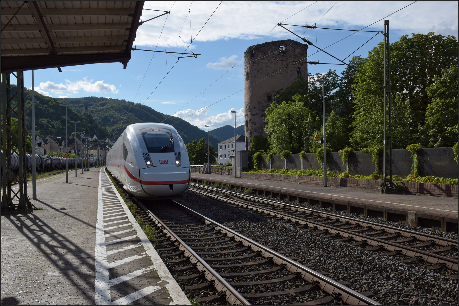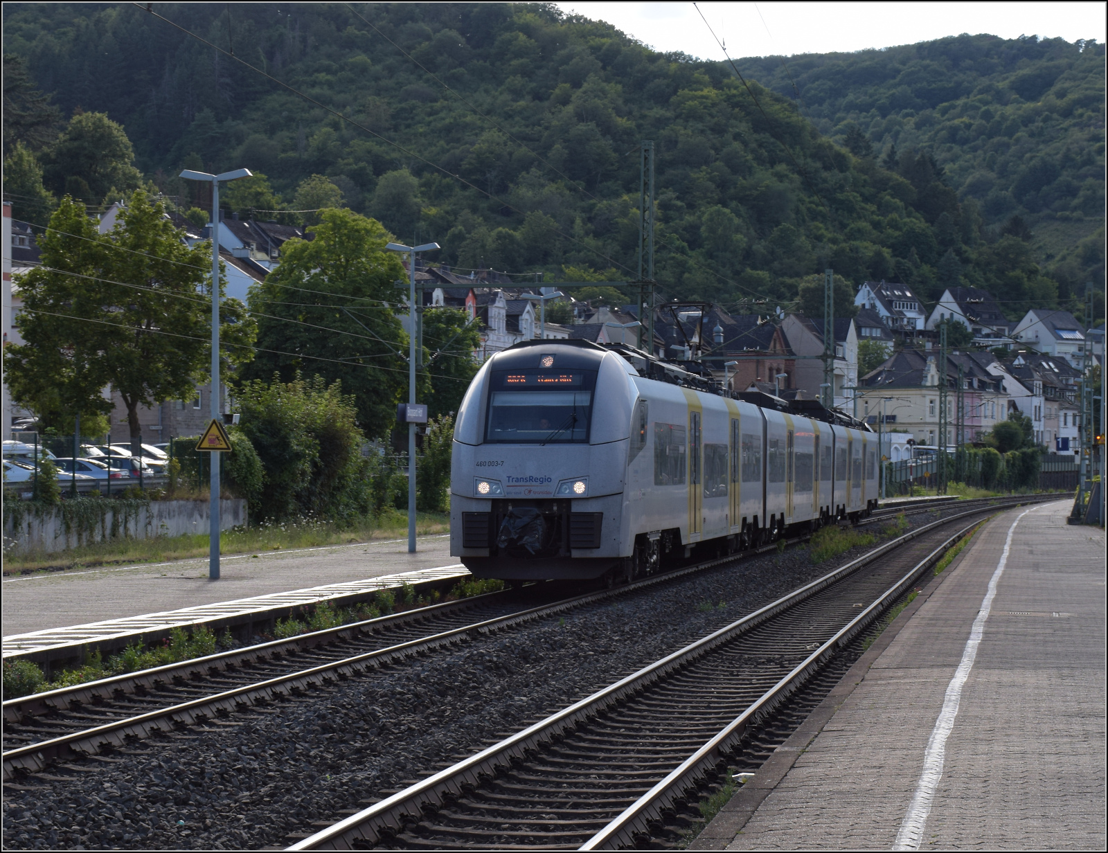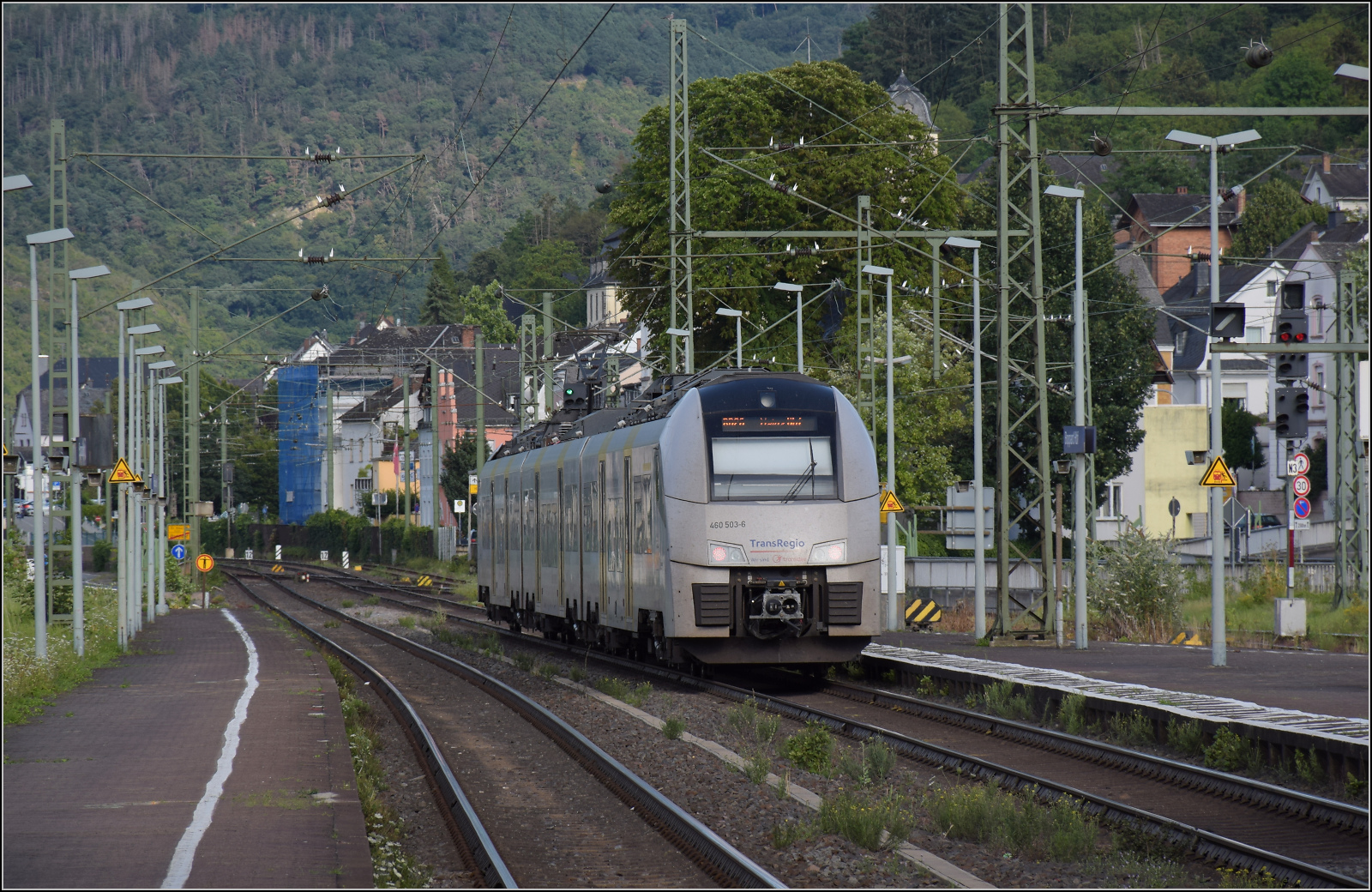 Gleis 3/4 hat als Maskottchen eine Dampflok mit der Achsfolge 1'B. Diese lässt sich als preußische P 31 identifizieren. Sie dürfte wohl der Rheinischen Eisenbahn-Gesellschaft erinnern. Die preußische P 31 war im Umnummerierungsplan für 34 7001-7012 vorgesehen. Tatsächlich wurden nur noch baugleiche mecklenburgische Loks der Gattung IV in 34 7301 bis 7308 und die etwas schwereren in 34 7351-7354 umgezeichnet. Wer auch immer das Schild designte, hatte offenbar einen etwas besseres Verständnis von Eisenbahn. Boppard, Juli 2024. km0