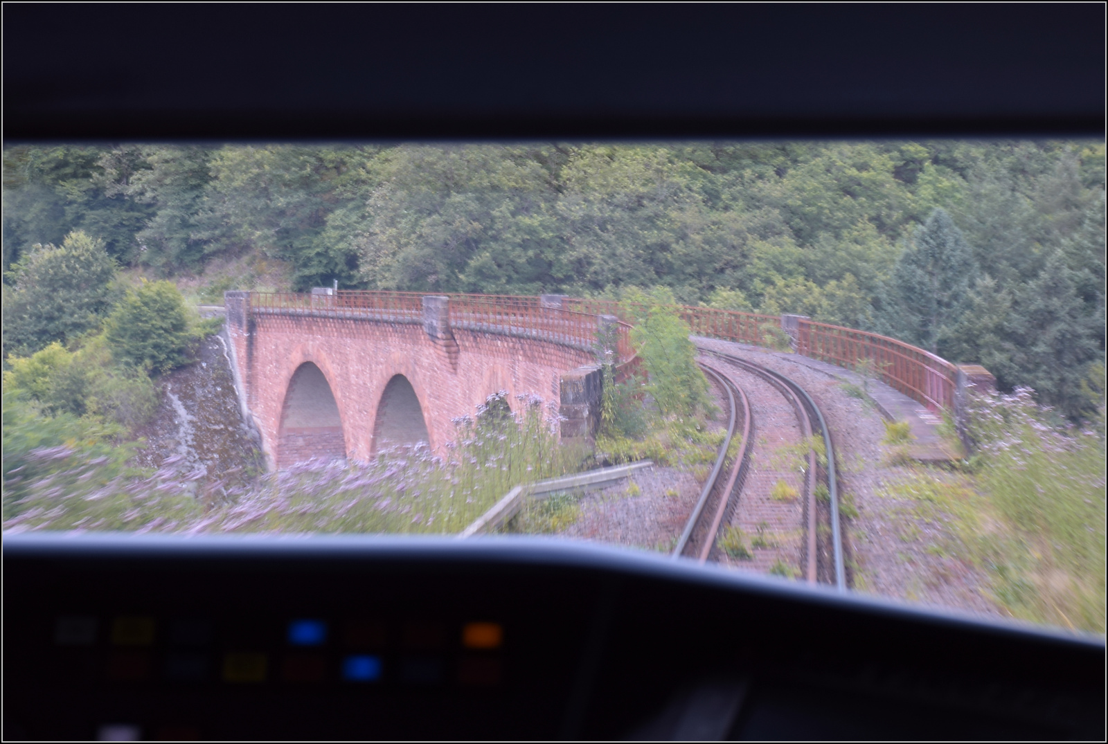 Blick aus dem Zug der Hunsrückbahn auf den Hubertusviadukt. Emmelshausen, Juli 2024.