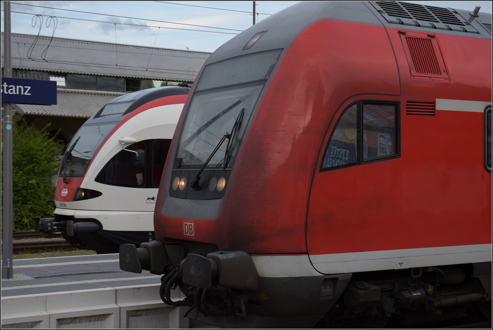 Schwarzwaldbahn mit 146 238 in Konstanz, dahinter der Wiesentäler RABe 521 006. August 2024.