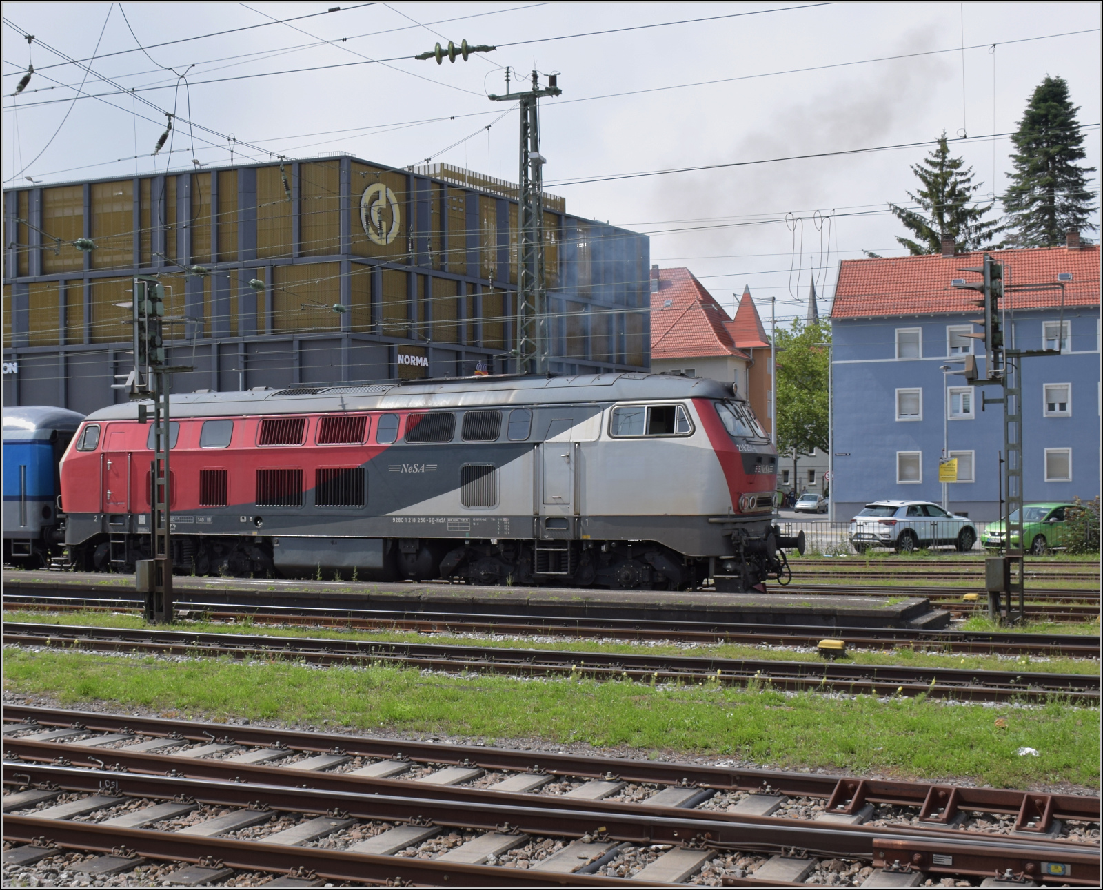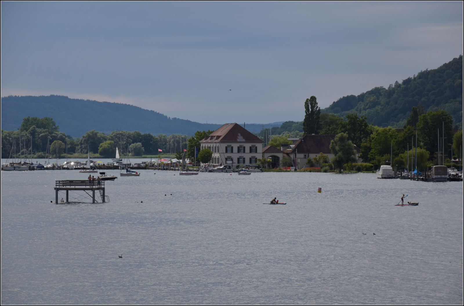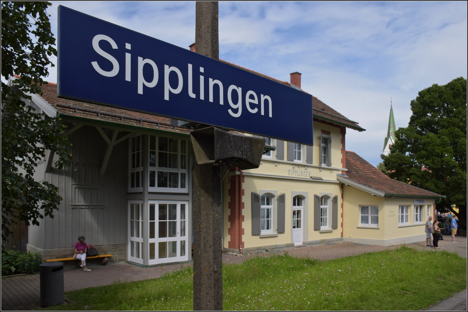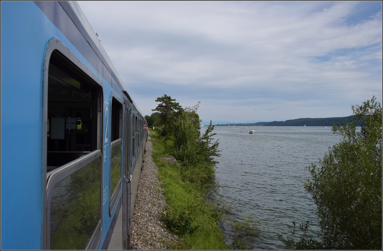 Blick aus dem Zug mit 218 256. Sernatingen hatte ein ähnliches Schicksal wie die Stadt Buchhorn. Ein selbstverliebter Herrscher brauchte einen Hafen mit eingenem Namen am Bodensee. So wurde daraus 1826 Ludwigshafen. Zeuge der Zeit ist das wuchtige Zollhaus mit der Inschrift an der Hafenseite "Großherzogliches Badisches Hauptzollamt". Bis dorthin führten auch einstmals Gleise. Juli 2024. km0
