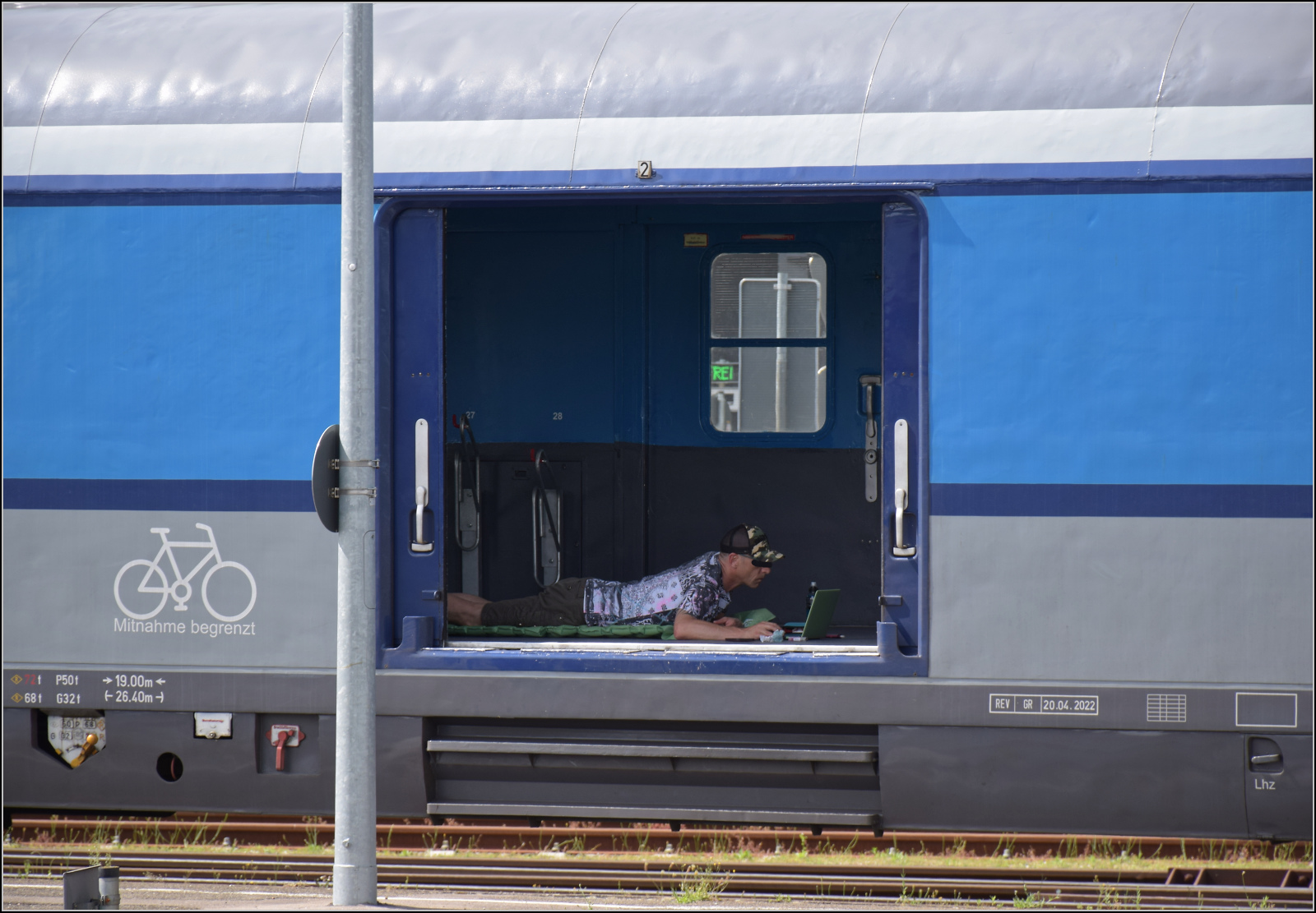 Die Wartezeit auf die Abfahrt des Radexpress Bodensee will gekonnt überbrückt werden. Das Notebook muss wie sein Computer-Operator schon hitzeresistent sein, um hier zu funktionieren. Singen, Juli 2024. km0