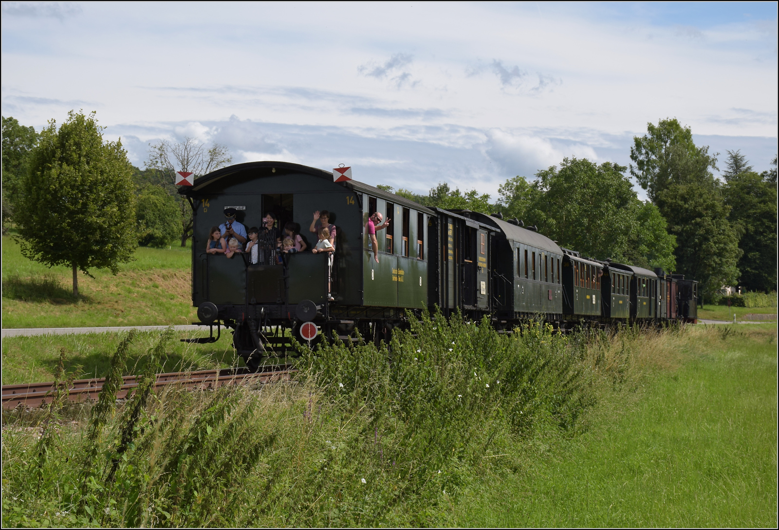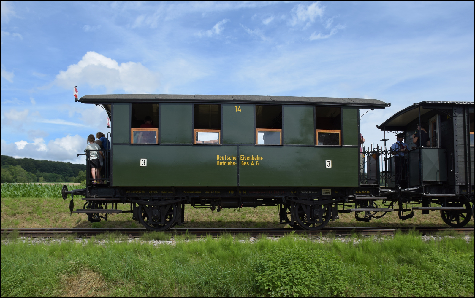 Wagen Ci 14 könnte man getrost als Umbauzweiachser bezeichnen. Sein Erscheinungsbild erhielt der Wagen beim Umbau oder Neuaufbau des Kastens in den 1920er Jahren durch die BLEAG. Da wurde aus Kostengründen ein altes Fahrgestell verwendet. Während der Restaurierungsarbeiten stellte sich heraus, dass der Wagen als Erstausstattung 1894 von Van der Zypen & Charlier an die Meppen-Haselünner Eisenbahn geliefert wurde und die Nummer 2 erhielt. Sein damaliges Aussehen ist auf der Wikipediaseite zu dieser Bahn mit einem Foto vom Eröffnungstag dokumentiert. Hammerstein, Juli 2024. km0