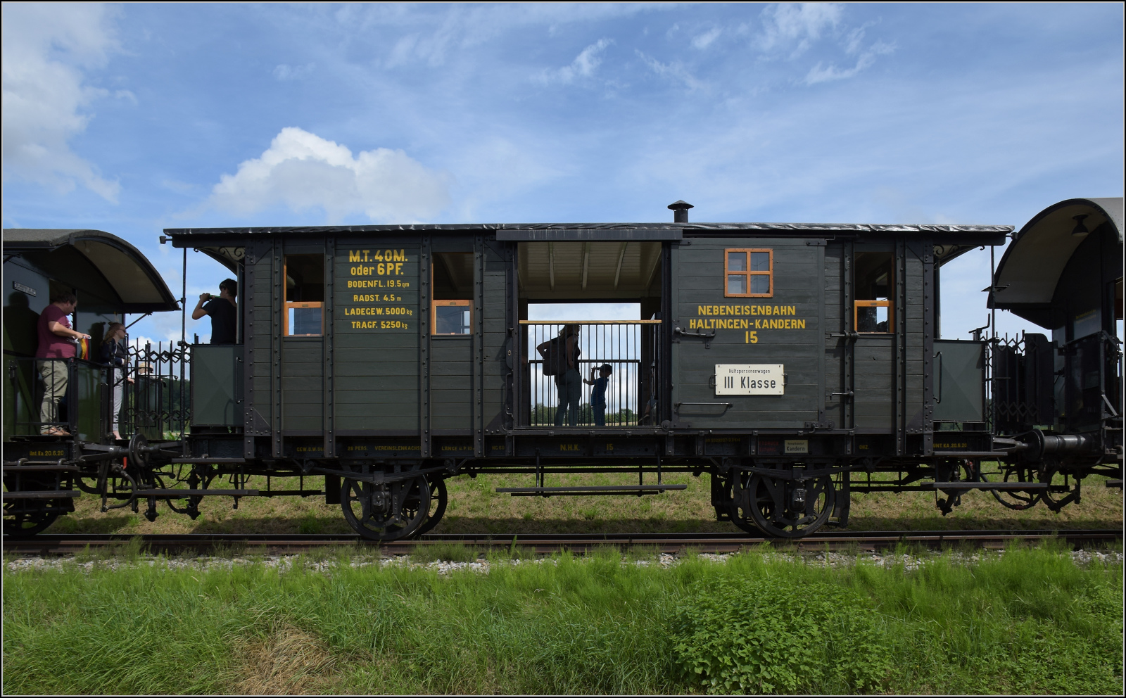 Der Fakultativwagen Cgi 15 wurde 1894 von Van der Zypen & Charlier gebaut und wurde als Grundausstattung an die Nebeneisenbahn Haltingen-Kandern geliefert. Der eigentliche Cgi 15 der Kandertalbahn ist allerdings verschollen und wurde daher vom Museumsverein mit einem baugleichen Wagen preußischen Staatsbahn ersetzt. Dieser trug die Nummer 'Breslau 8173'. Hammerstein, Mai 2024. km0
