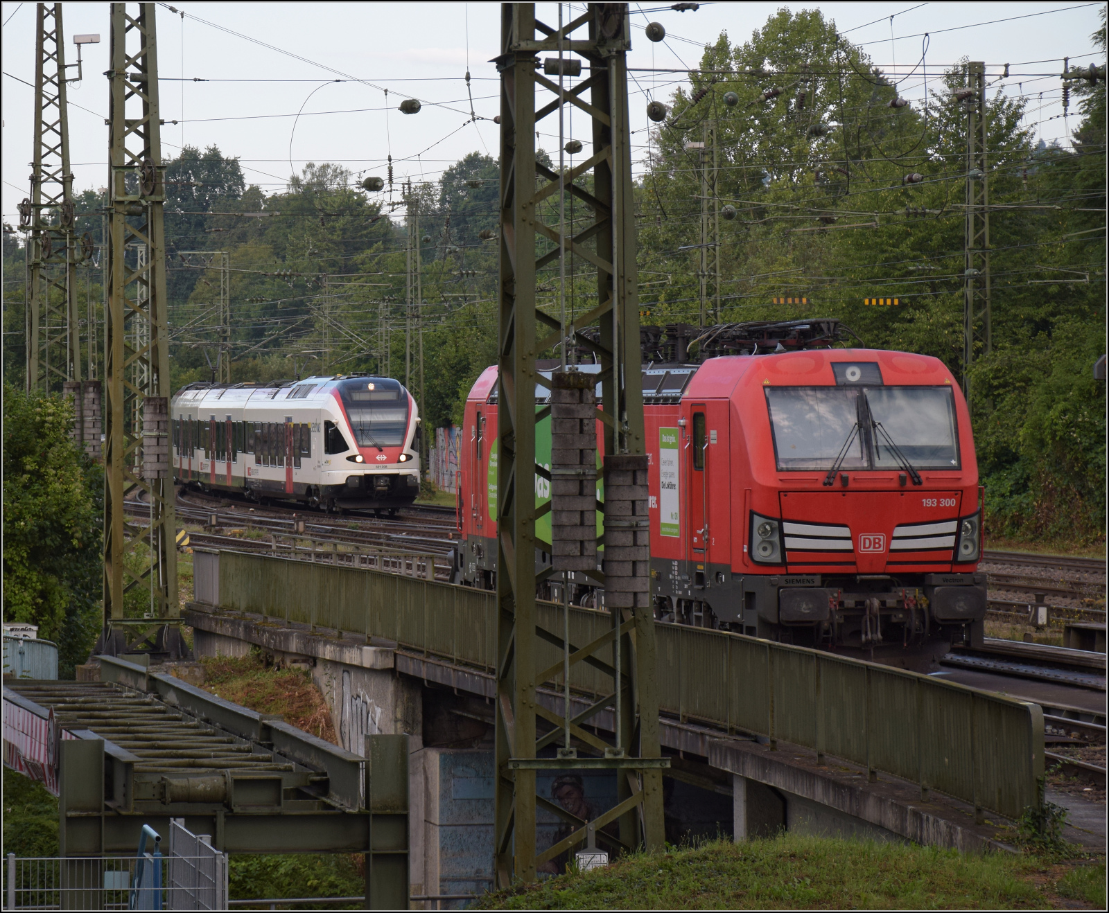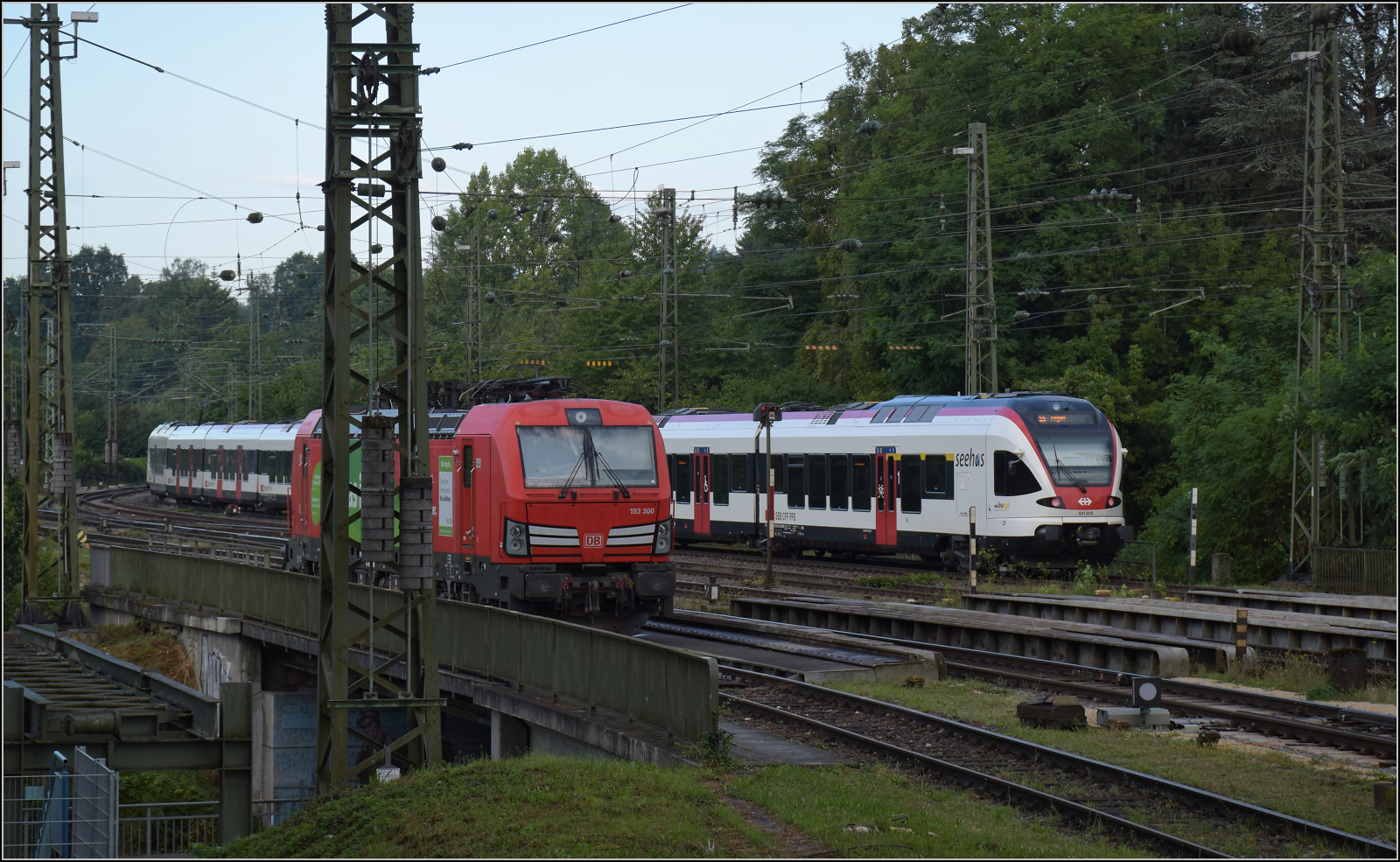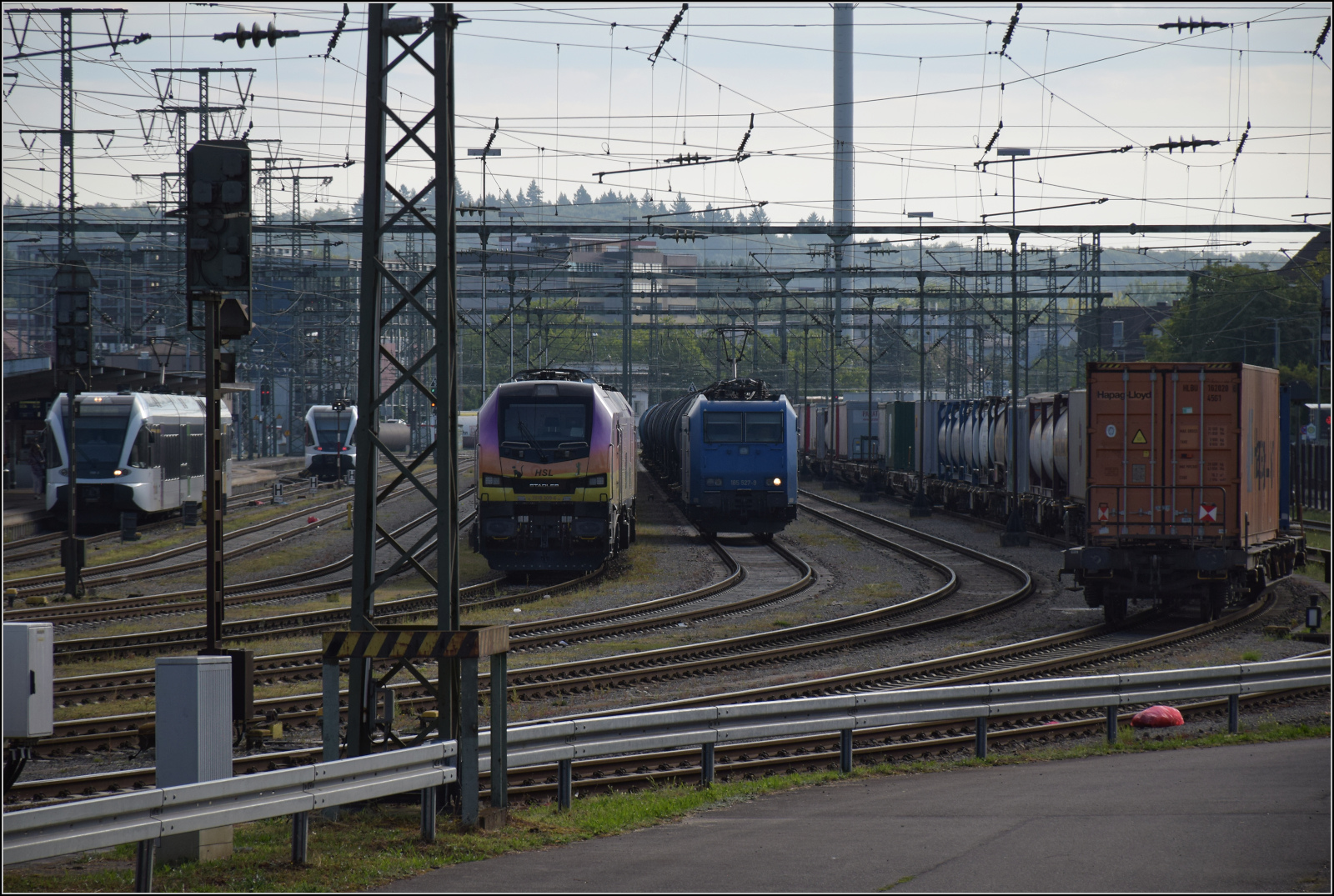 185 527 von ATLU rangiert vor ihren umgeleiteten Zug, während 612 107 nach Erzingen ausfährt. Singen, August 2024.