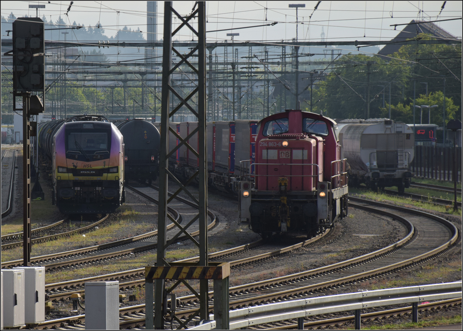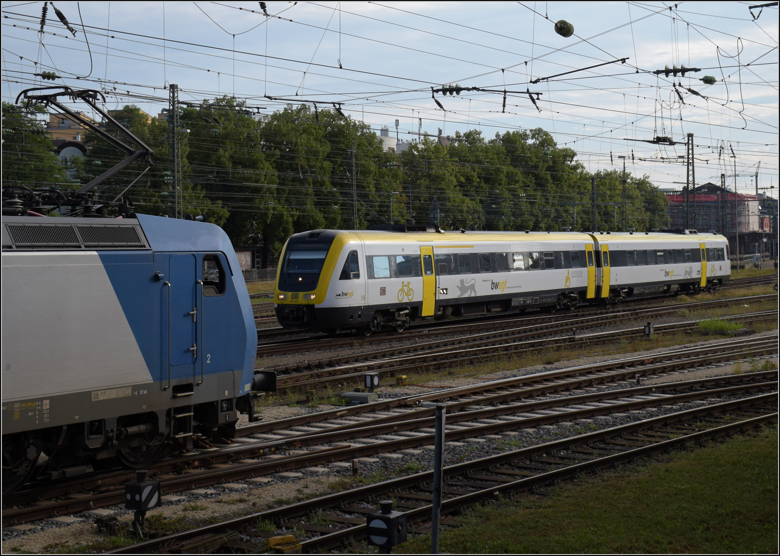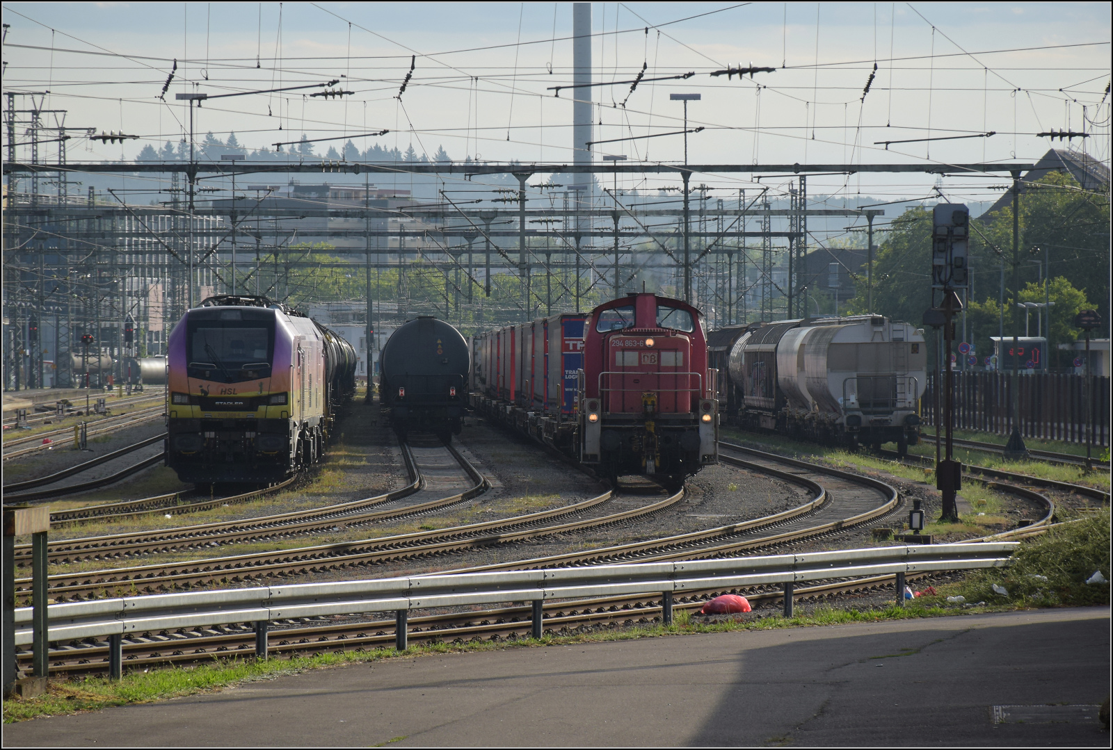 185 527 von ATLU rangiert vor ihren umgeleiteten Zug, während 612 107 nach Erzingen ausfährt. Singen, August 2024.