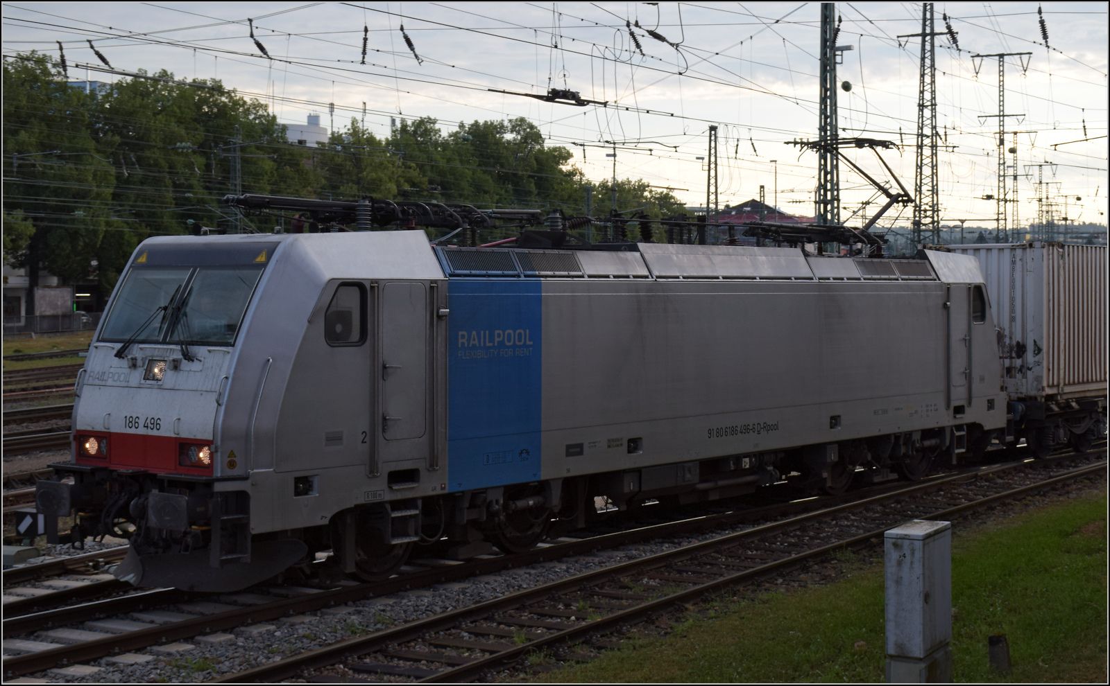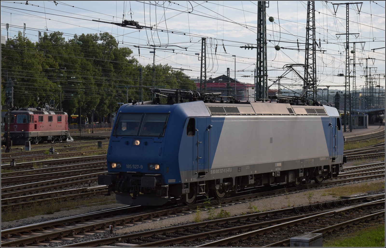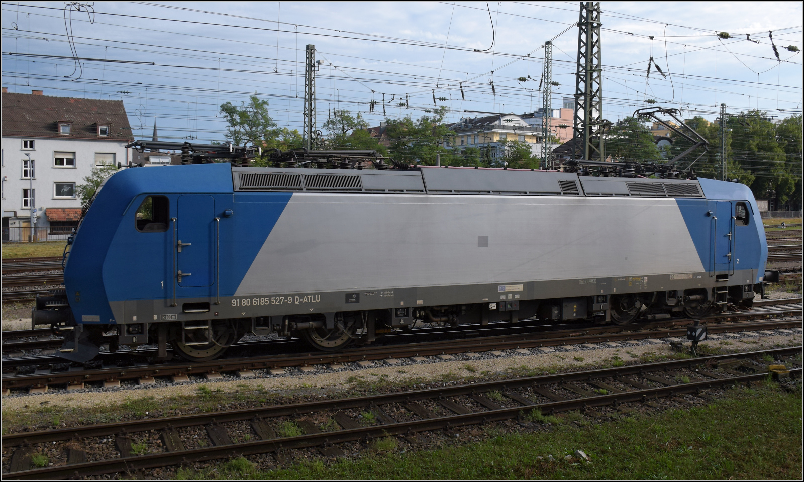 185 527 von ATLU rangiert vor ihren umgeleiteten Zug. Singen, August 2024.