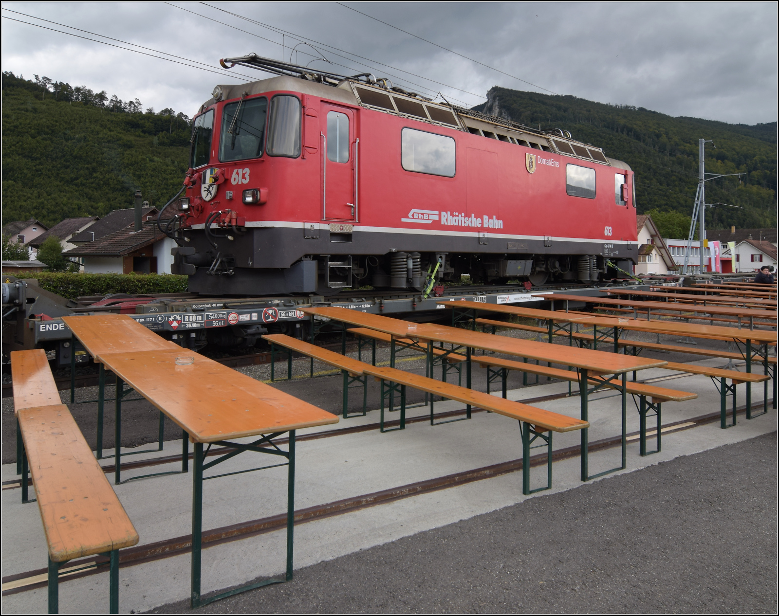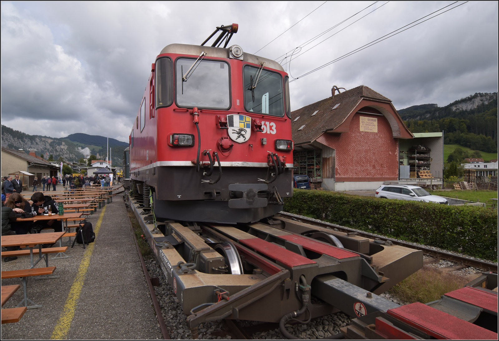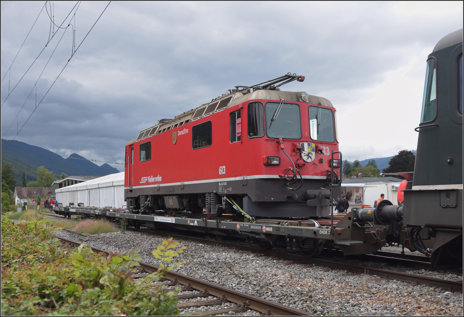 Ge 4/4 613 'Domat/Ems' der RhB ist die Schmalspurvariante der Universallok und reiste per Rollschemel nach Balsthal. September 2024. km0