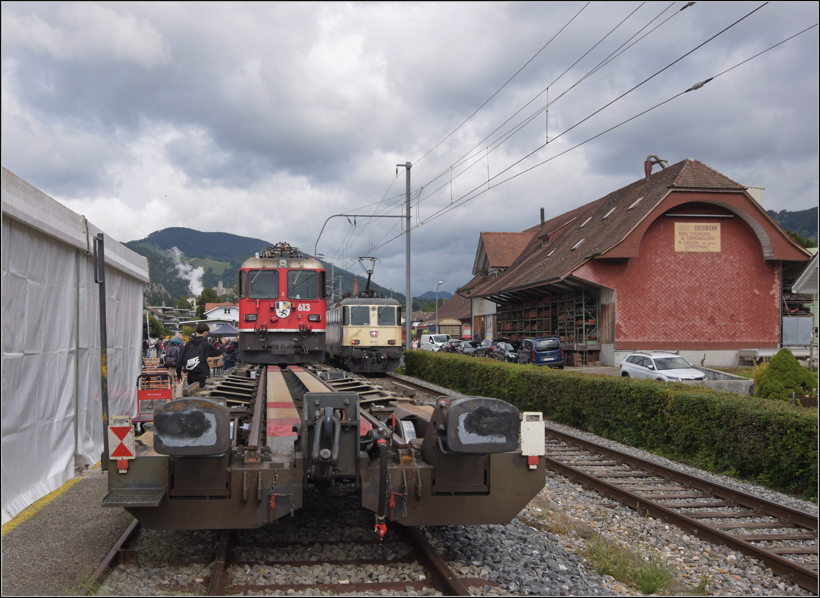 Re 4/4 III 11350 der OeBB historic hätte einst Re 4/4 II 11156 werden sollen. Die SOB brauchte auch eine Lok, allerdings für Steilstrecken statt Geschwindigkeit geeignet. Mit geringerer Geschwindigkeit wurde sie als SOB Re 4/4 41 in Betrieb genommen. Im Rahmen eines Loktausches gelangte sie erst später zu den SBB, wo die freigebliebene Nummer 11350 vergeben wurde. Zusammen mit zwei Loks für die EBT gehörte sie noch zu der ersten Serie erkennbar an ihrem Scherenstromabnehmer. Klus, September 2024. km0
