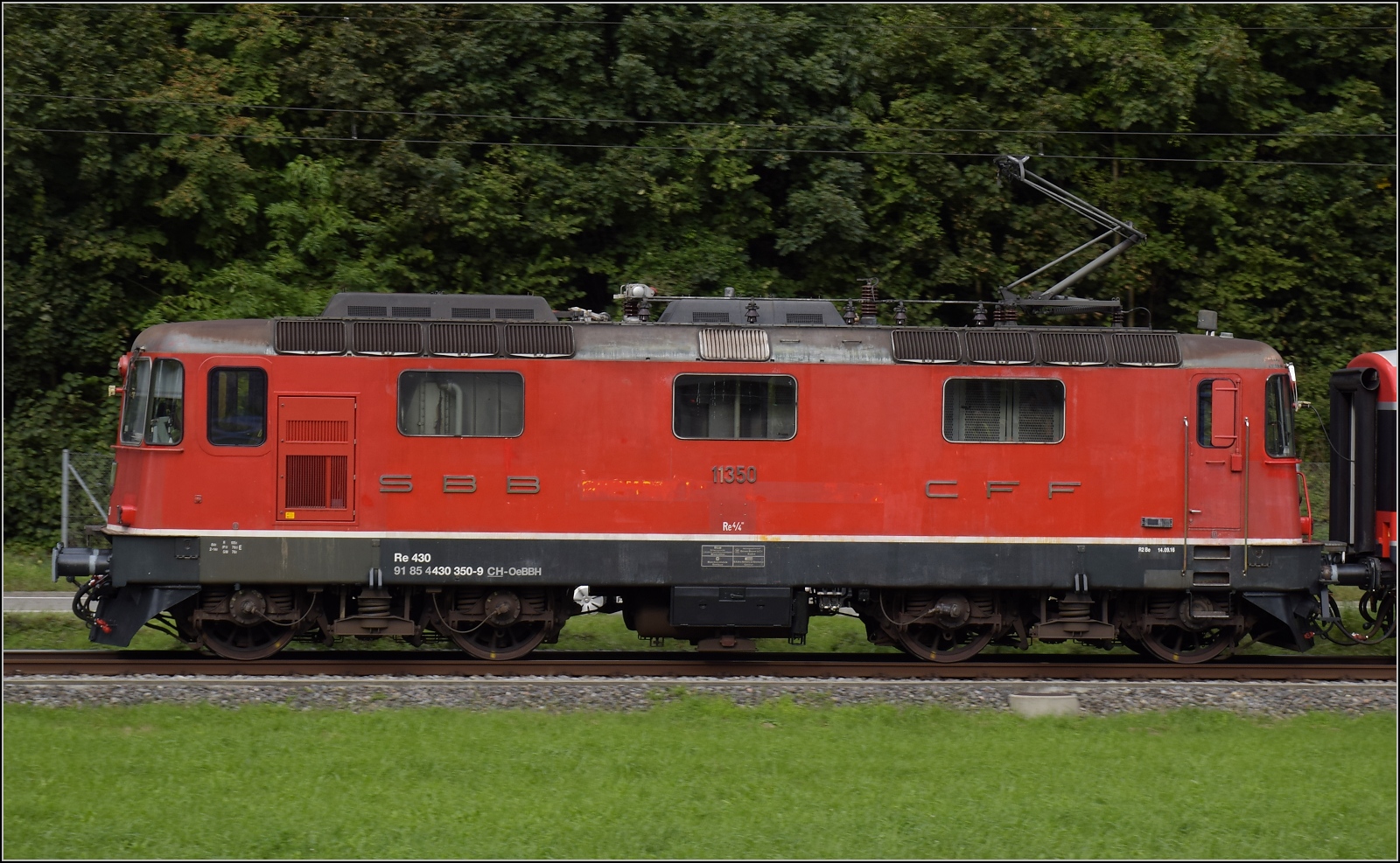 Re 4/4 III 11350 der OeBB historic hätte einst Re 4/4 II 11156 werden sollen. Die SOB brauchte auch eine Lok, allerdings für Steilstrecken statt Geschwindigkeit geeignet. Mit geringerer Geschwindigkeit wurde sie als SOB Re 4/4 41 in Betrieb genommen. Im Rahmen eines Loktausches gelangte sie erst später zu den SBB, wo die freigebliebene Nummer 11350 vergeben wurde. Zusammen mit zwei Loks für die EBT gehörte sie noch zu der ersten Serie erkennbar an ihrem Scherenstromabnehmer. Äussere Klus, September 2024. km0
