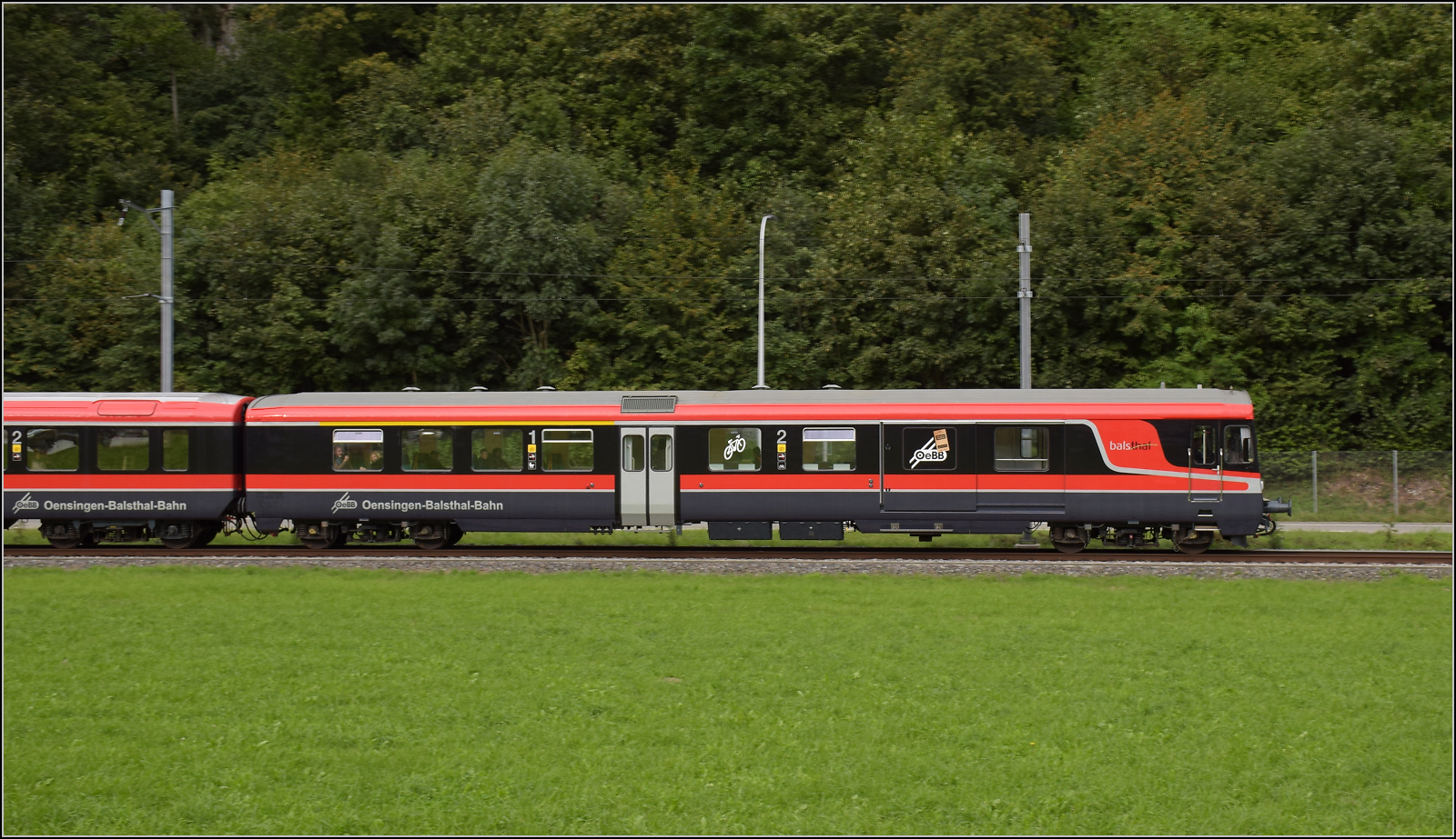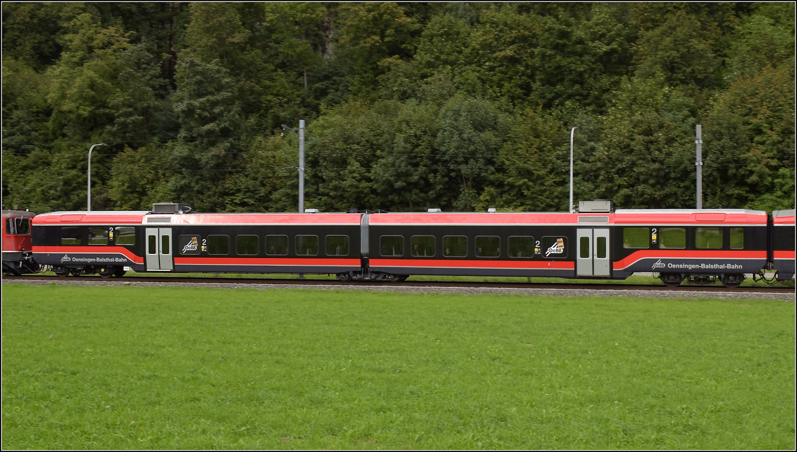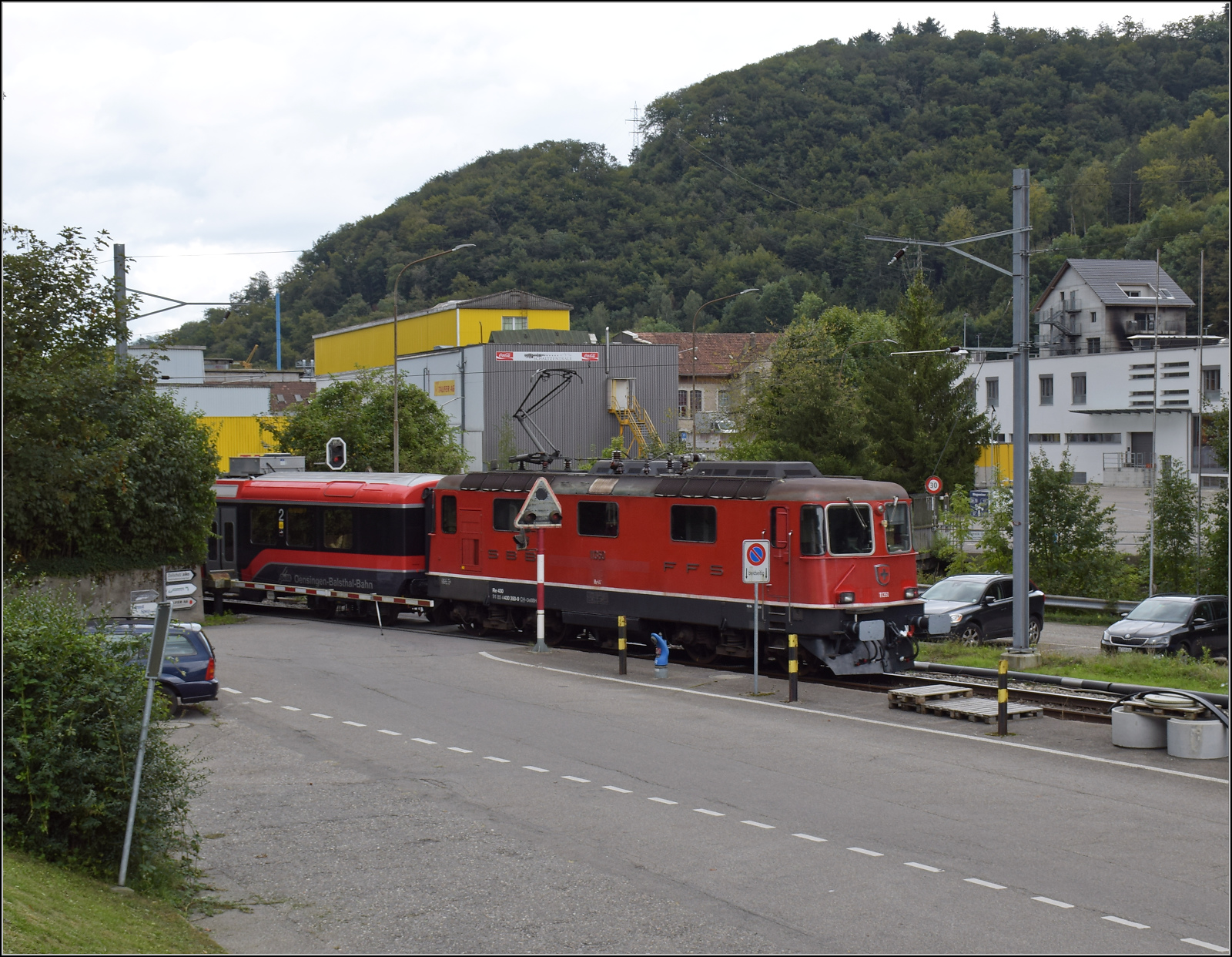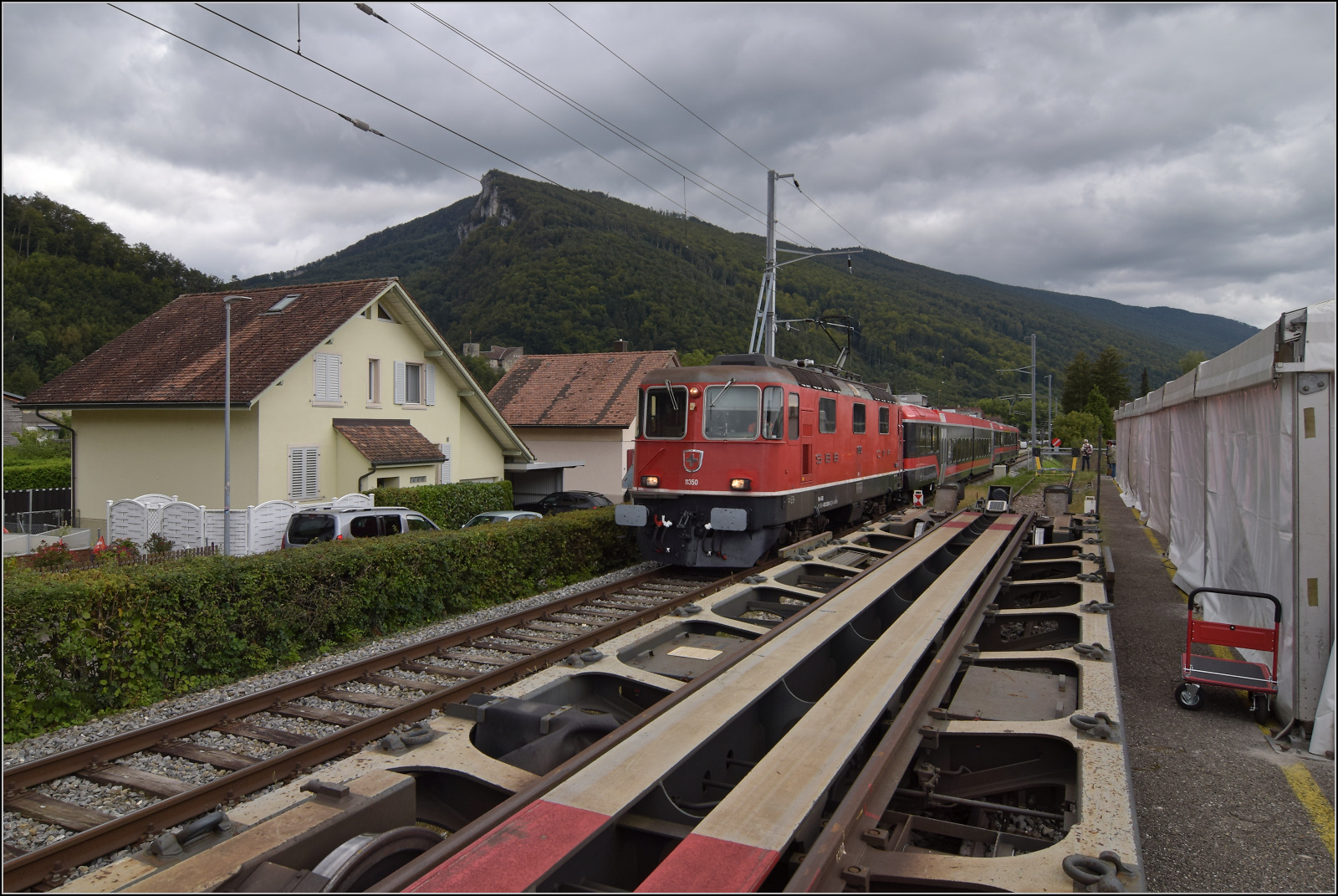 Re 4/4 III 11350 der OeBB historic hätte einst Re 4/4 II 11156 werden sollen. Die SOB brauchte auch eine Lok, allerdings für Steilstrecken statt Geschwindigkeit geeignet. Mit geringerer Geschwindigkeit wurde sie als SOB Re 4/4 41 in Betrieb genommen. Im Rahmen eines Loktausches gelangte sie erst später zu den SBB, wo die freigebliebene Nummer 11350 vergeben wurde. Zusammen mit zwei Loks für die EBT gehörte sie noch zu der ersten Serie erkennbar an ihrem Scherenstromabnehmer. Balsthal, September 2024. km0