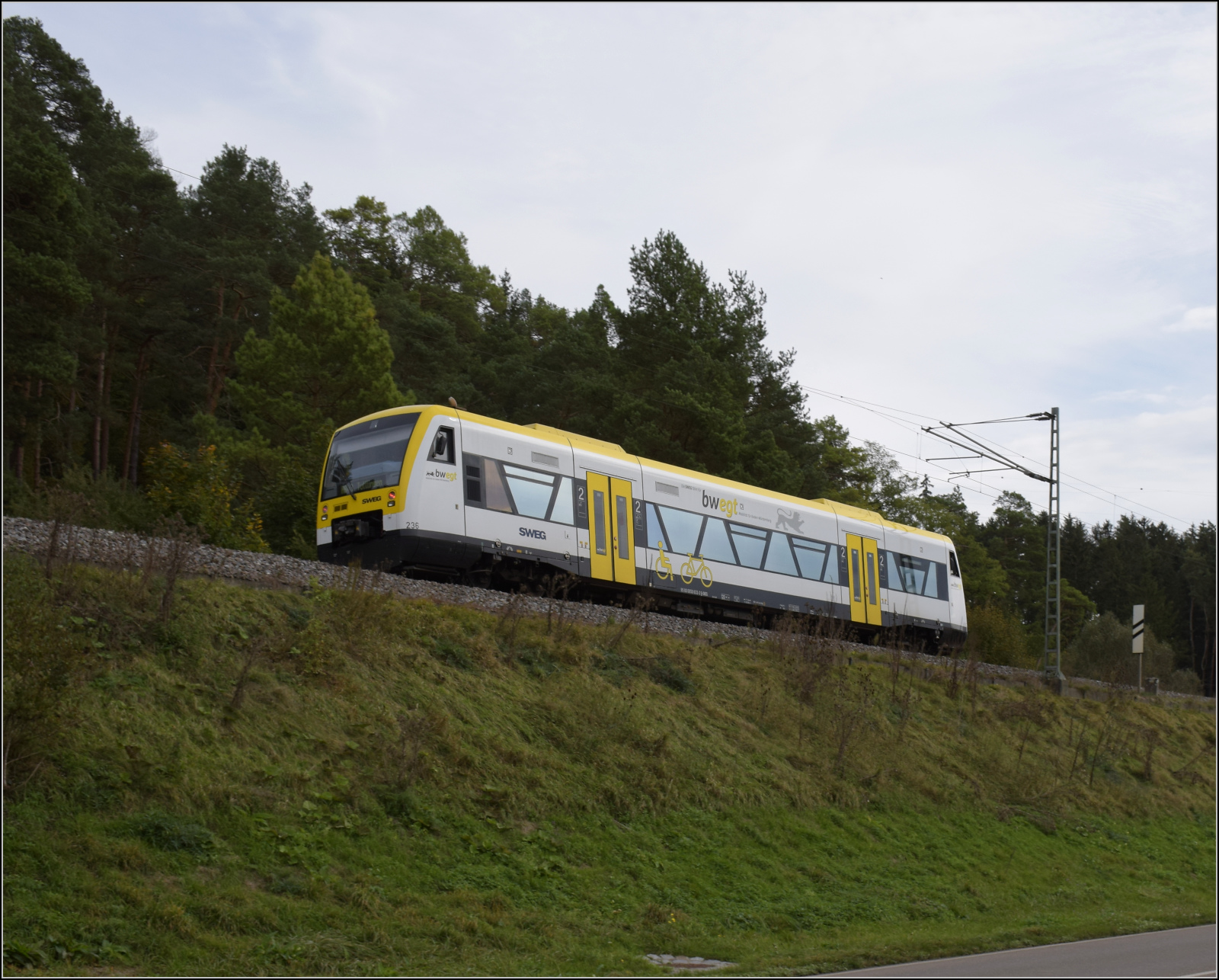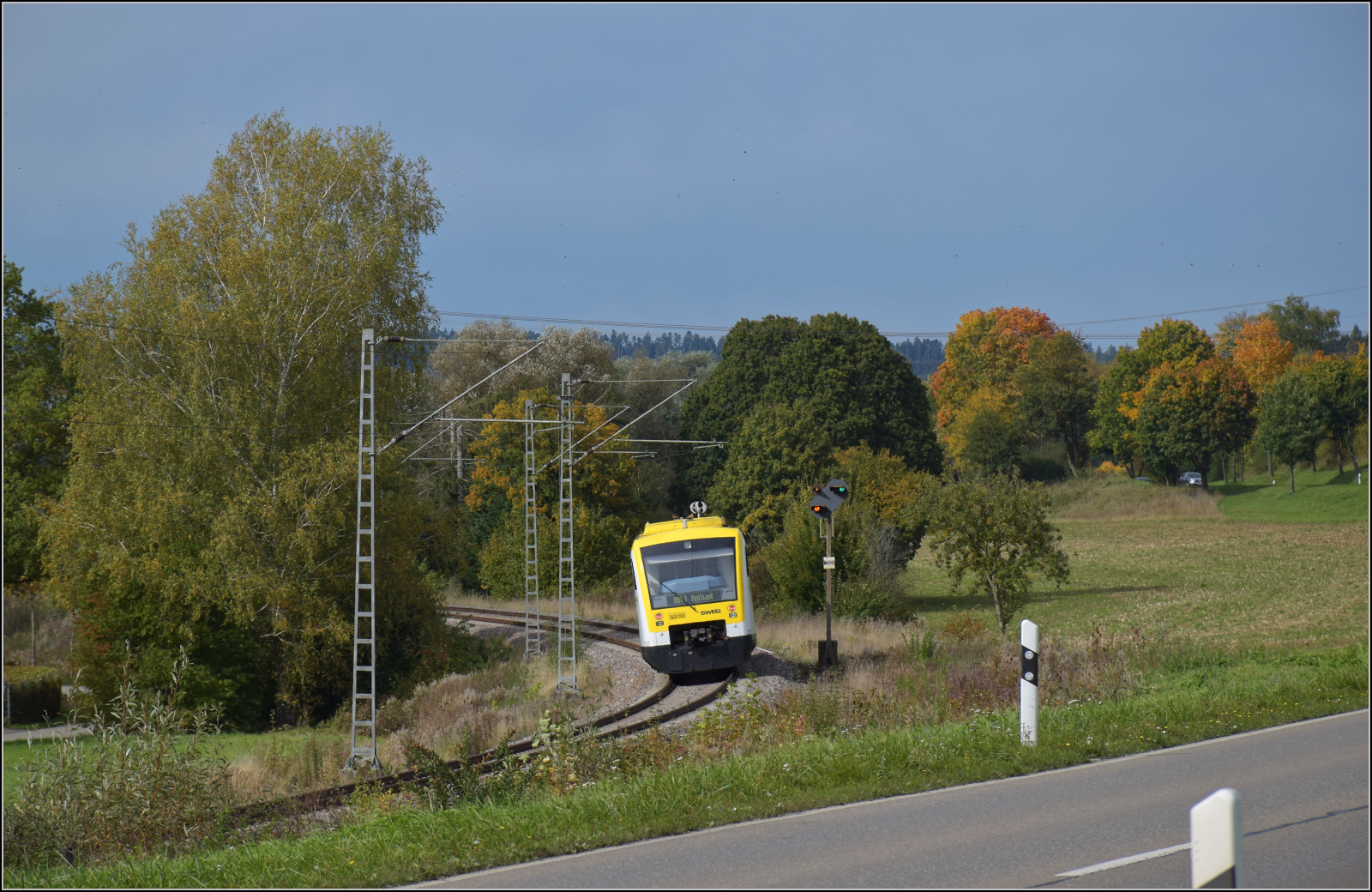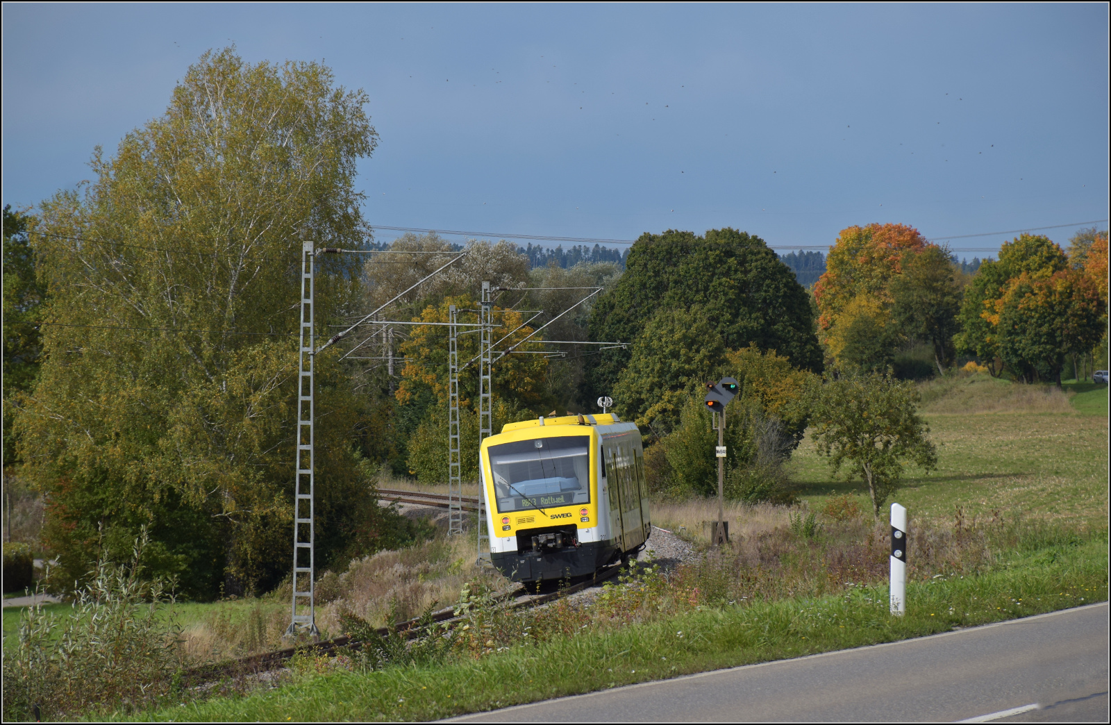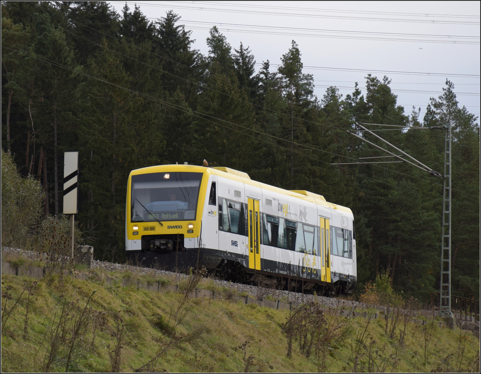 650 627, intern SWEG 231, dieselt fleissig unter Fahrdraht auf dem Weg nach Rottweil bei Spaichingen. Obwohl es mittlerweile problemlos möglich wäre, mit Akkuzügen zu fahren, macht NVBW bisher wenig Anstalten, das Manko zeitnah zu korrigieren. Oktober 2024. km0