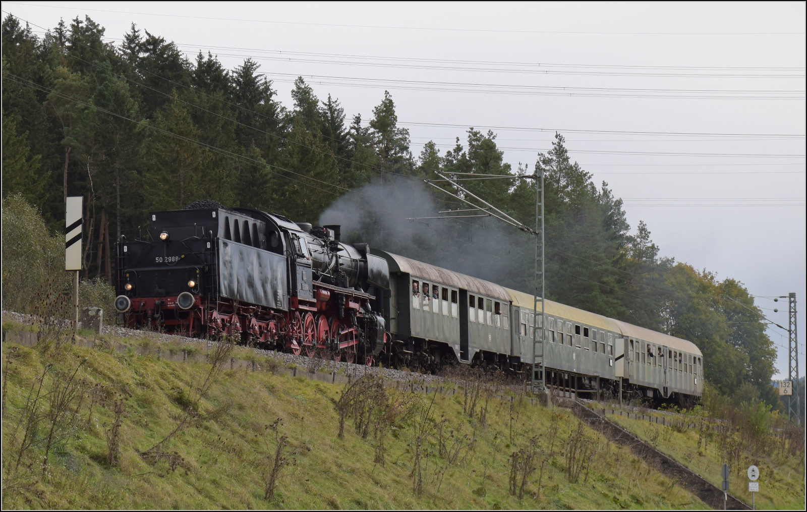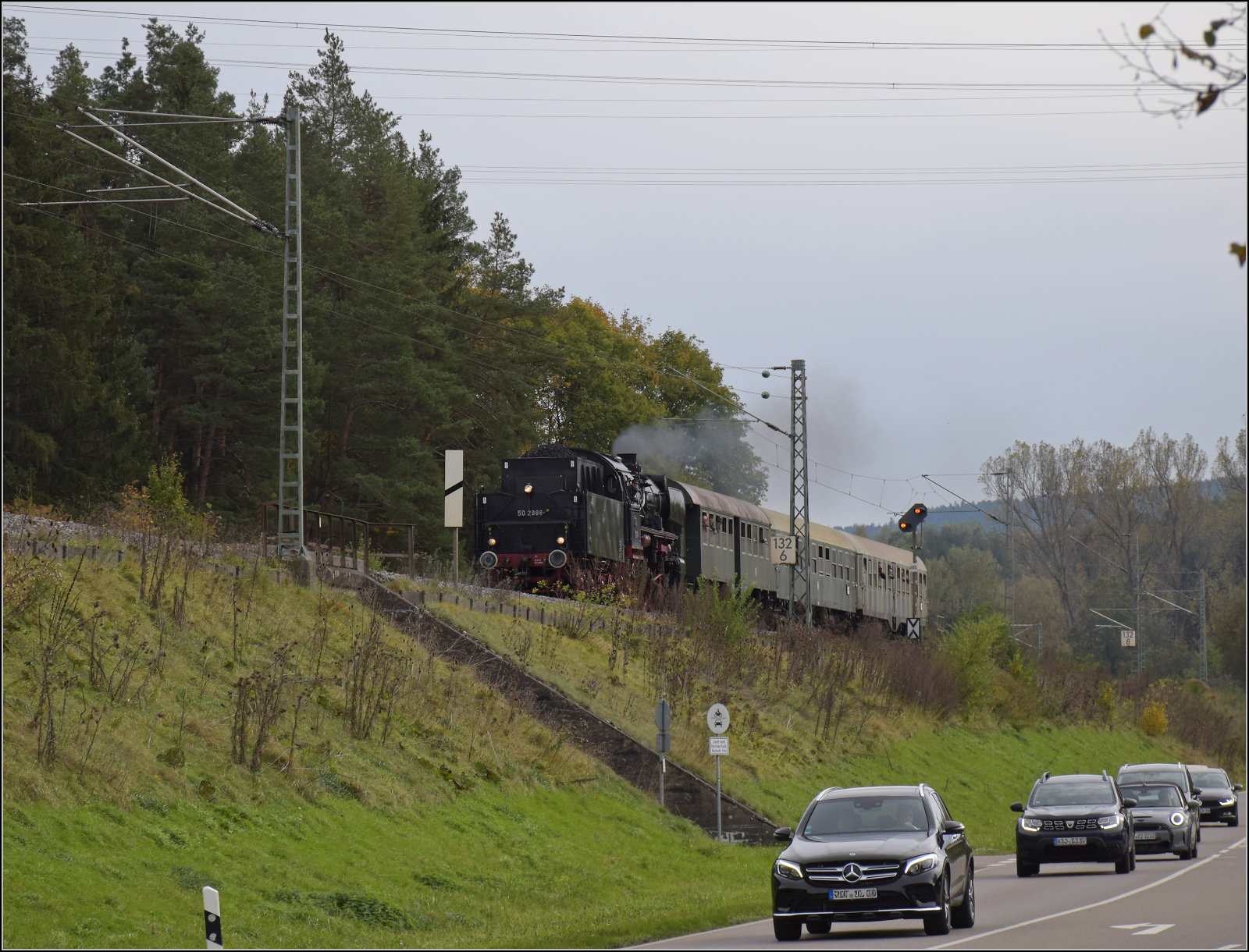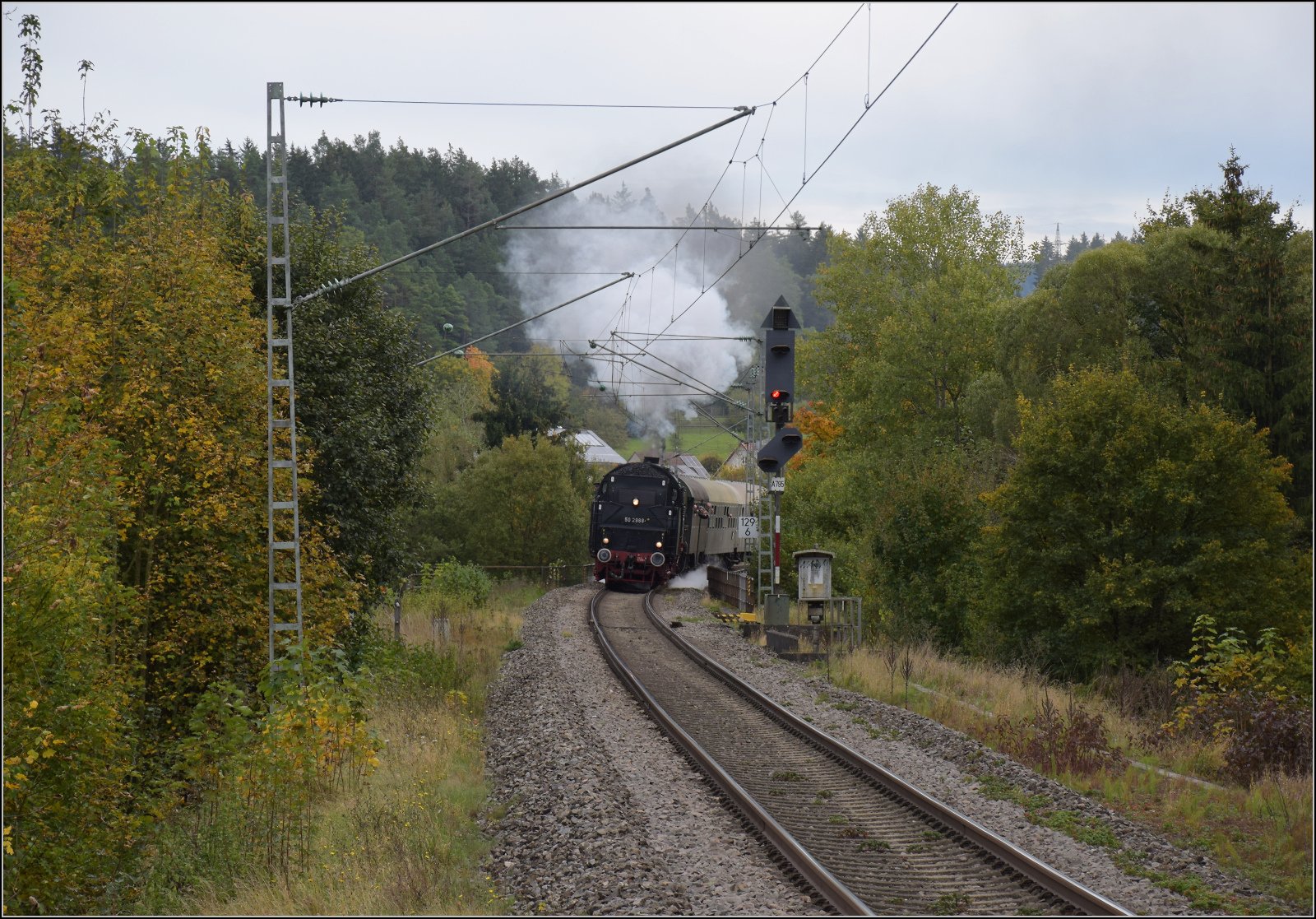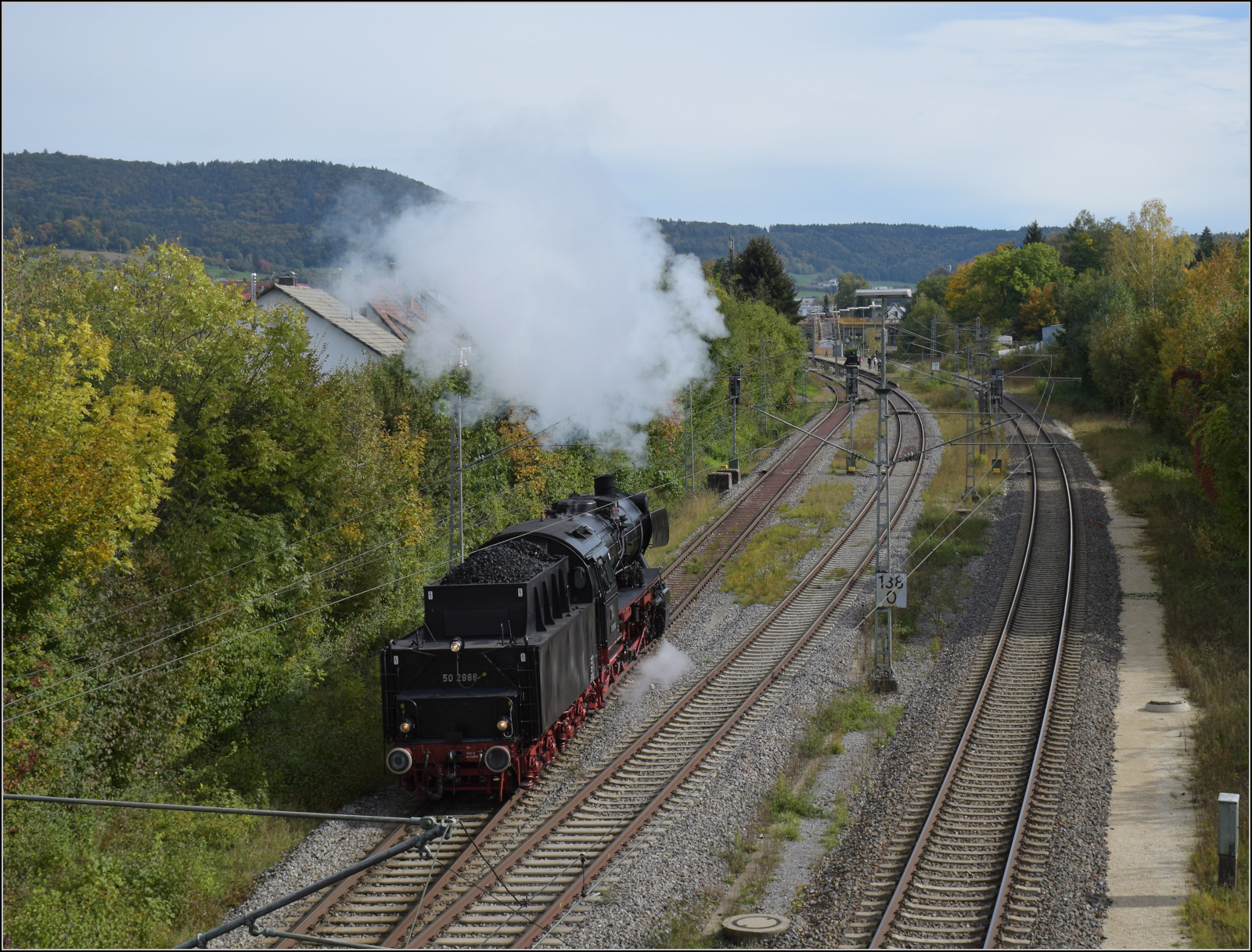 Zurück nach Rottweil geht es bergab, so hätte 50 2988 wenig zu tun, wären da nicht die zwei Kreuzungshalte in Aldingen und Neufra. In Neufra ist der Bahnsteig dichter ans Dorf gerutscht und ermöglicht einen guten Fotostandort, während 50 2988 bei abschüssiger Fahrt deutlich Dampf macht. Oktober 2024. km0