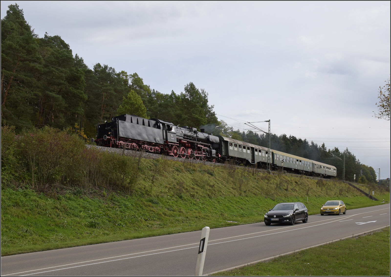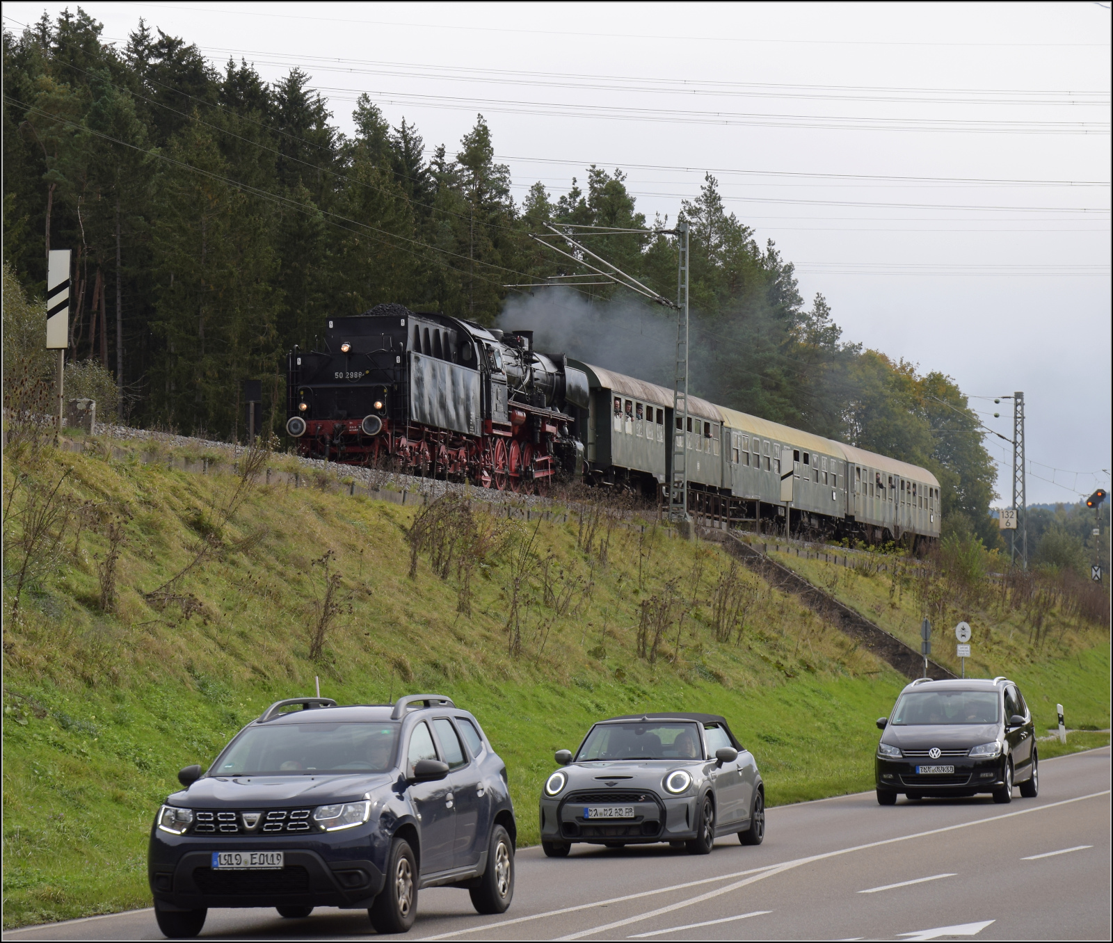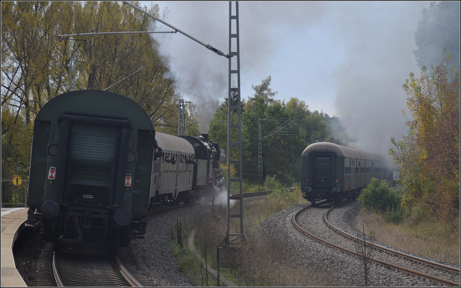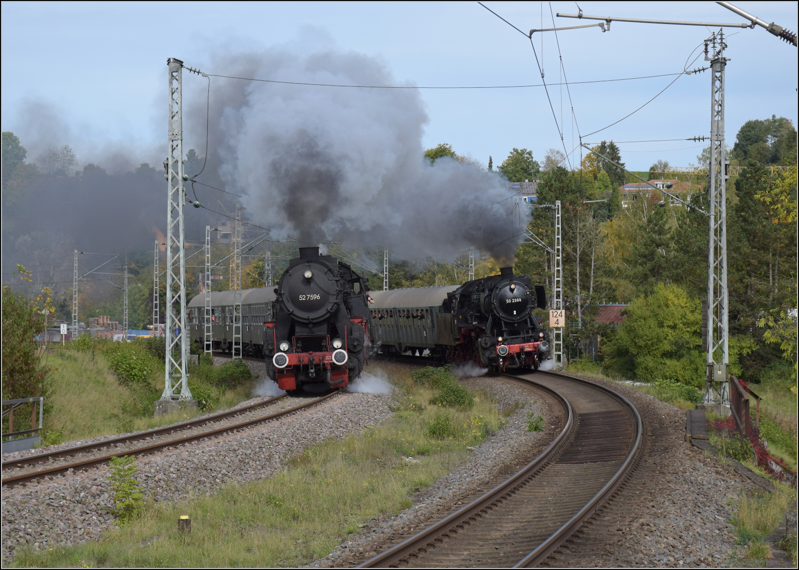 52 7596 und 50 2988 stellen die legendären Parallelausfahrten aus Rottweil mit Zügen nach Spaichingen und Schwenningen nach. Das ganze von hinten betrachtet. Das linke Zugende bildet ein vierachsiger Umbauwagen und das rechte Zugende ein luxemburgischer Wegmannwagen nach dem Silberlingschema. Oktober 2024. km0
