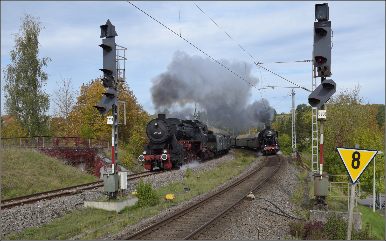 52 7596 und 50 2988 stellen die legendären Parallelausfahrten aus Rottweil mit Zügen nach Spaichingen und Schwenningen nach. Oktober 2024. km0
