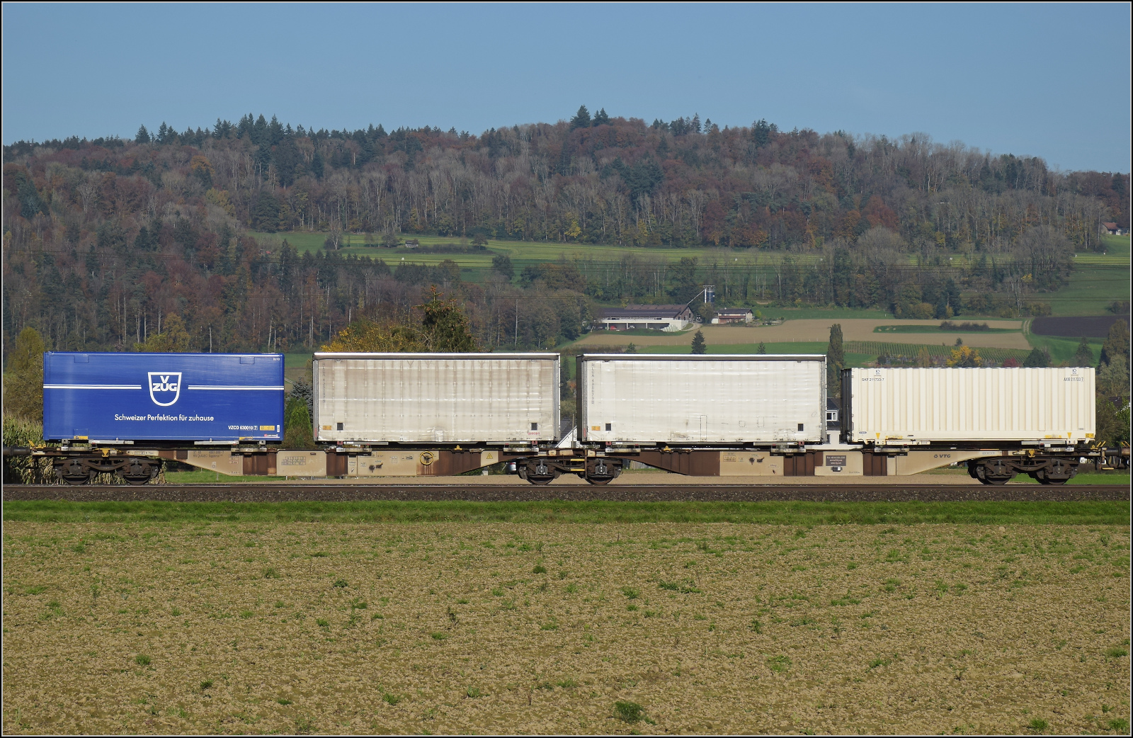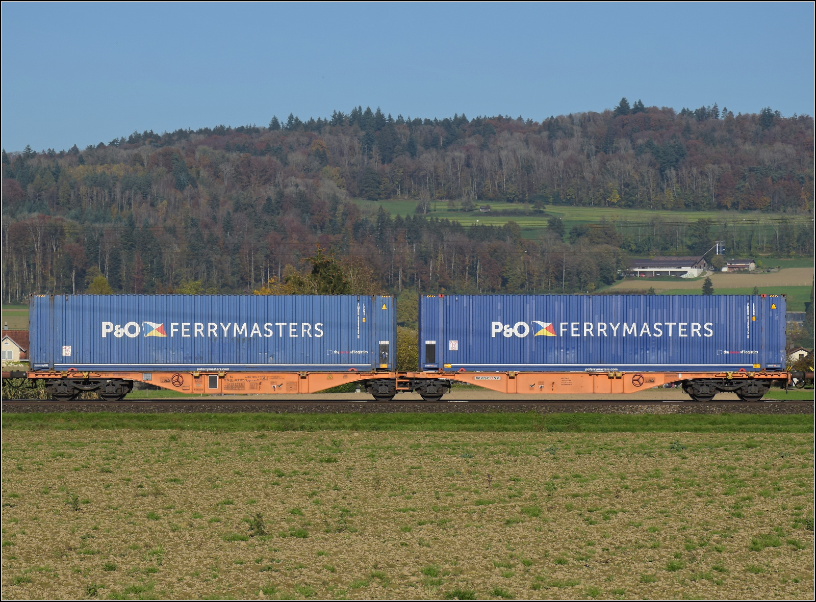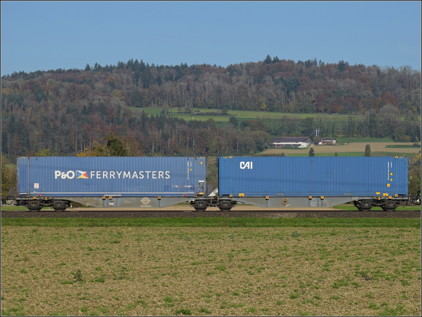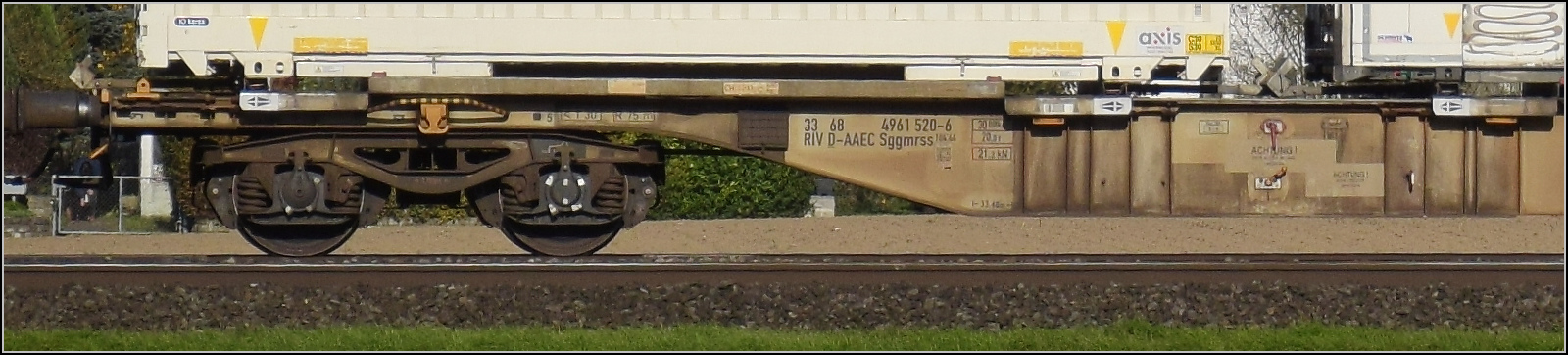 Moment: Containertragwagen 33 RIV 68 D-AAEC 4961 520-6 Sggmrss, in welches Land zum Henker sortier ich dieses Bild ein, Schweiz, Holland, Deutschland oder Afganistan? Hendschiken, November 2024. km0