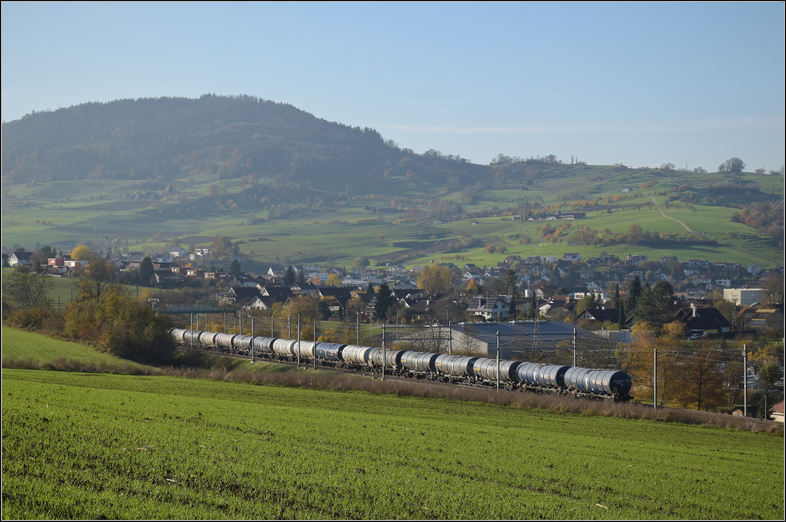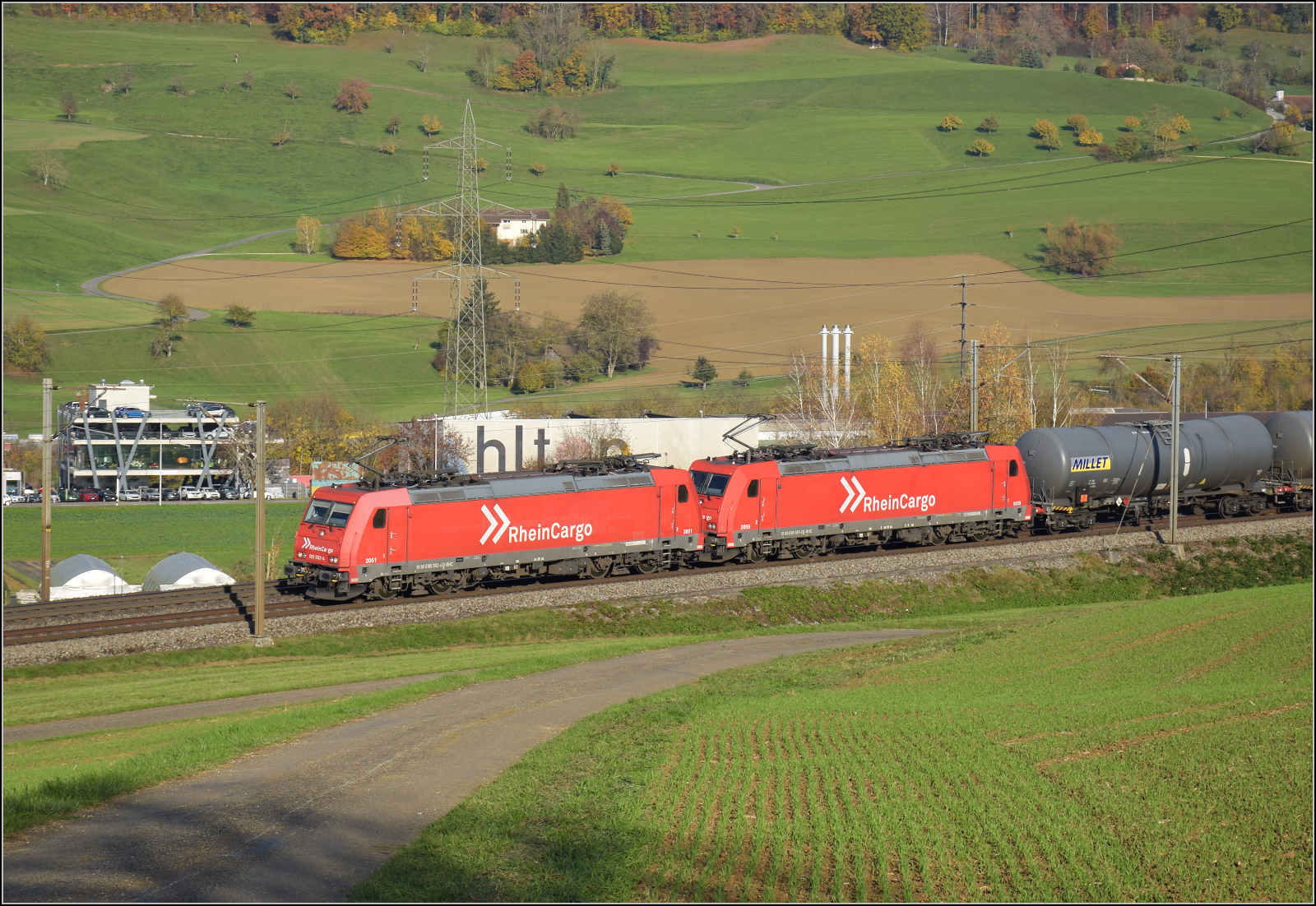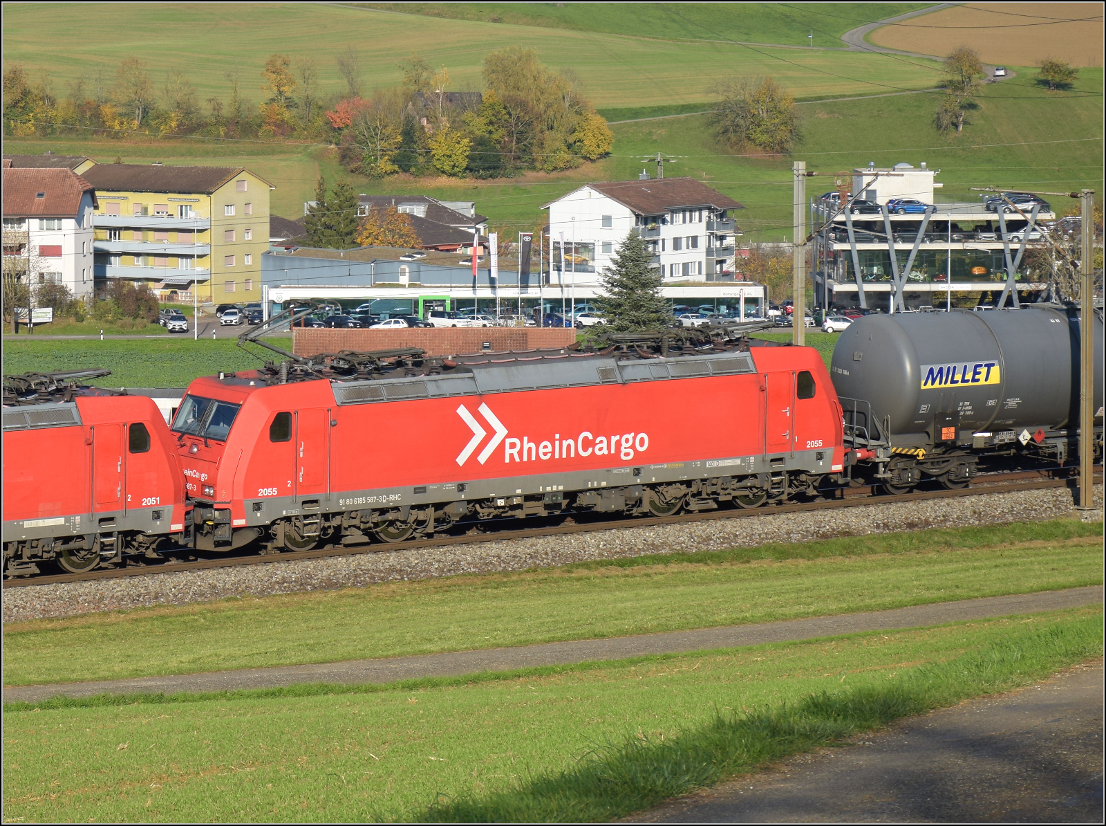 185 582 als Rheincargo 2051 und im Bild 185 587 als Rheincargo 2055 mit Kesselwagen auf dem Weg nach Basel. Frick, November 2024. km0