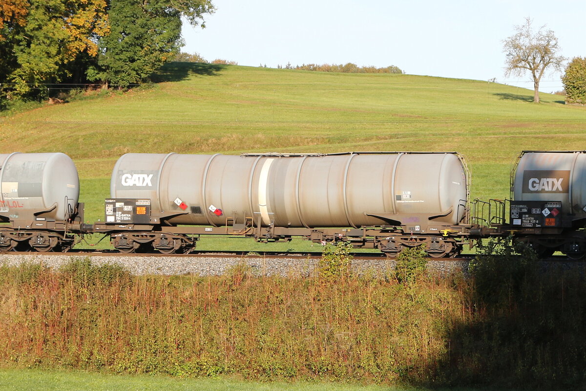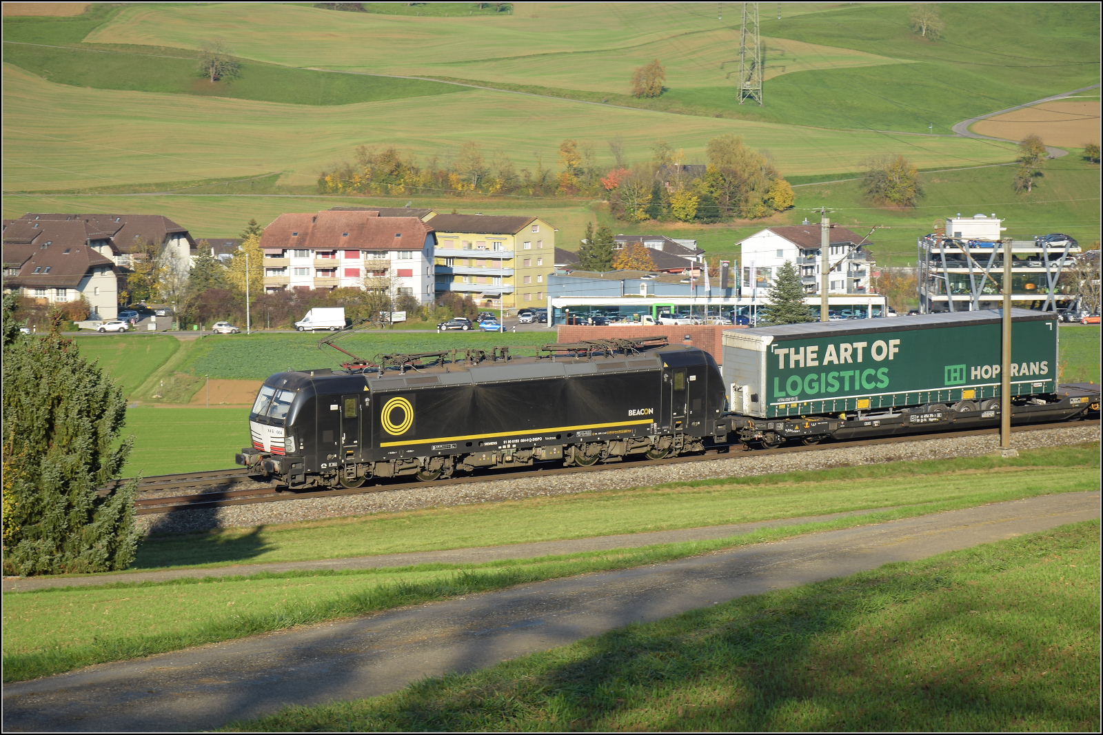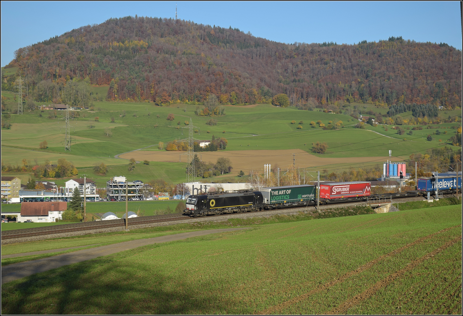 185 582 als Rheincargo 2051 und im Bild 185 587 als Rheincargo 2055 mit Kesselwagen auf dem Weg nach Basel. Frick, November 2024. km0