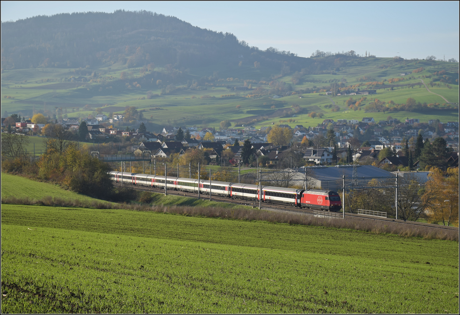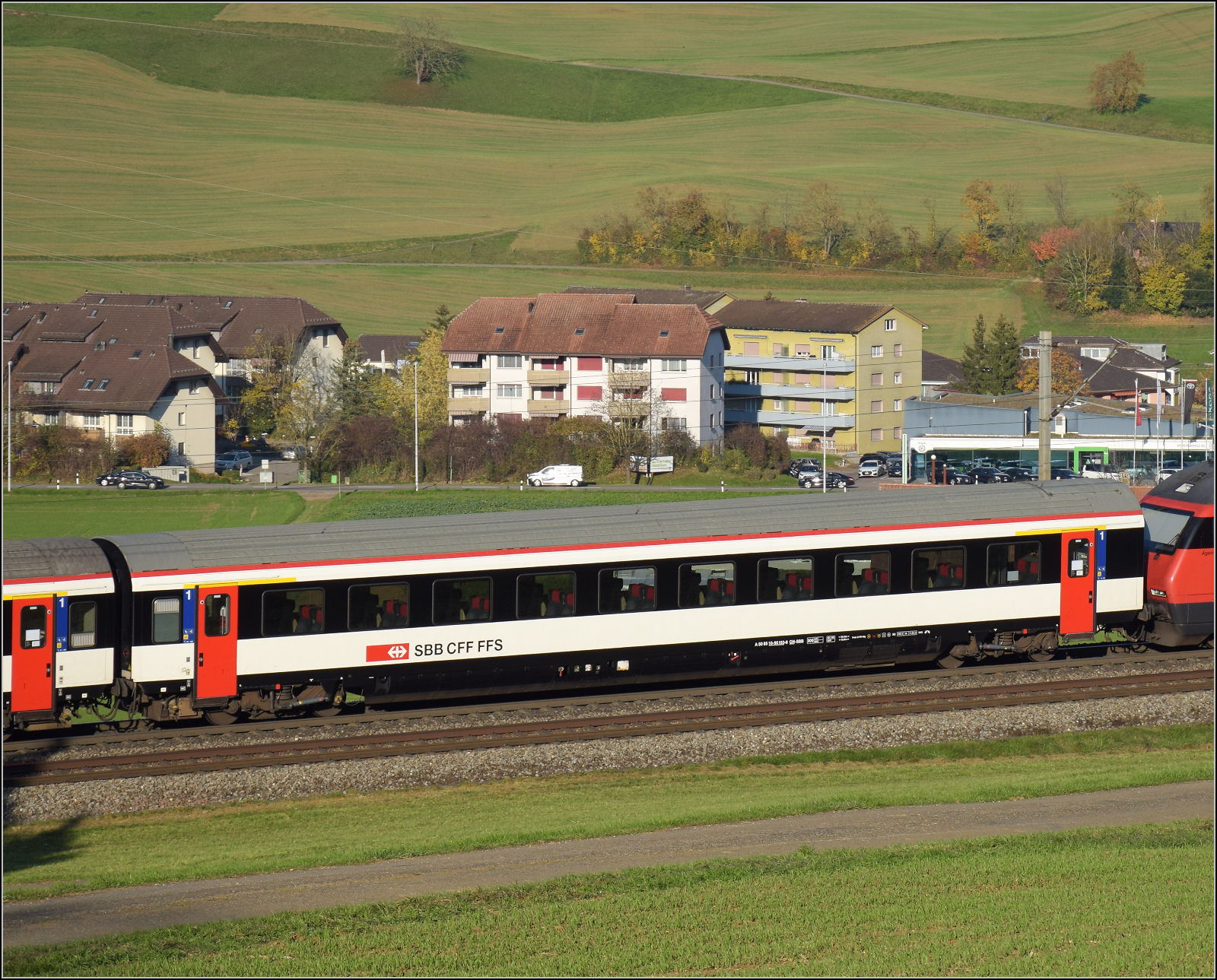 Wagen des IR nach Zürich mit Zuglok Re 460 086 'Ägerisee'. Im Bild der Erstklass-EW IV-Wagen A 50 85 10-95 218-9 CH-SBB im Neulack. Frick, November 2024. km0