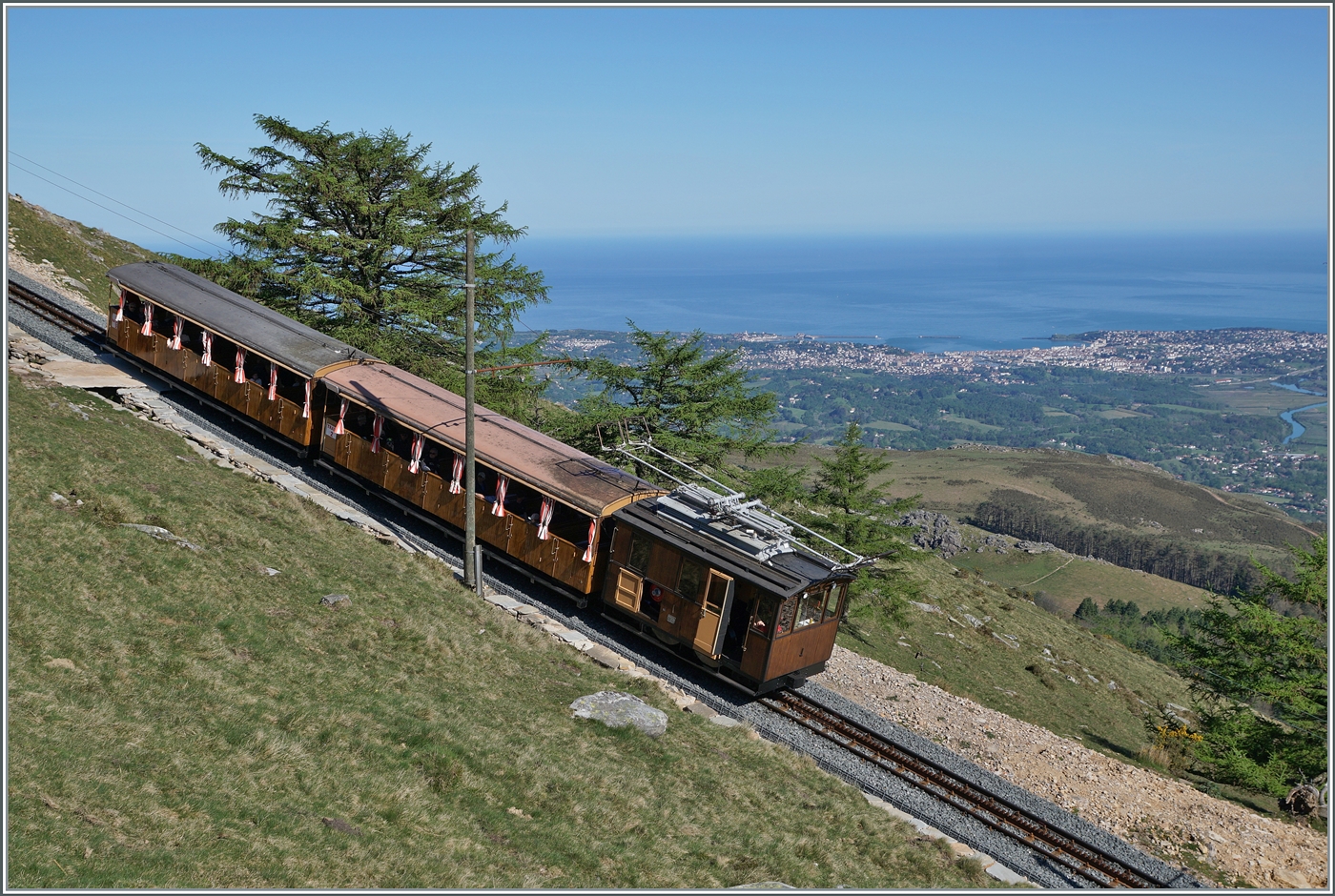 Kurz nach der Gipfelstation La Rhume (905 müM) ist die 1914 von der SLM/BBC gebaute Chemin der fer de la Rhune He 2/2 mit Vmax 9 km/h mit ihrem ersten Zug des Tages auf der Fahrt ins "Tal", wobei mit "Talstation" der Passübergang Col de Saint-Ignace auf 198 müM gemeint ist. Im Hintergrund gleitet Blick über den mächtigen Atlantik sowie die beiden Orte Ciboure und Saint-Jean-de-Luz. 12. April 2024 Stefan Wohlfahrt