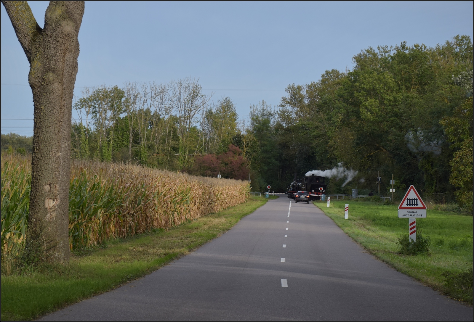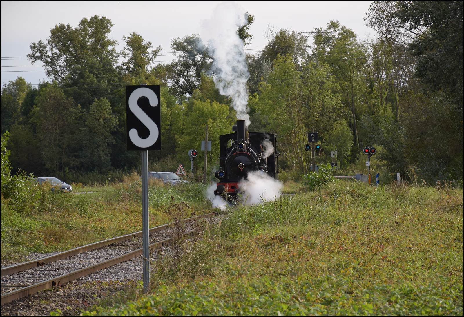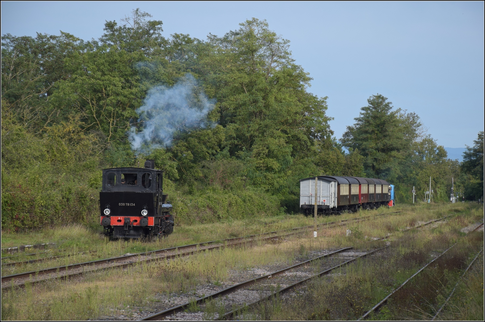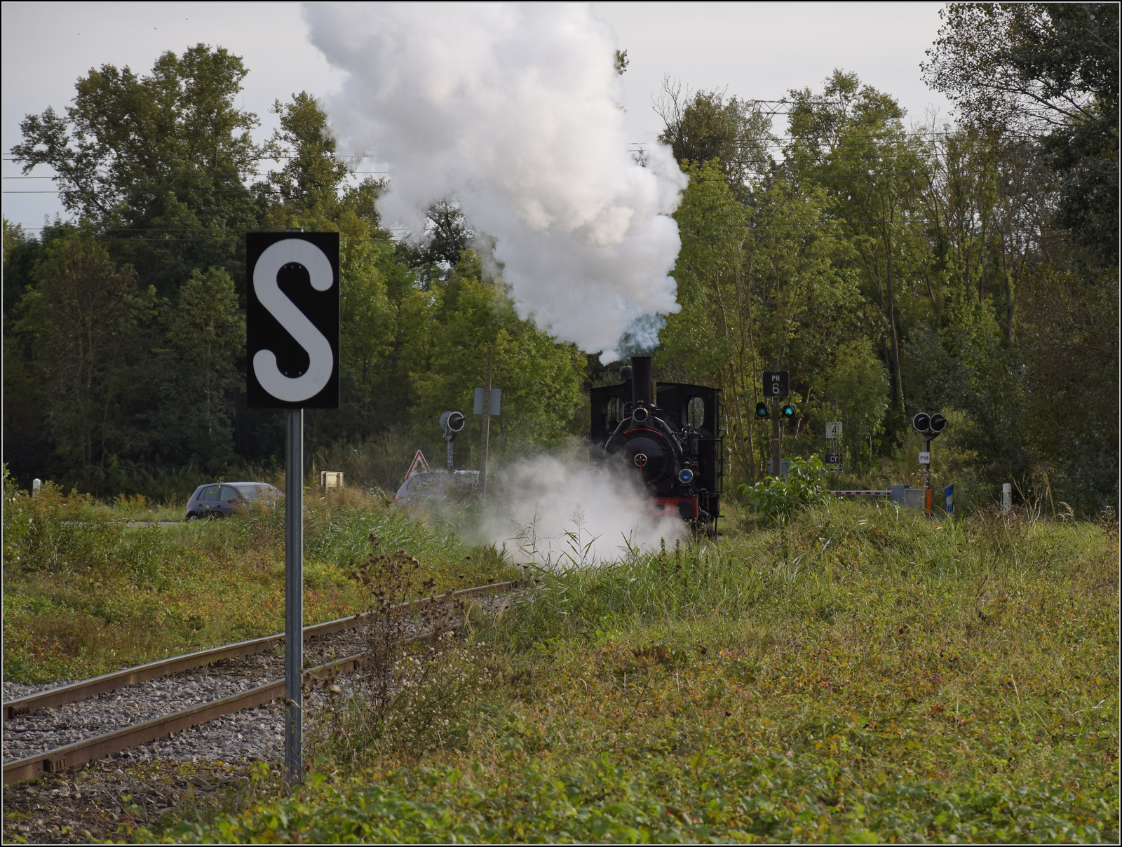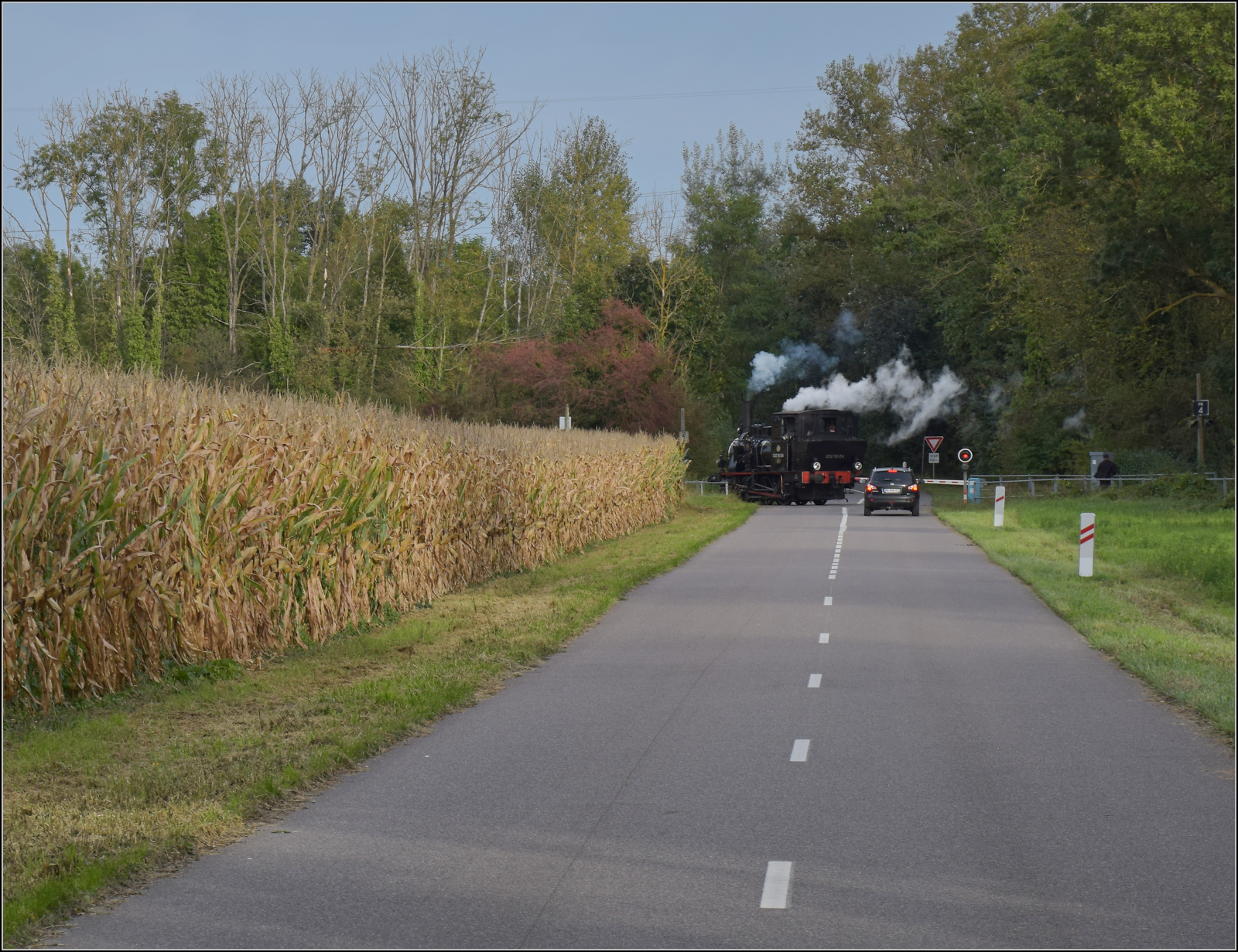 030 TB 134 "Theodor" am Bahnübergang nahe des Abzweigs von der ehemaligen Colmarer/Breisacher-Bahn. Volgelsheim, September 2024. km0