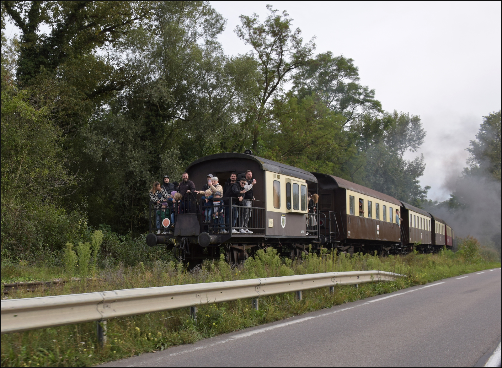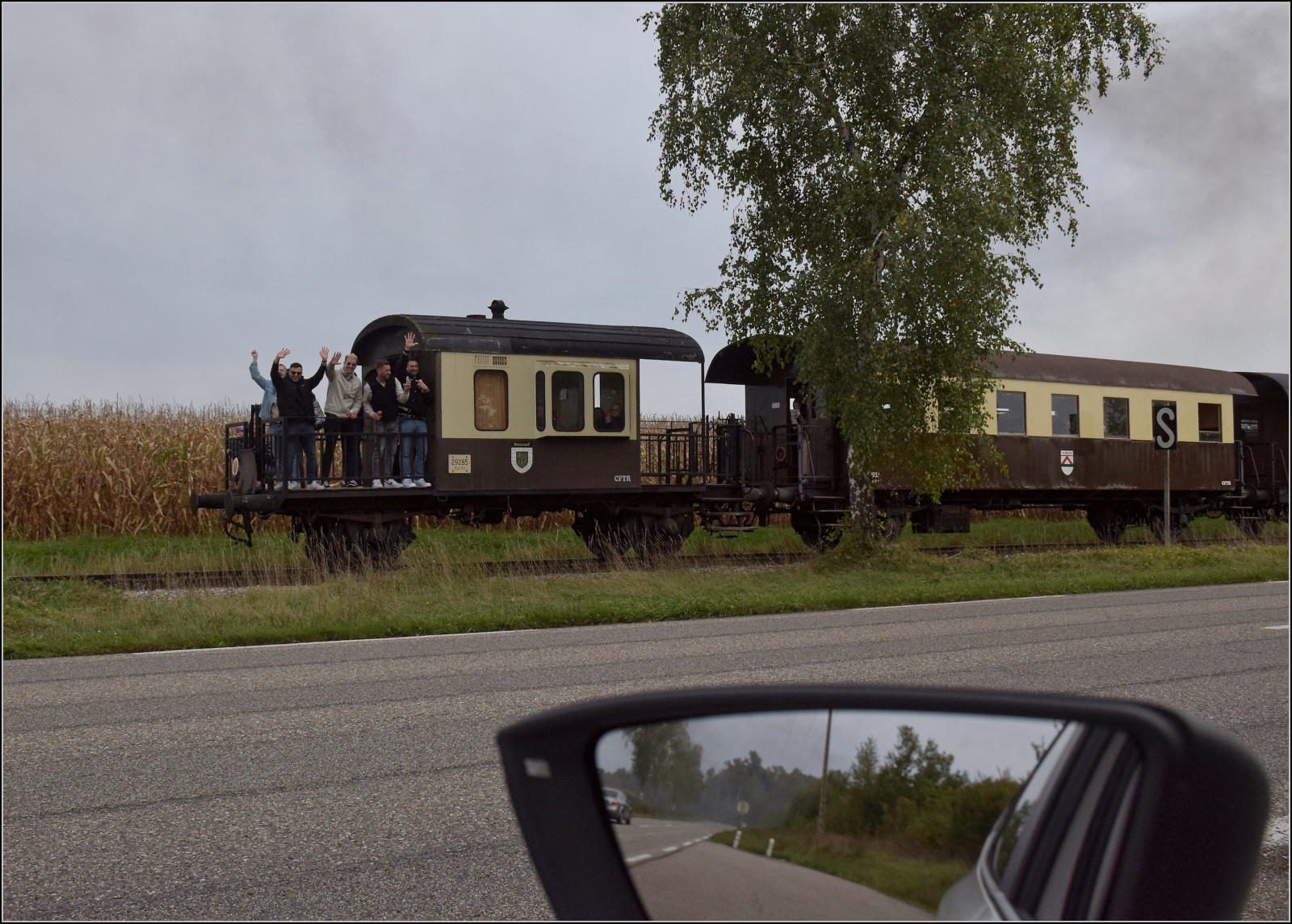 Gute Stimmung auf der Plattform des SBB-Sputnik-Güterzugbegleitwagens "Metzeral" im Gewann Saulaegerlopf auf der Gemarkung Kunheim. September 2024. km0