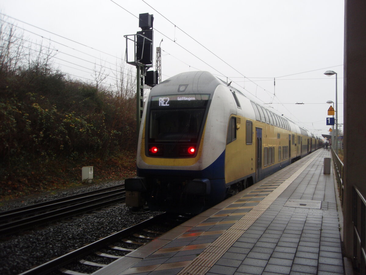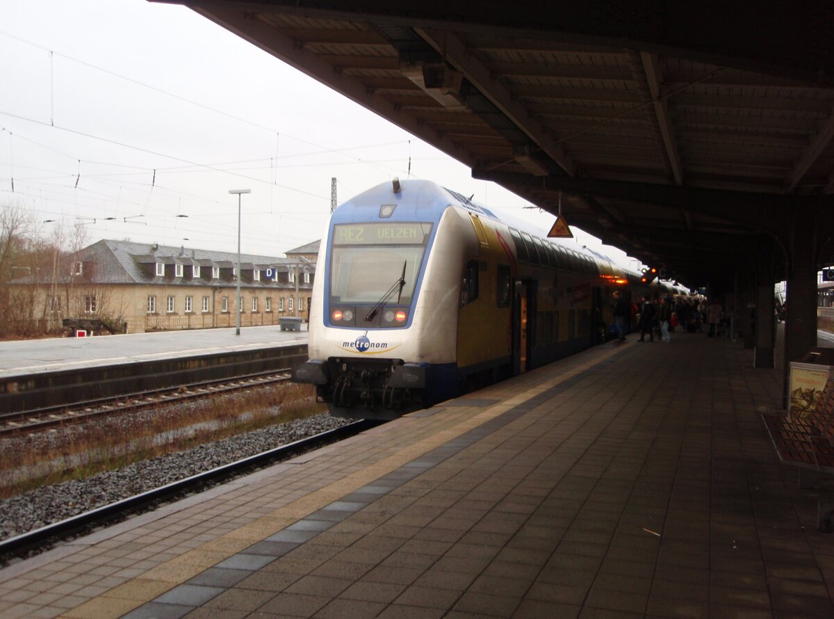 Ein Doppelstock Steuerwagen der metronom Eisenbahngesellschaft als RE 2 nach Uelzen in Göttingen. 06.12.2024