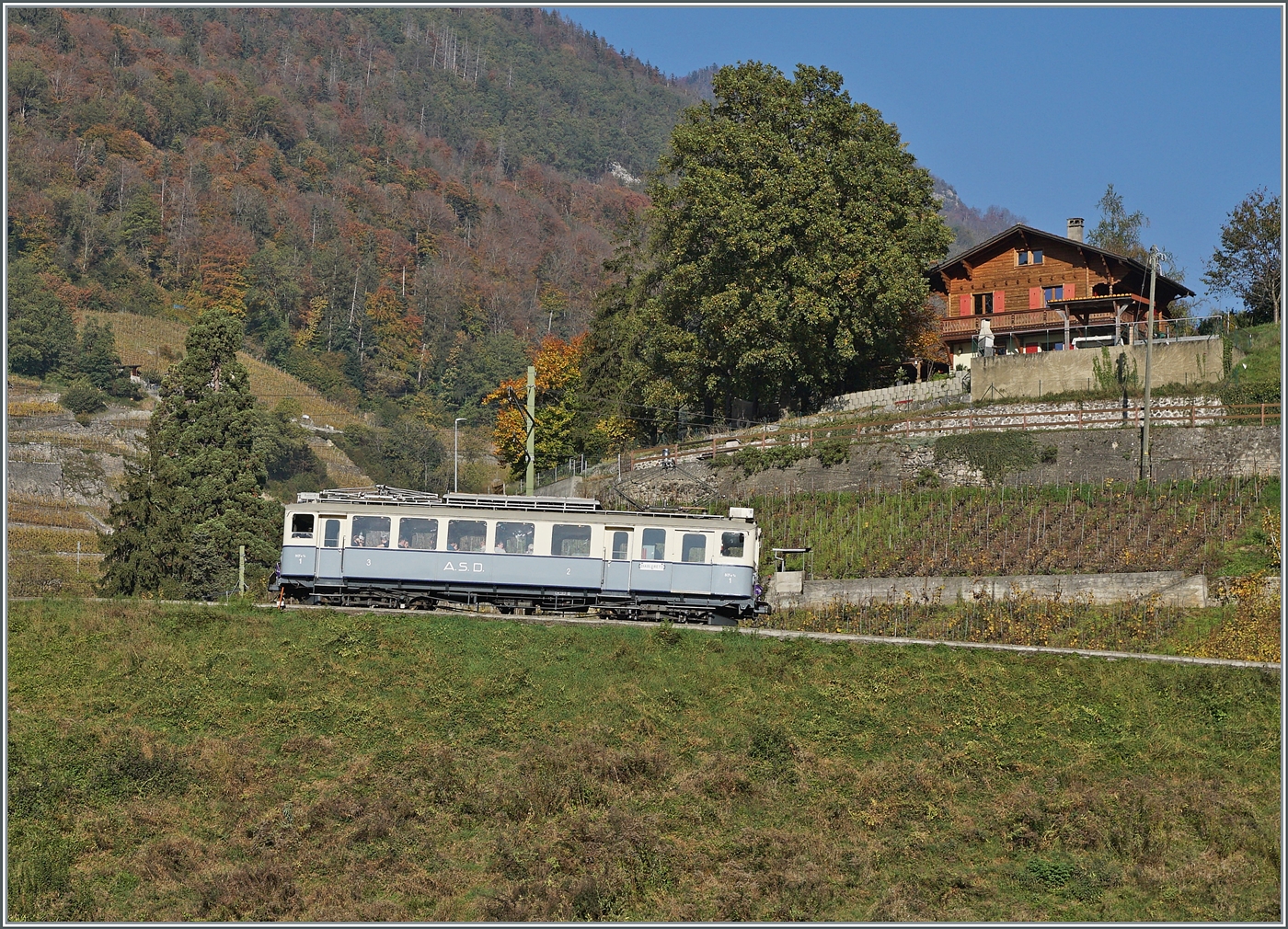 Am 2. November lud die "Association ASD 1914" mit ihrem ASD BCFe 4/4 N° 1 "TransOrmonan" zu einer Jass-Fahrt ein. Das Bild zeigt den "Association ASD 1914" ASD BCFe 4/4 N° 1 "TransOrmonan" oberhalb des Château d'Aigle auf der Fahrt in Richtung Les Diablerets.