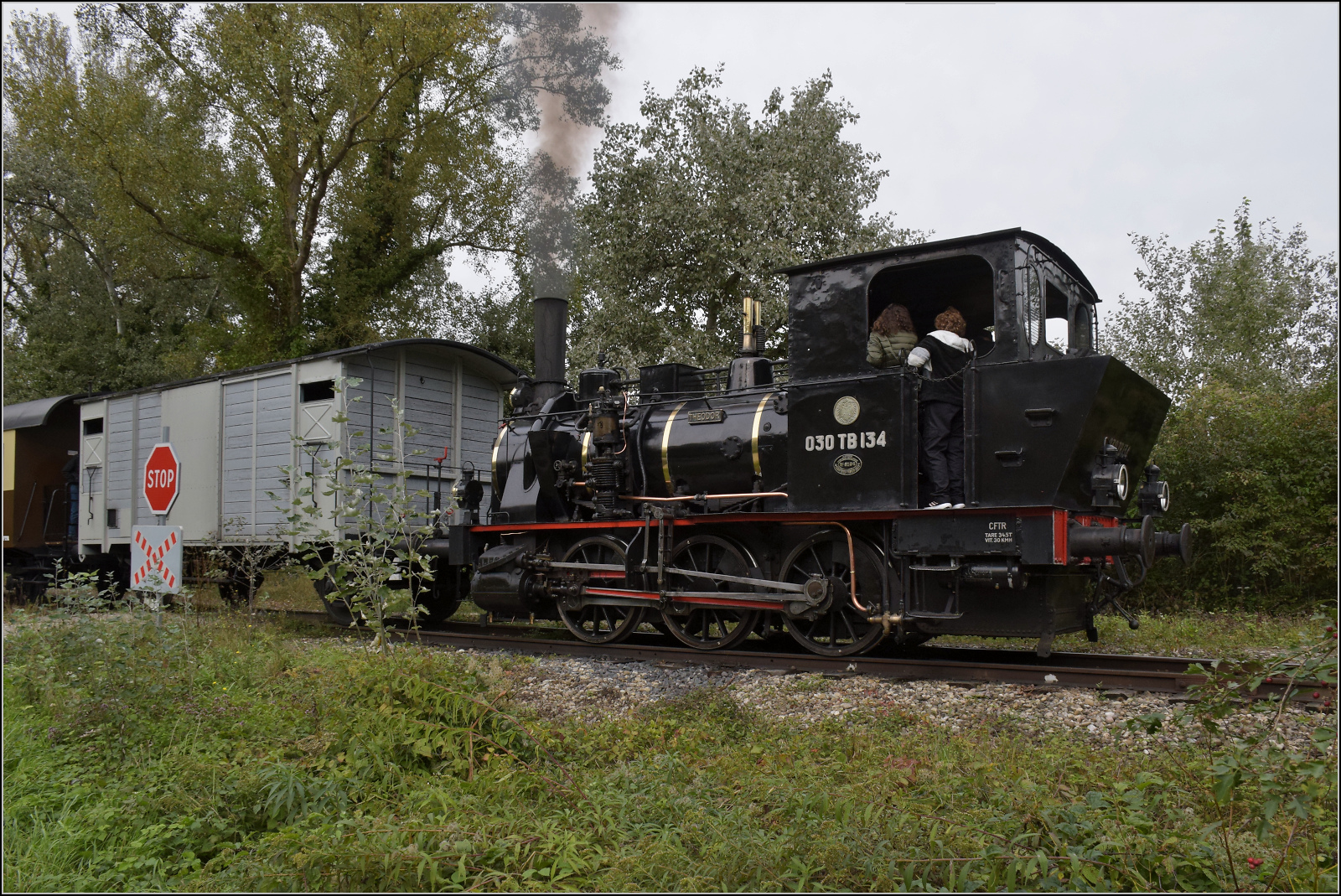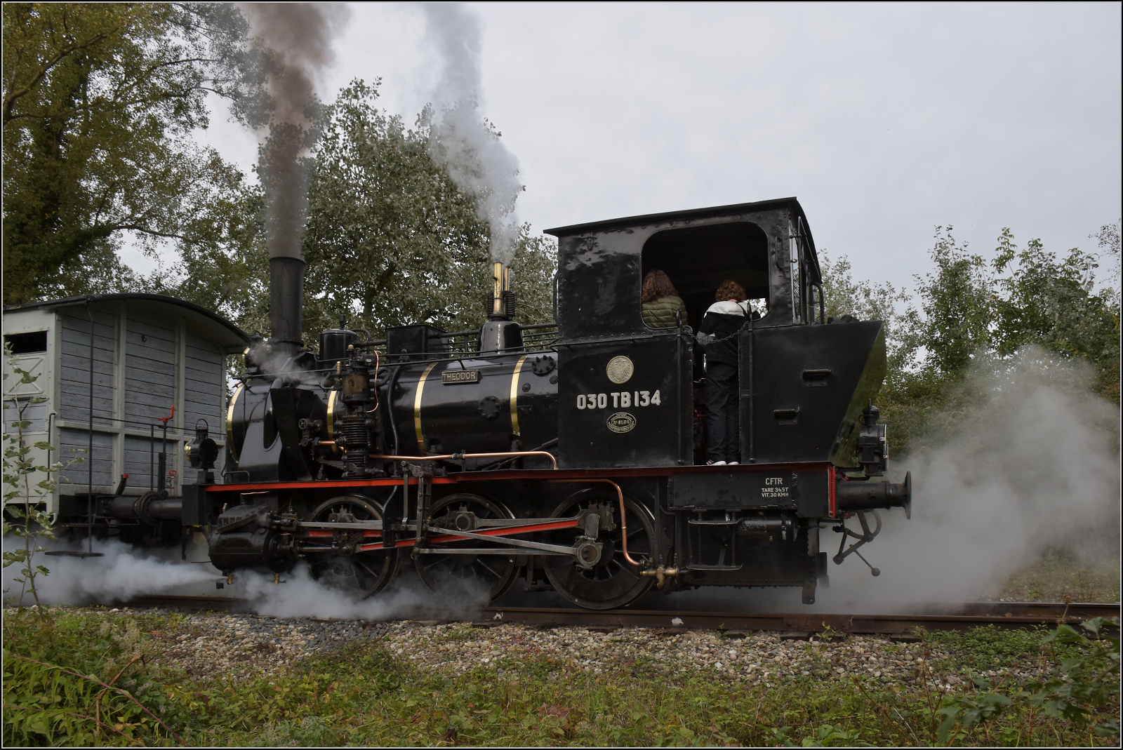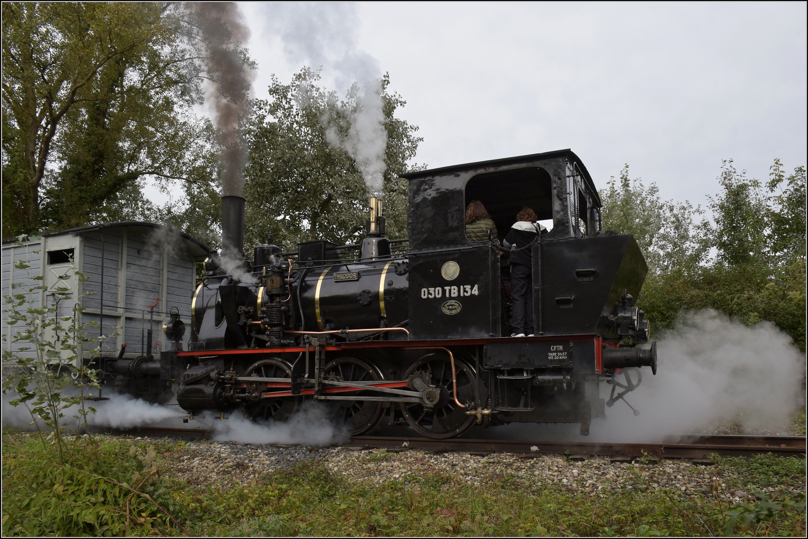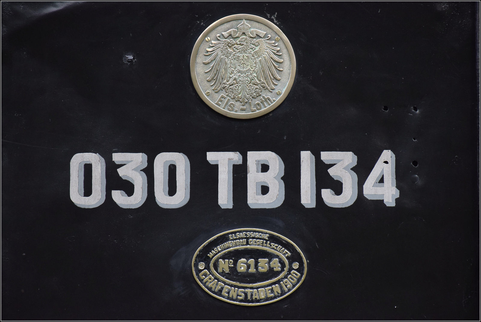 030 TB 134 "Theodor" mit Fabrikschild der Elsässischen Maschinenbaugesellschaft № 6134, Grafenstaden 1900 und dem historischen Wappen von Elsass-Lothringen. Haltestelle Sans-Souci Artzenheim. September 2024. km0