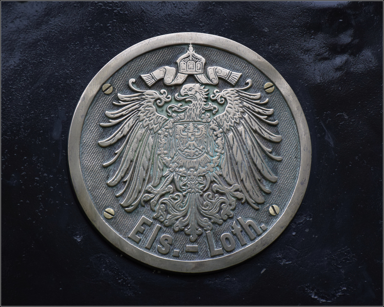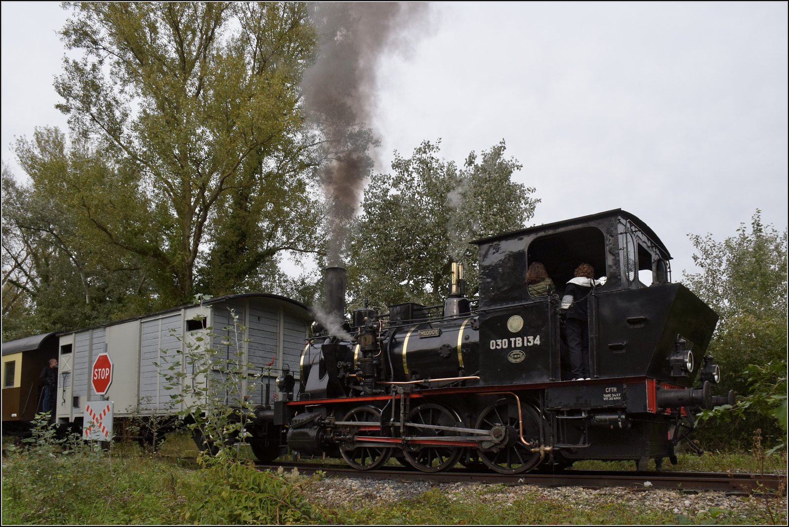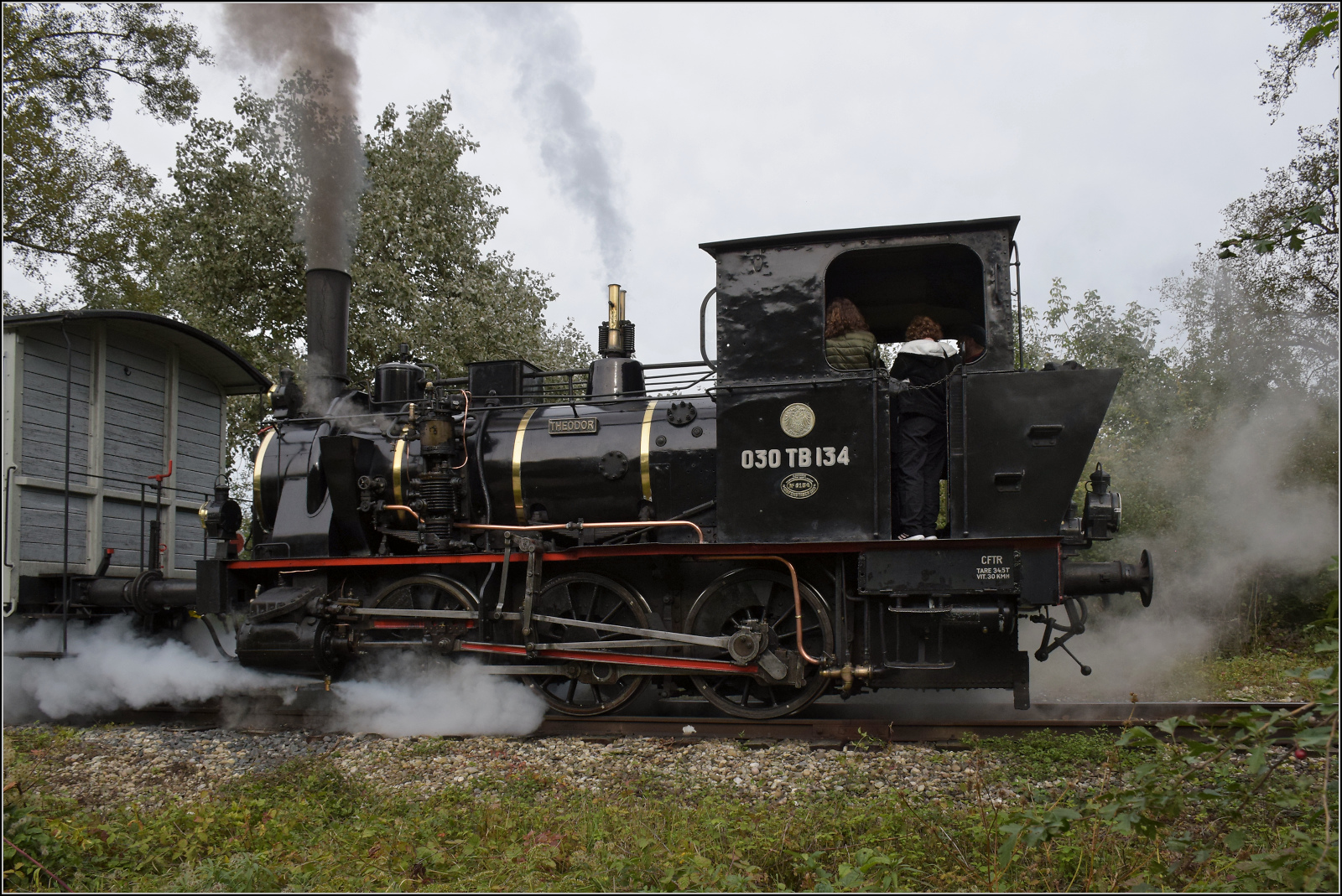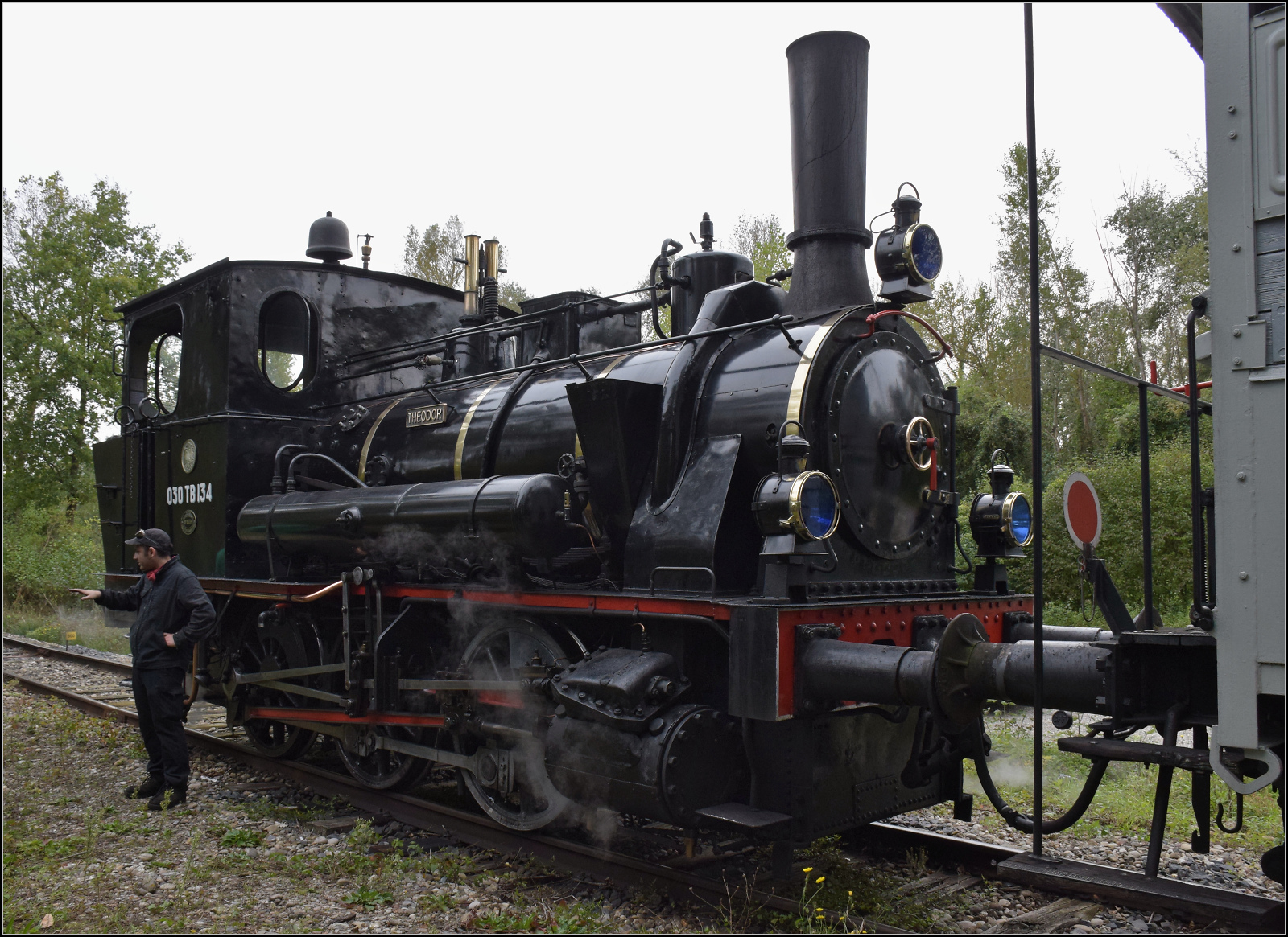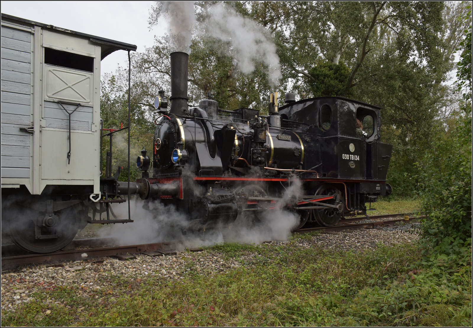 030 TB 134 "Theodor" mit Fabrikschild der Elsässischen Maschinenbaugesellschaft № 6134, Grafenstaden 1900 und dem historischen Wappen von Elsass-Lothringen. Haltestelle Sans-Souci Artzenheim. September 2024. km0