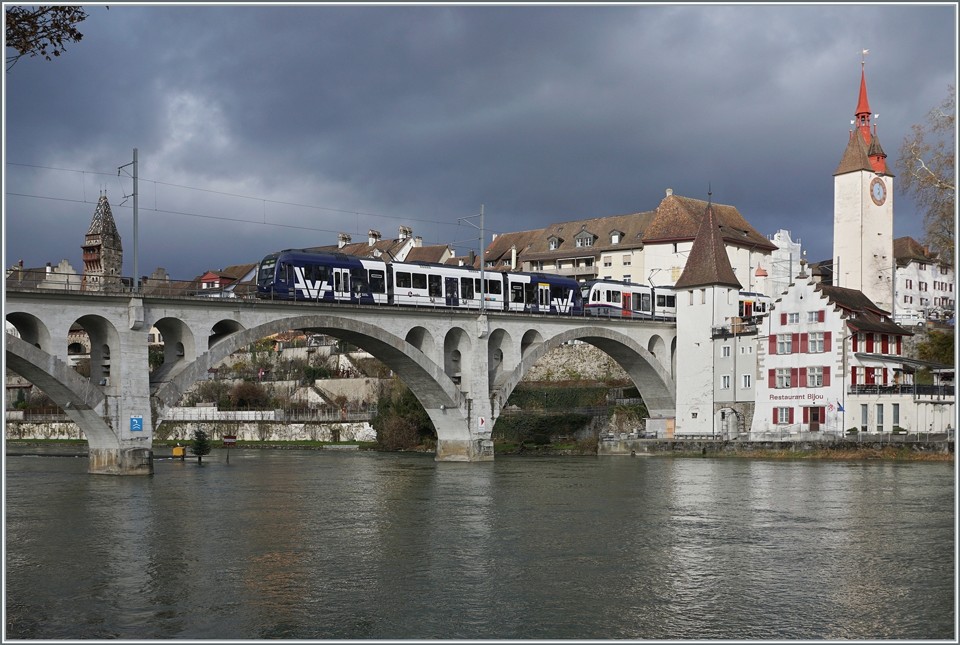 Zwei AVA BDWM ABe 4/8 "Diamant" in unterschiedlicher Farbgebung sind als S17 kurz nach der (während des Weihnachtsmarktes nicht bedienten Haltestelle) Bremgarten Obertor bei geradezu dramatischen Lichtverhältnissen auf der Fahrt von Dietikon nach Wohlen und überqueren dabei die fotogene 156 Meter lange Reussbrücke.