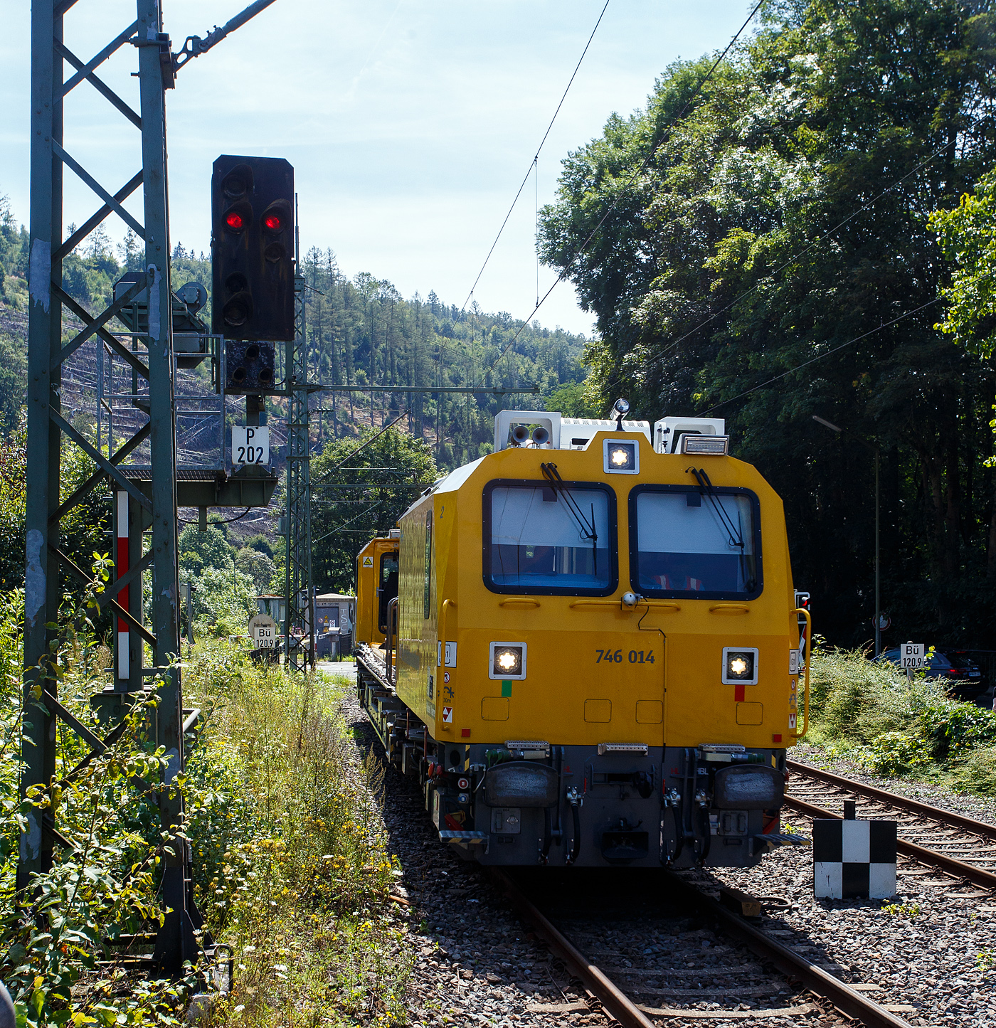Das Gleisarbeitsfahrzeug „Hummel“ 746 014 (99 80 9110 014-4 D-DB), ein neues Plasser & Theurer GAF (auf MISS-Plattform) der DB Netz AG (Netz Instandhaltung) fährt am 06.August 2024 durch Kirchen/Sieg in Richtung Siegen.