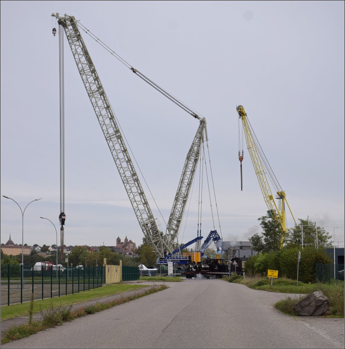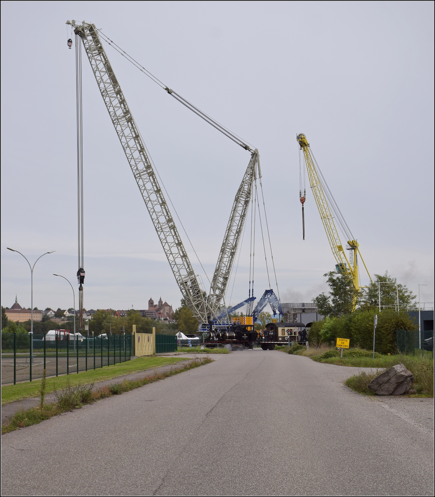 Aber das Münster darf in diesem Bild mit dem Barwagen doch noch vor dem Kran-Monster zur Geltung kommen. Volgelsheim, September 2024 km0