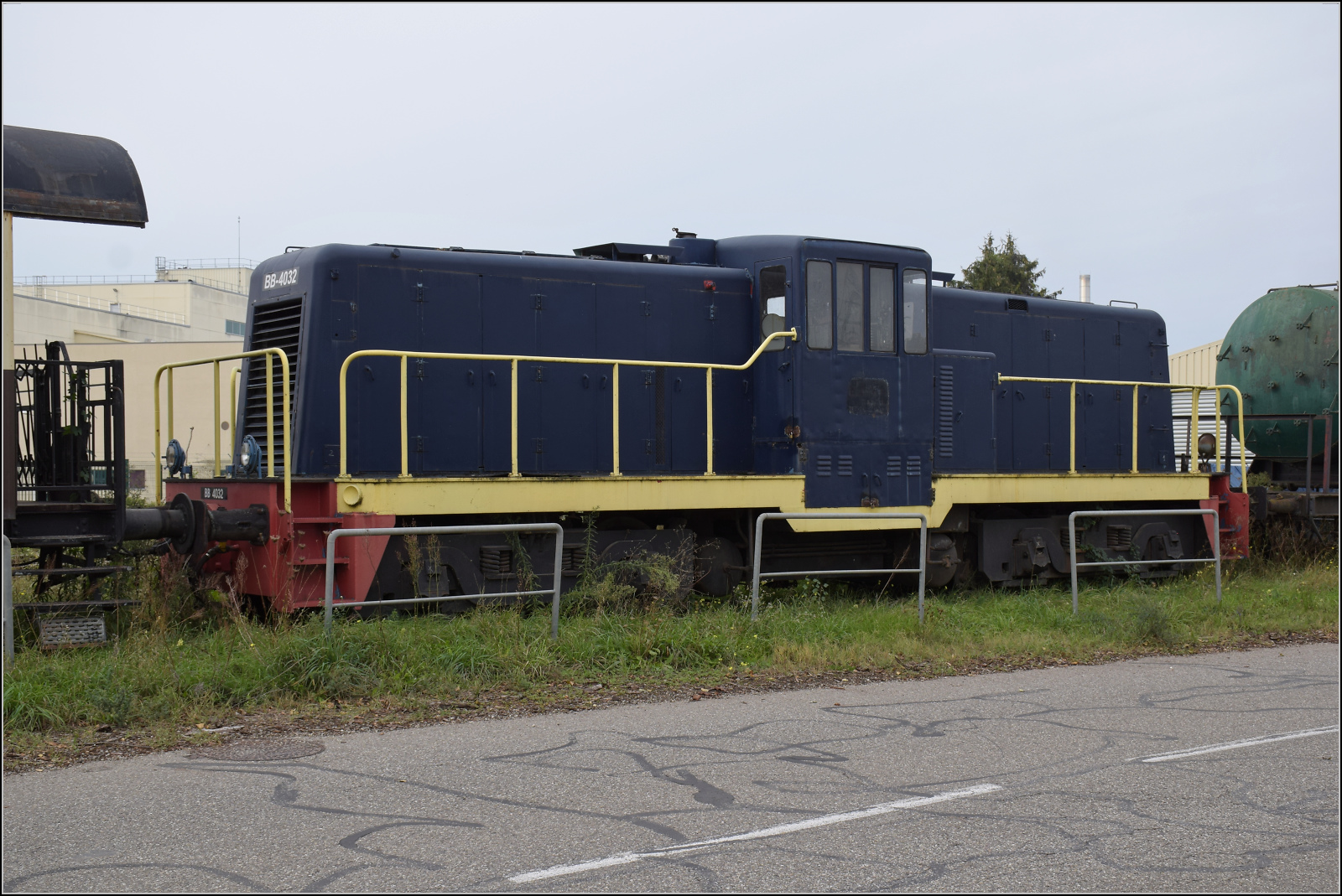 Geschützt von blauem Lack verbleibt die Amerikanerin 80-ton-Drop-Cab-Lok von GE, Lok BB 4032, Baujahr 1944 bei der CFTR. Diese Lok wurde vom US-Army transportation corps in Frankreich genutzt und verblieb später ebendort. Volgelsheim, April 2019. km0