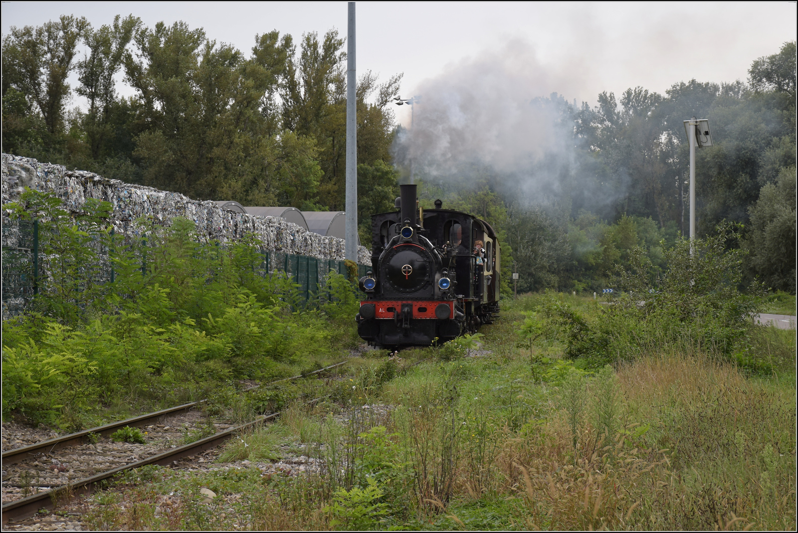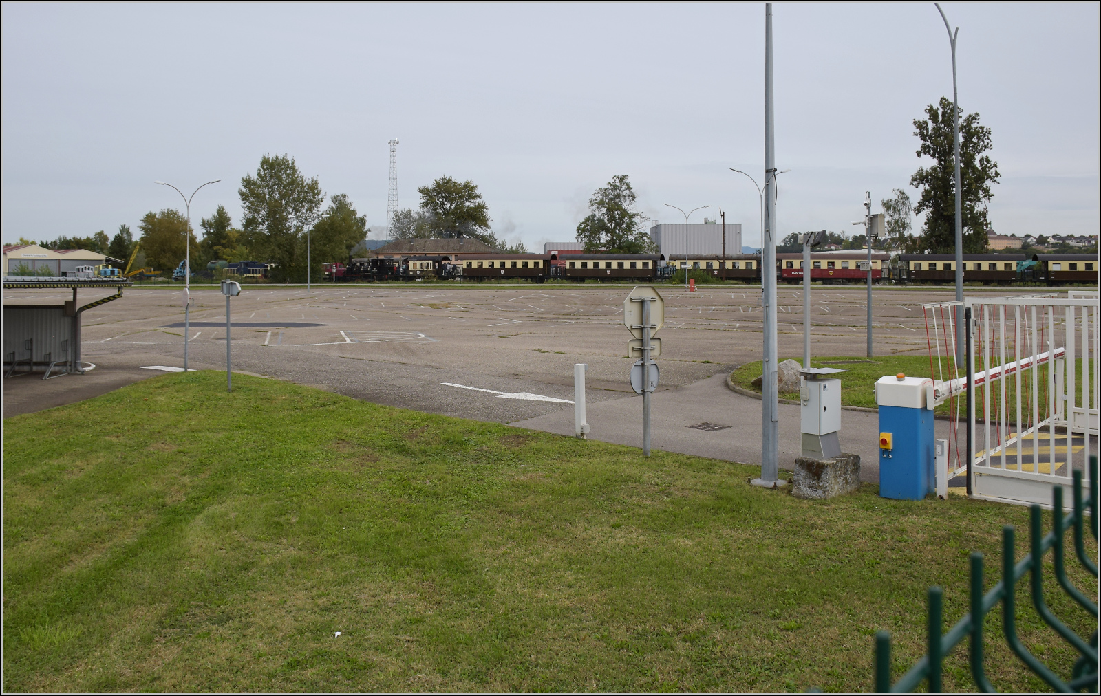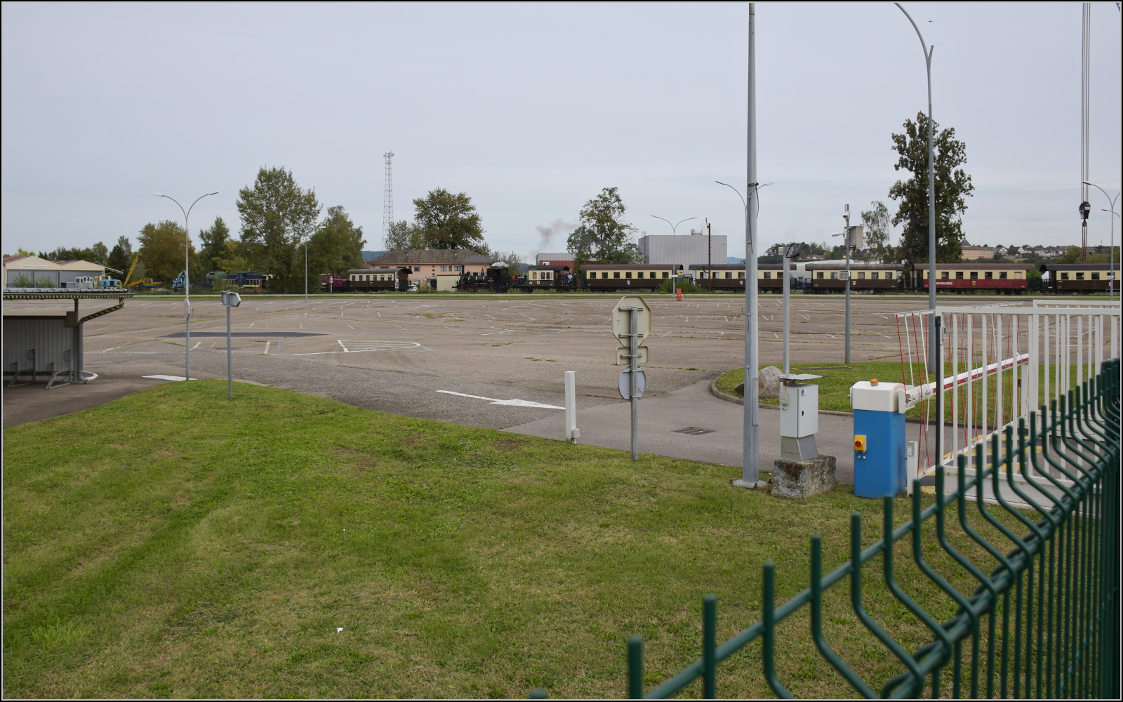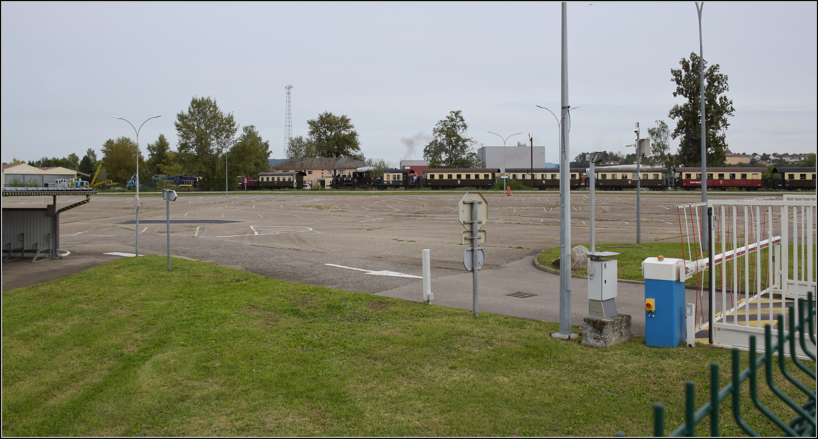 Kaugummis werden heute keine produziert, wie man am leeren Parkplatz von Wrigley's France erkennen kann. Dafür zieht 030 TB 134 "Theodor" den Museumszug am Gelände vorbei. Volgelsheim, September 2024 km0