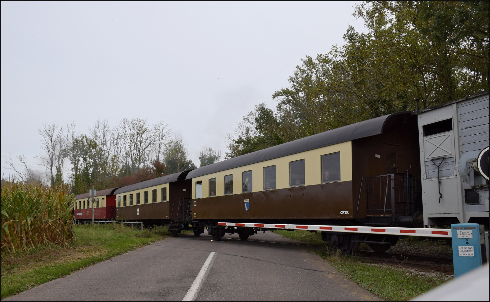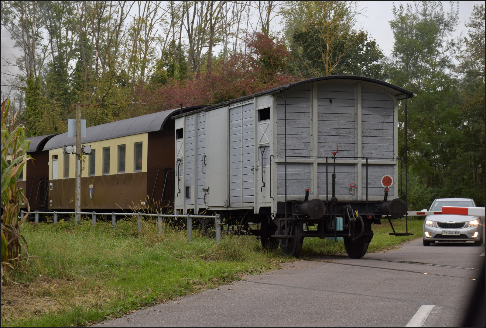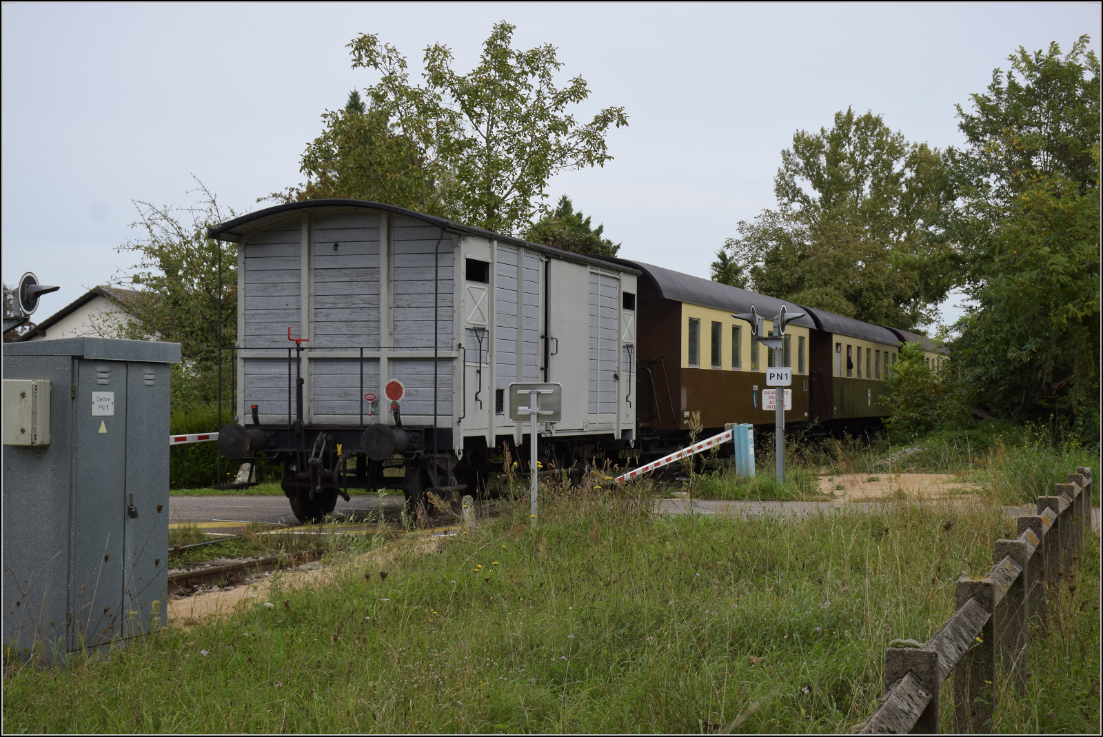 Am Zugschluss des Mueseumszugs hängt K 369. Technisch gut gewartet sieht dieser Bahnübergang nicht aus. Volgelsheim, September 2024. km0