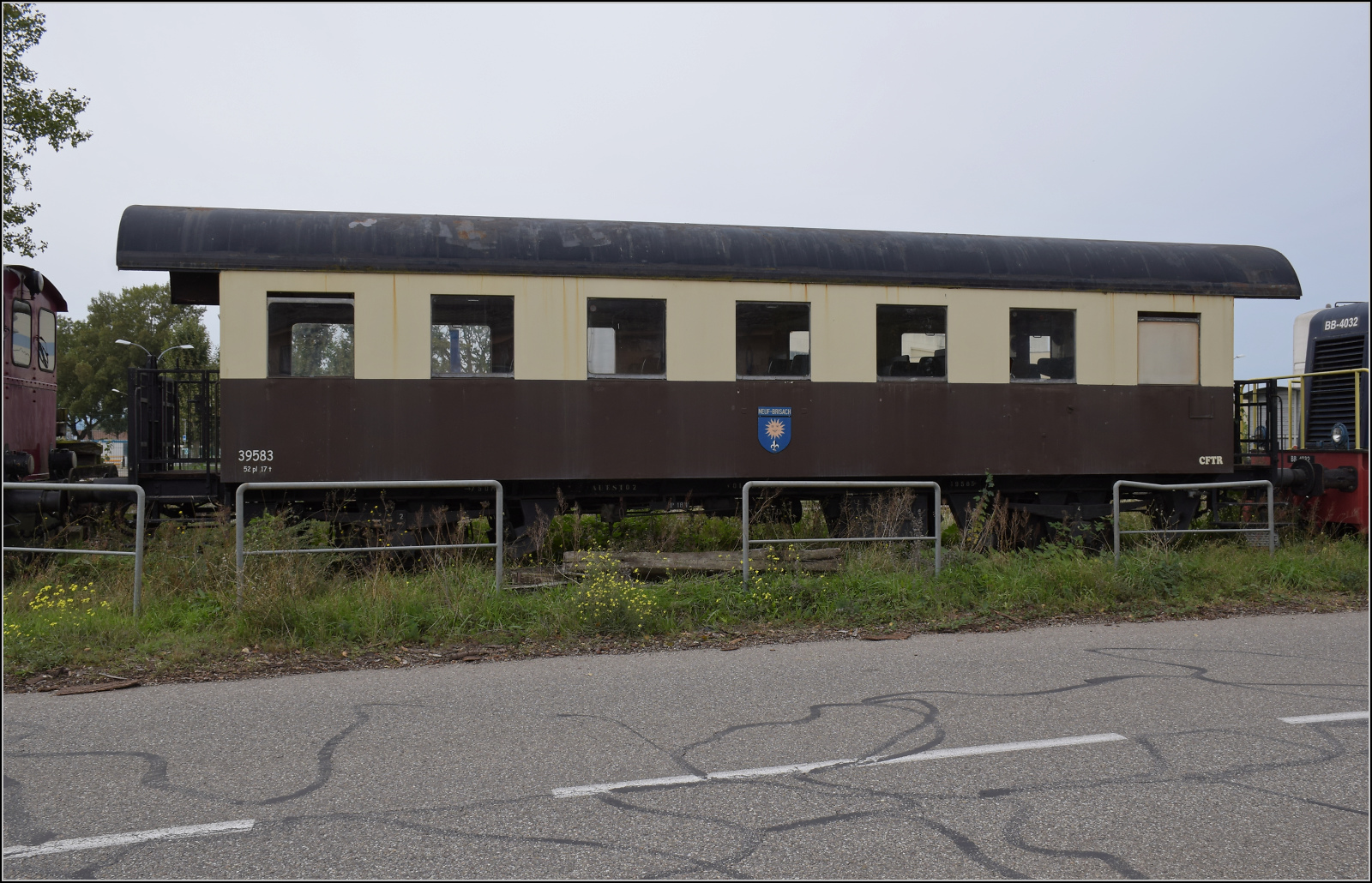 Der Wagen 39583 wurde von Wegmann im Jahr 1918 an die 'KEPV' als FFT 1851 geliefert. Die Bauart es Wagens ist mir nicht bekannt. Die Bezeichnung wechselte von 70448 Frankfurt zu 66 308 Frankfurt. In Österreich verblieben nach dem 2. Weltkrieg, erhielt er von den ÖBB die Nummer 43815. Im Jahr 1956 wurde der Wagen zu einem Spantenwagen im "Donnerbüchsen"-Design umgebaut und erhielt zunächst die Nummer 58254, um bald seine endgültige Nummer 39583 zu erhalten. 1983 wurde der Wagen ausgemustert und kam zur CFTR, wo er heute geschmückt mit dem Wappen von Neuf-Brisach im Betriebswerk der CFTR steht. Volgelsheim, September 2024. km0