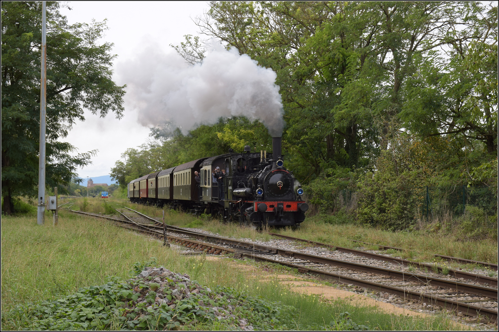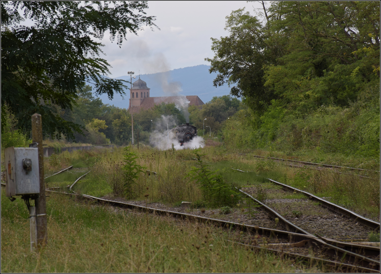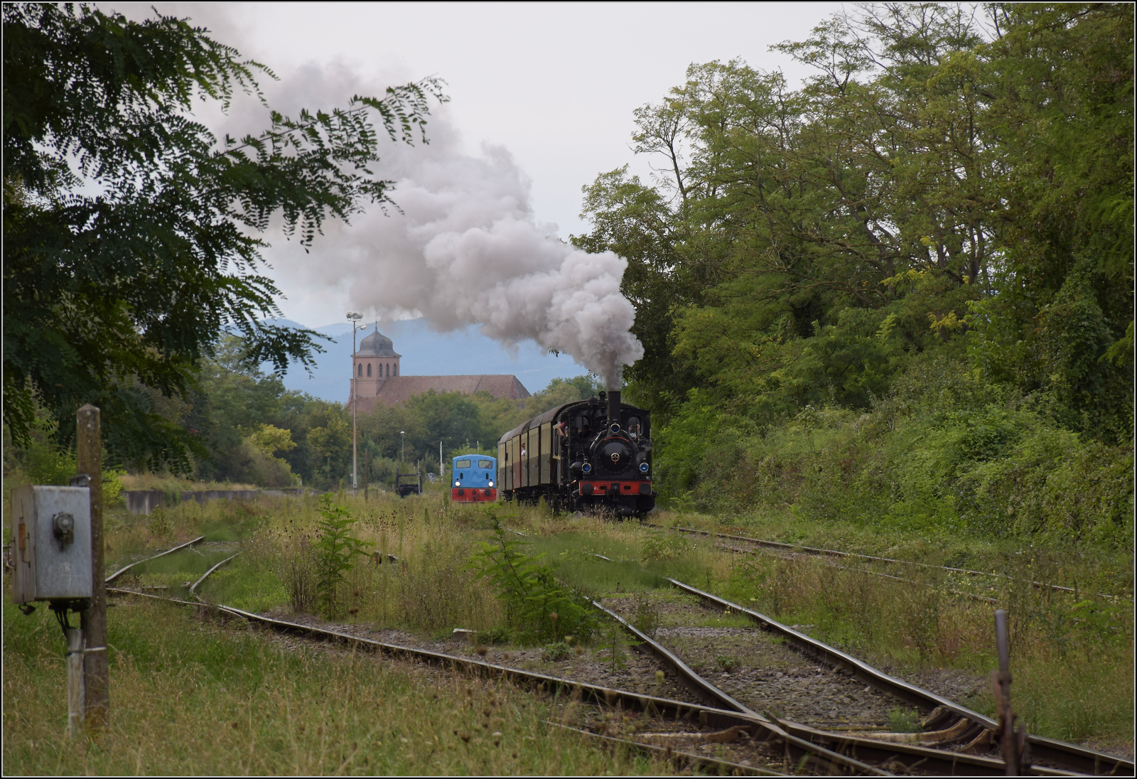 Abfahrt von 030 TB 134 "Theodor" aus dem in Volgelsheim umbenannten "Neu-Breisacher Feldbahnhof".Der Blick schweift über dessen übriggebliebenen vier Gleise, dann zum Weltkulturerbe, der Festungsstadt Neu-Breisach, bis in die Vogesen. Zwischen Pfaffenheimerkopf und Bildstöckle lugt noch der weiter entfernte Rainkopf mit 1305 m Höhe hervor. Volgelsheim, September 2024. km0