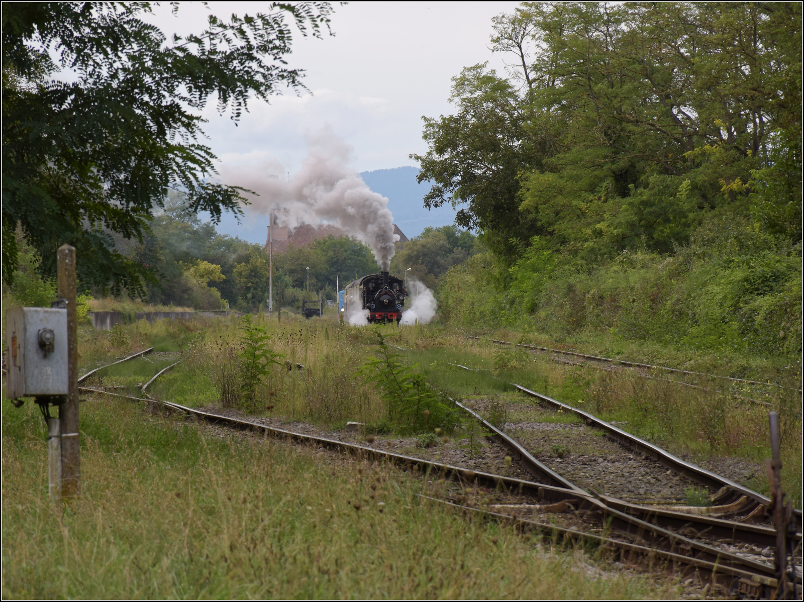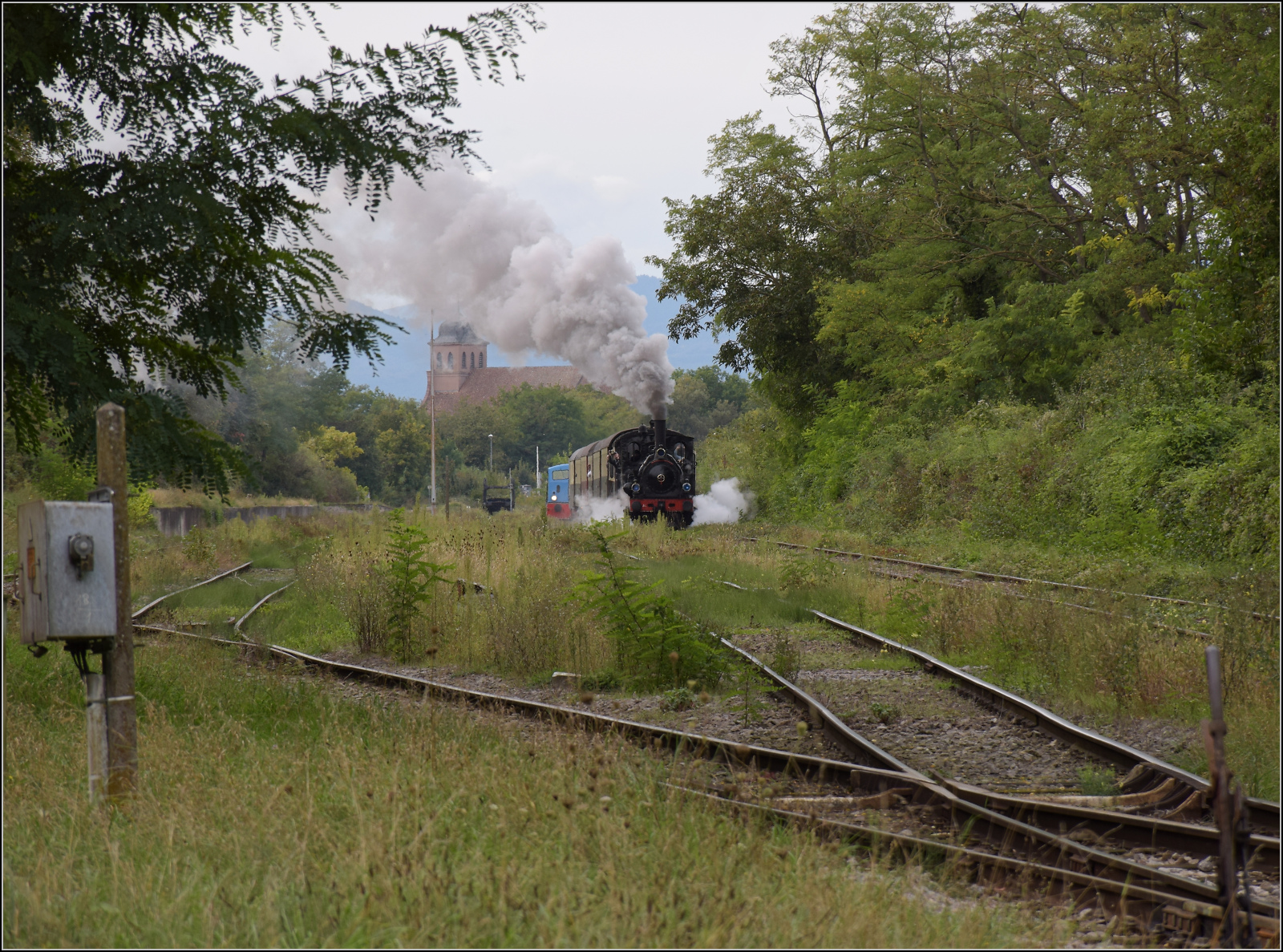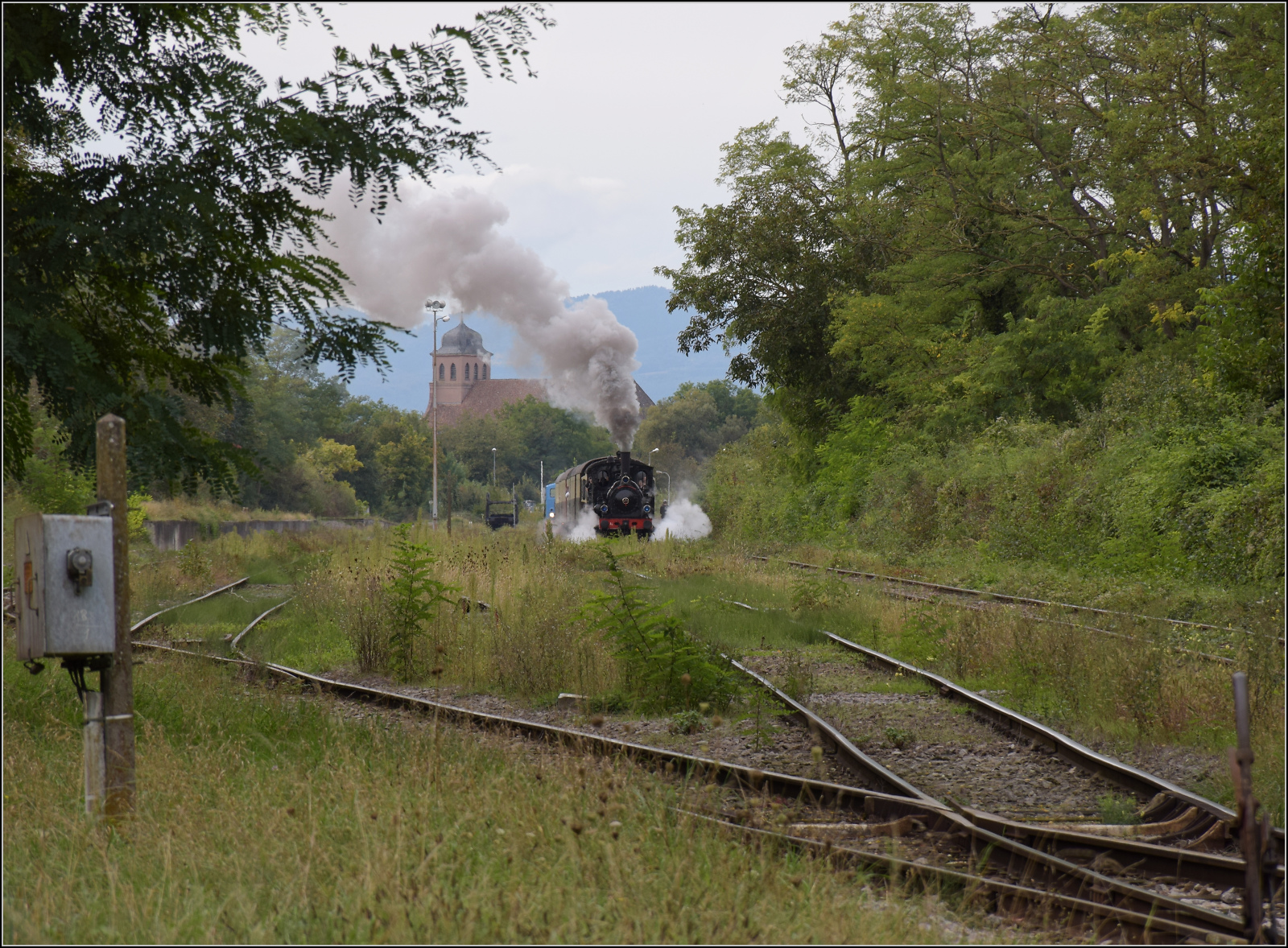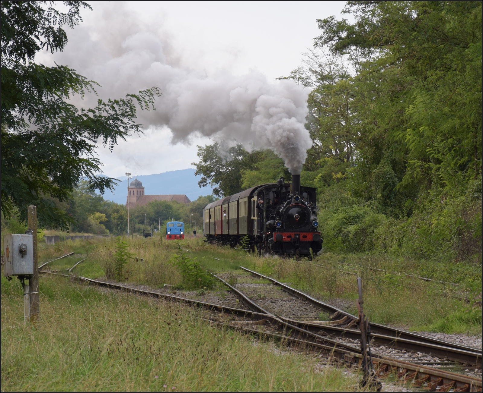 Abfahrt von 030 TB 134 "Theodor" aus dem in Volgelsheim umbenannten "Neu-Breisacher Feldbahnhof".Der Blick schweift über dessen übriggebliebenen vier Gleise, dann zum Weltkulturerbe, der Festungsstadt Neu-Breisach, bis in die Vogesen. Zwischen Pfaffenheimerkopf und Bildstöckle lugt noch der weiter entfernte Rainkopf mit 1305 m Höhe hervor. Volgelsheim, September 2024. km0