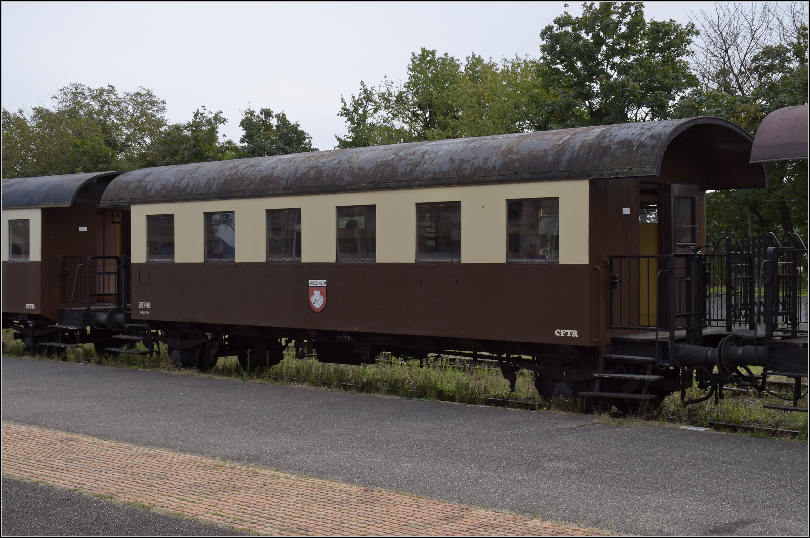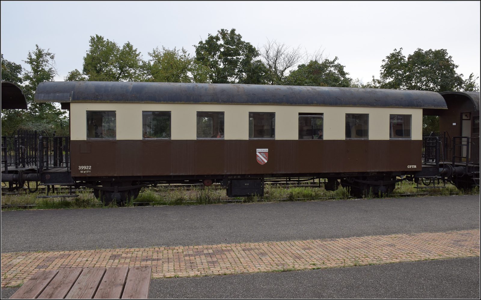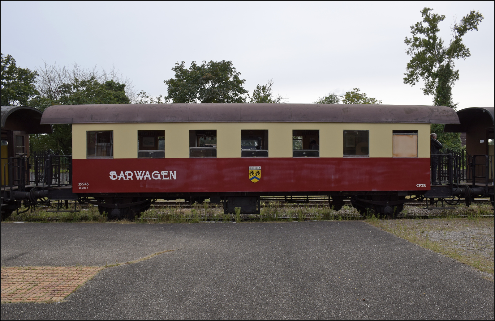 Der österreichischen Spantenwagen im Donnerbüchsendesign als Barwagen 39946 'Volgelsheim' in Volgelsheim. September 2024. km0