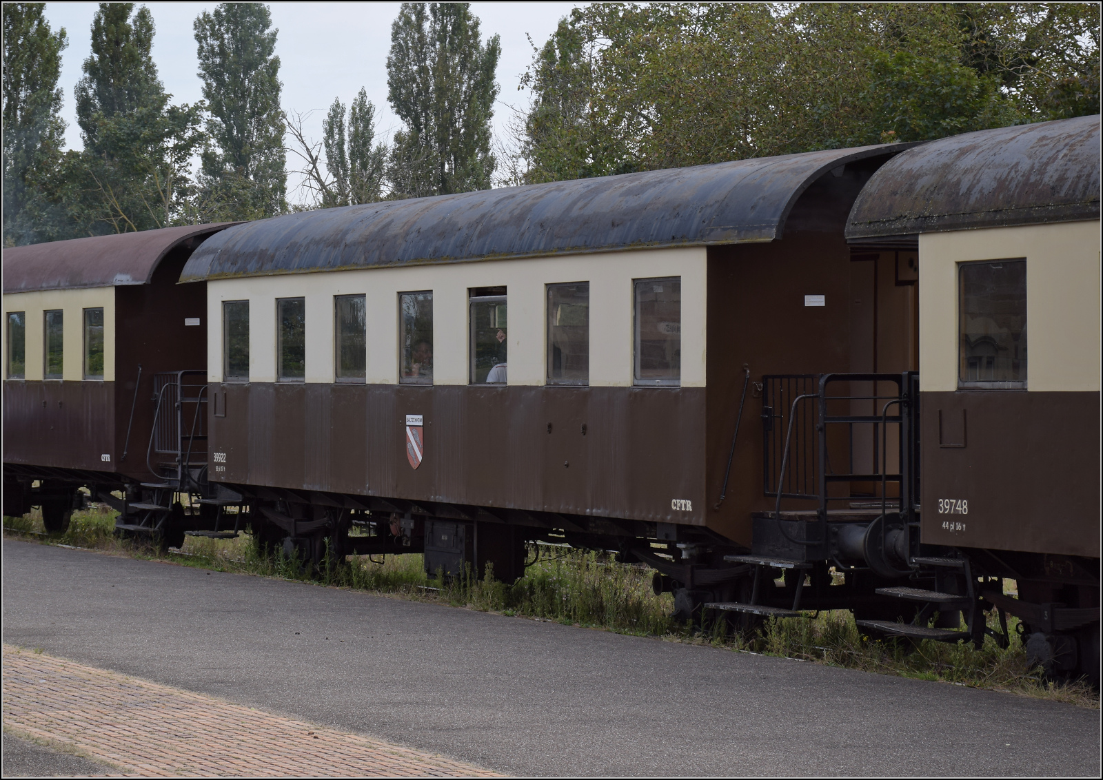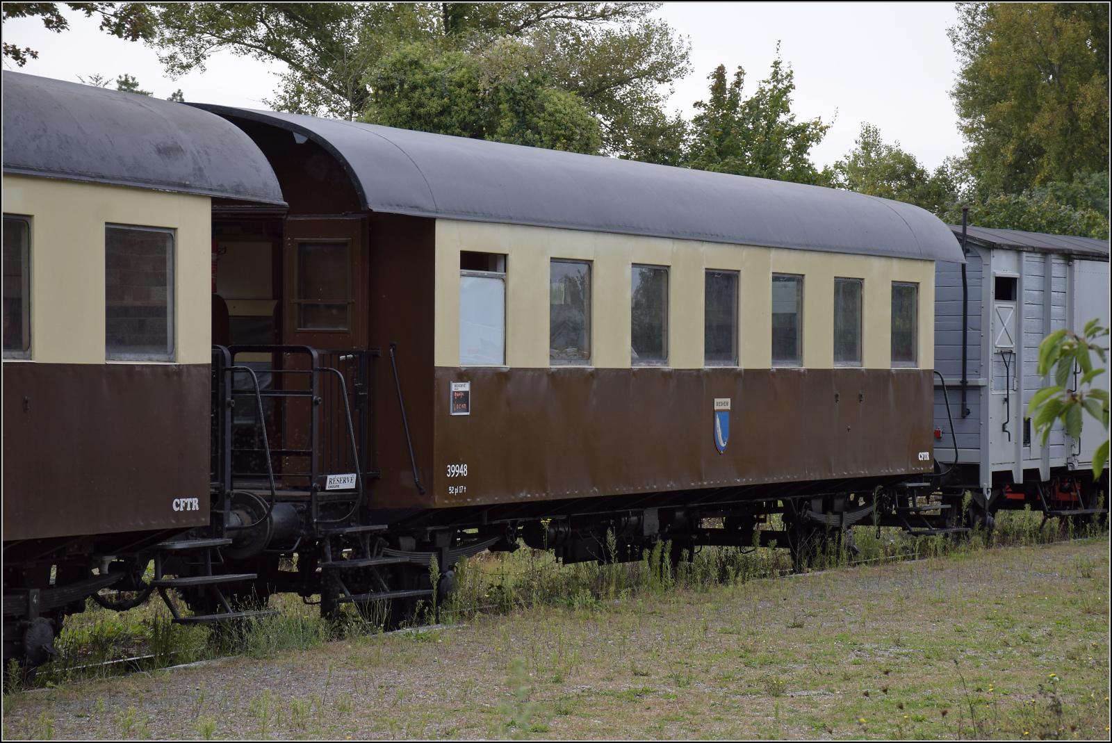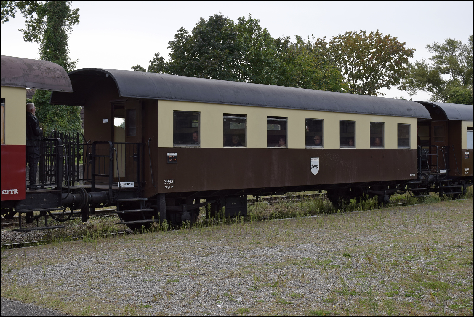 Der österreichischen Spantenwagen im Donnerbüchsendesign als Barwagen 39946 'Volgelsheim' in Volgelsheim. September 2024. km0