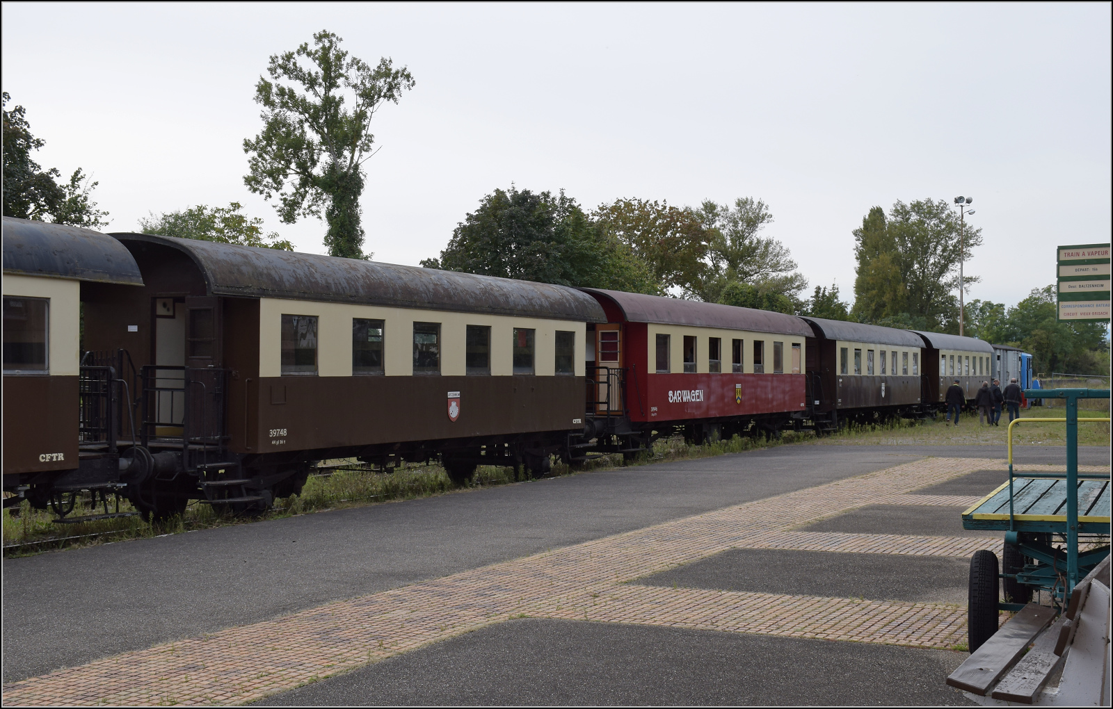 Die österreichischen Spantenwagen im Donnerbüchsendesign 39748 'Artzenheim', der Barwagen 39946 'Volgelsheim', 39931 'Markolsheim' und 39948 'Biesheim' in Volgelsheim. September 2024. km0