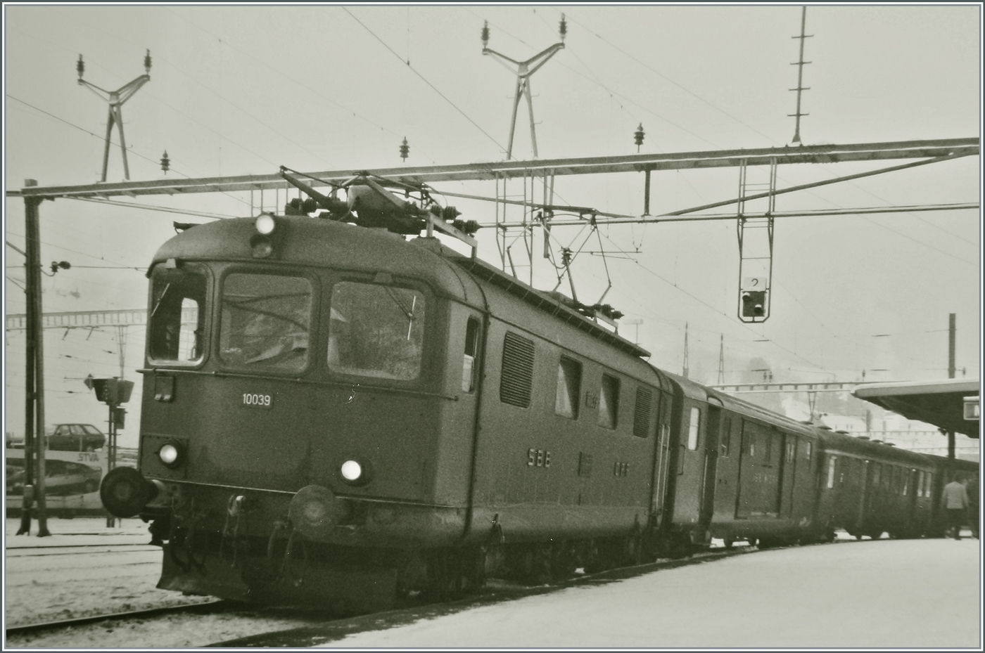 Die Re 4/4 I 10039 verlässt mit ihrem Extrazug 31131 Lausanne mit dem Ziel Zürich Enge. Leider ist bei diesen Lichtverhältnissen die Bewegungsunschärfe bereits sehr grenzwertig, doch ich finde die Seltenheit des Bildes sollte die qualitativen Mängeln gerade noch verkraften. Die Re 4/4 I gehört heute der SWISS RAIL TRAFFIC und war früher als Re 416 628 bei der Mittelthurgaubahn unterwegs und vorgängig bei den SBB mit der heute noch angeschrieben Nummer 10039 im Einsatz. Damals trug die am 22. Dez. 1950 abgelieferte Lok jedoch noch die verchromten Buchstaben SBB - CFF resp. SBB - FFS an den Seitenwänden.