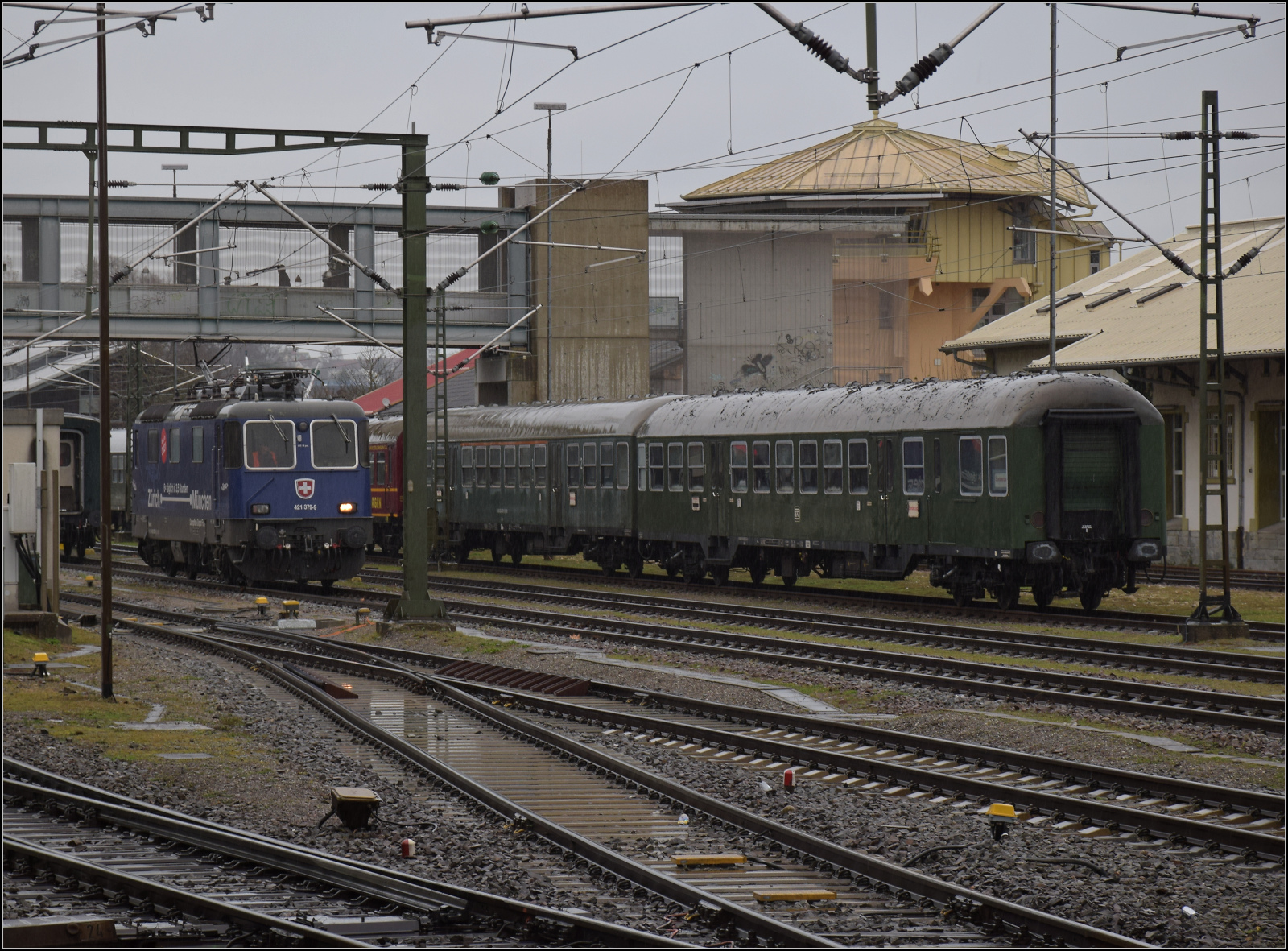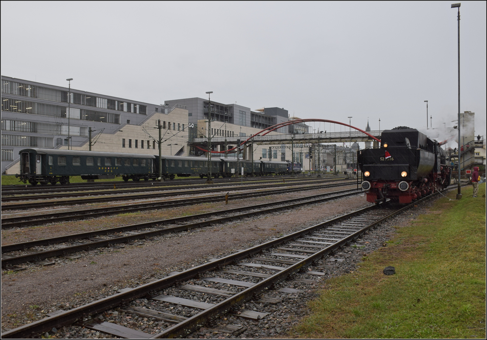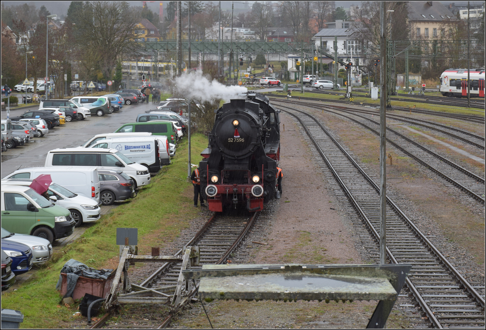 52 7596 in strömendem Regen beim Auffüllen der Wasservorräte auf dem ehemaligen Hafengleis im Bahnhof Konstanz. Unterdessen rangiert Re 421 379 ihren Wagenpark aus schweren Umbau-Stahlwagen auf Gleis 4. Dezember 2024. km0