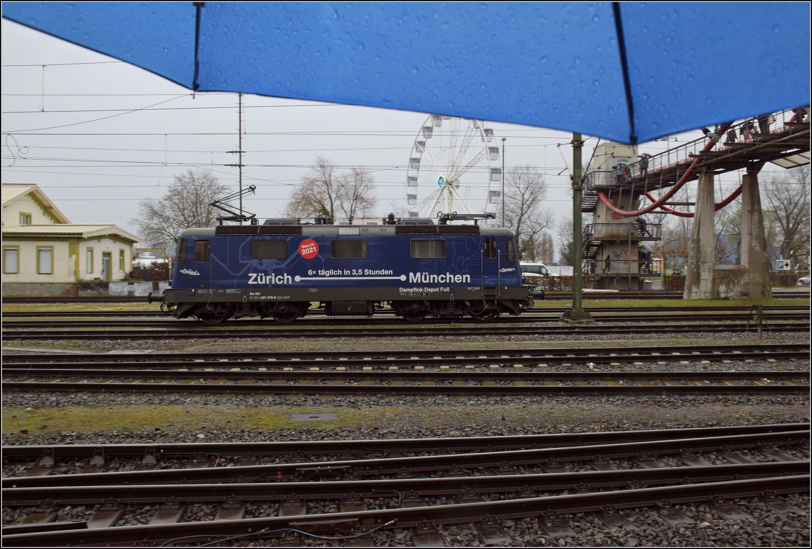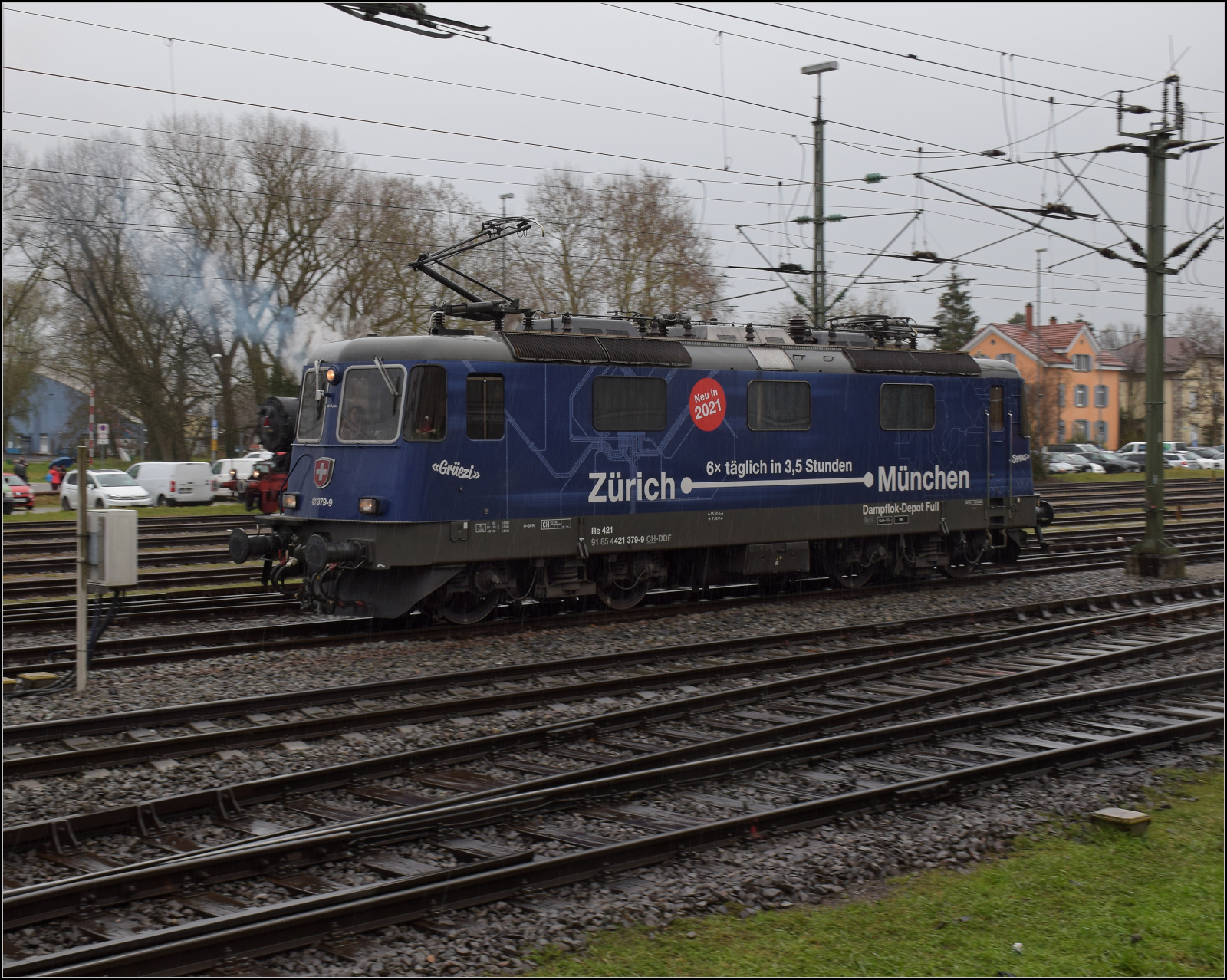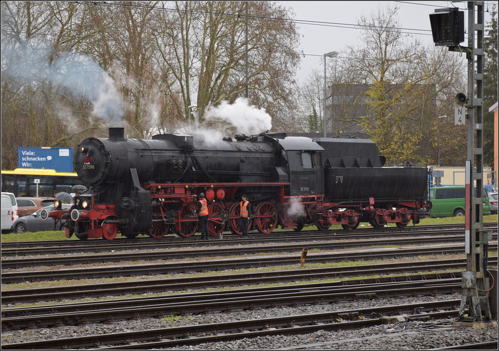 52 7596 in strömendem Regen beim Auffüllen der Wasservorräte auf dem ehemaligen Hafengleis im Bahnhof Konstanz. Unterdessen rangiert Re 421 379 ihren Wagenpark aus schweren Umbau-Stahlwagen auf Gleis 4.Dezember 2024. km0