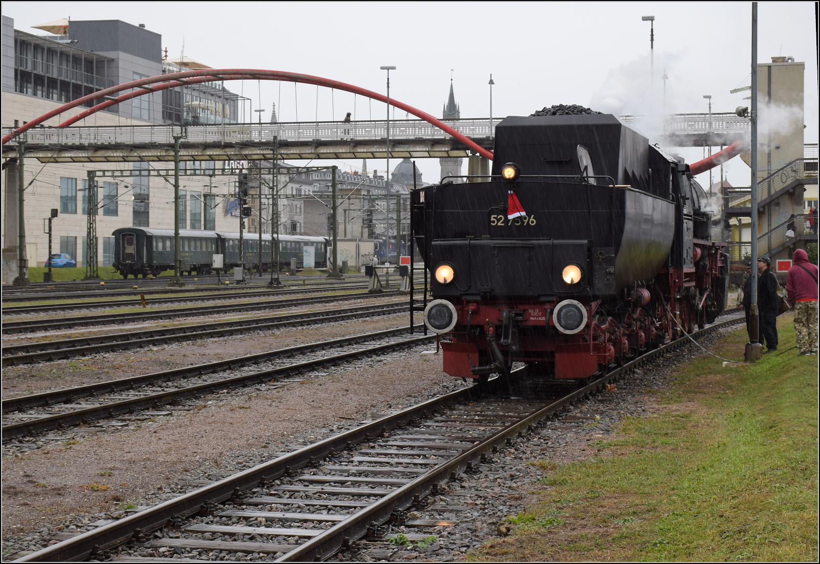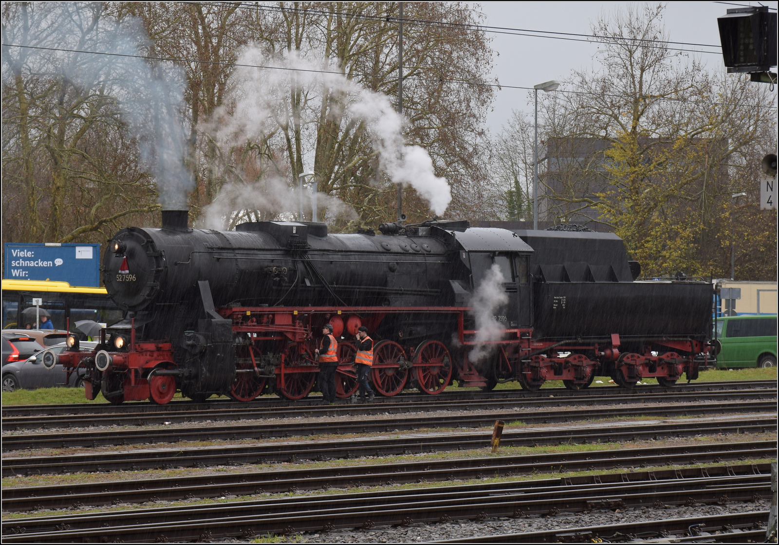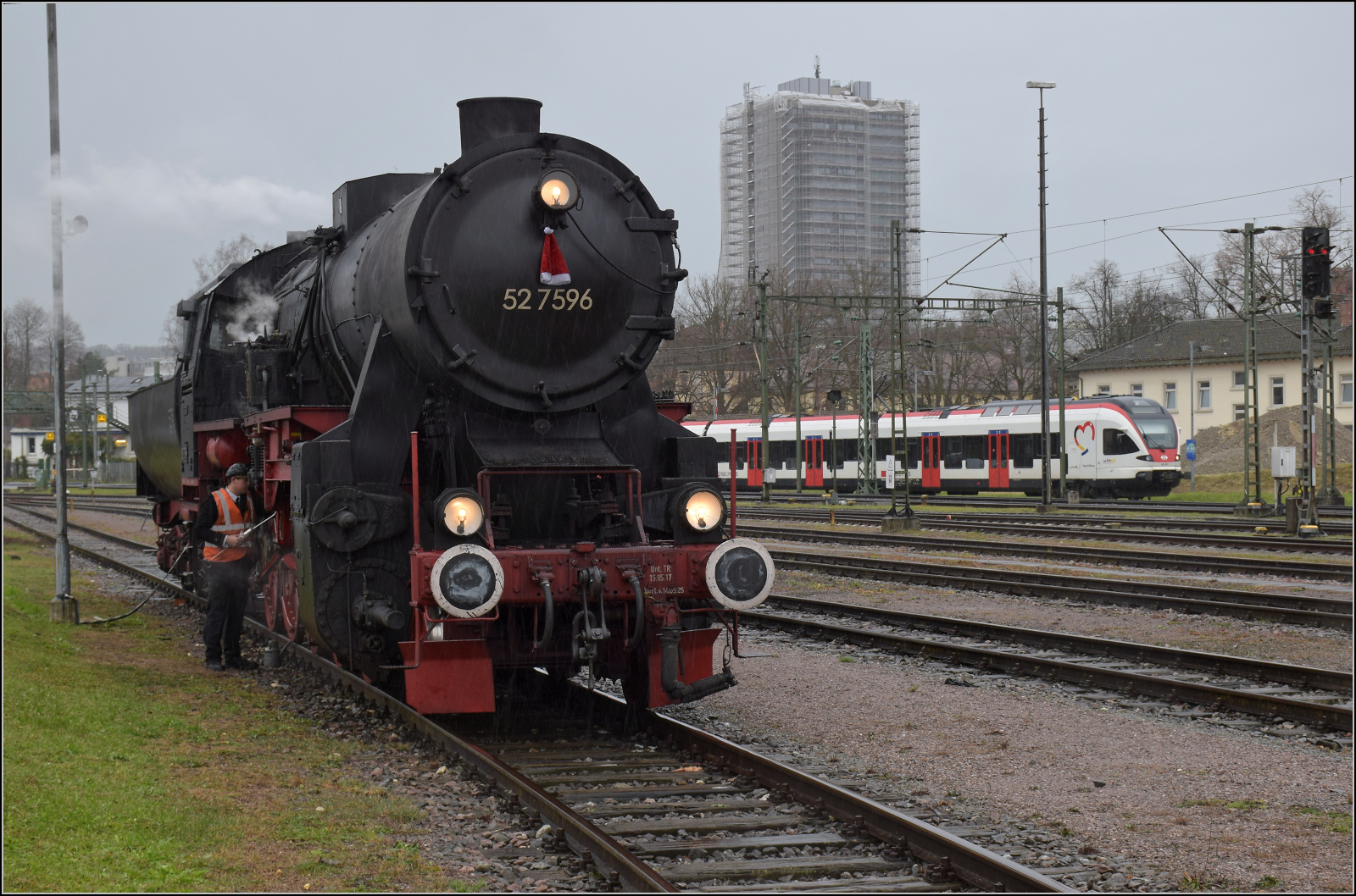 52 7596 in strömendem Regen beim Auffüllen der Wasservorräte auf dem ehemaligen Hafengleis im Bahnhof Konstanz. Außerdem gilt, wer gut schmiert, der gut fährt. Dezember 2024. km0