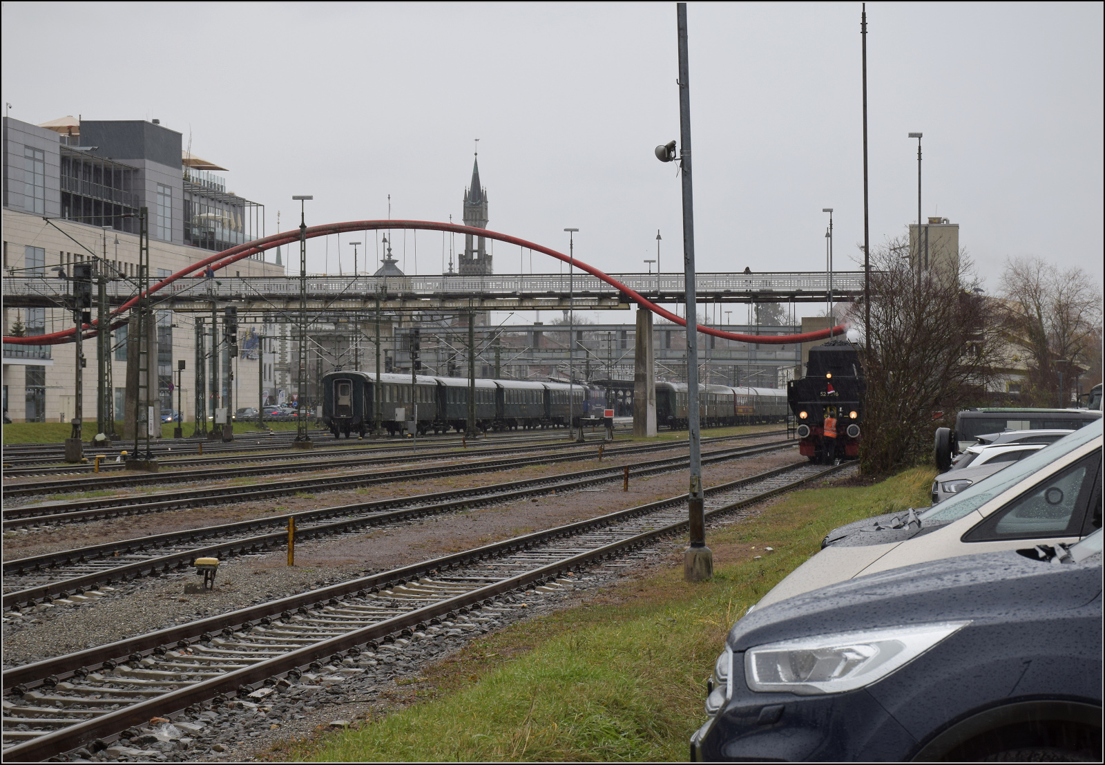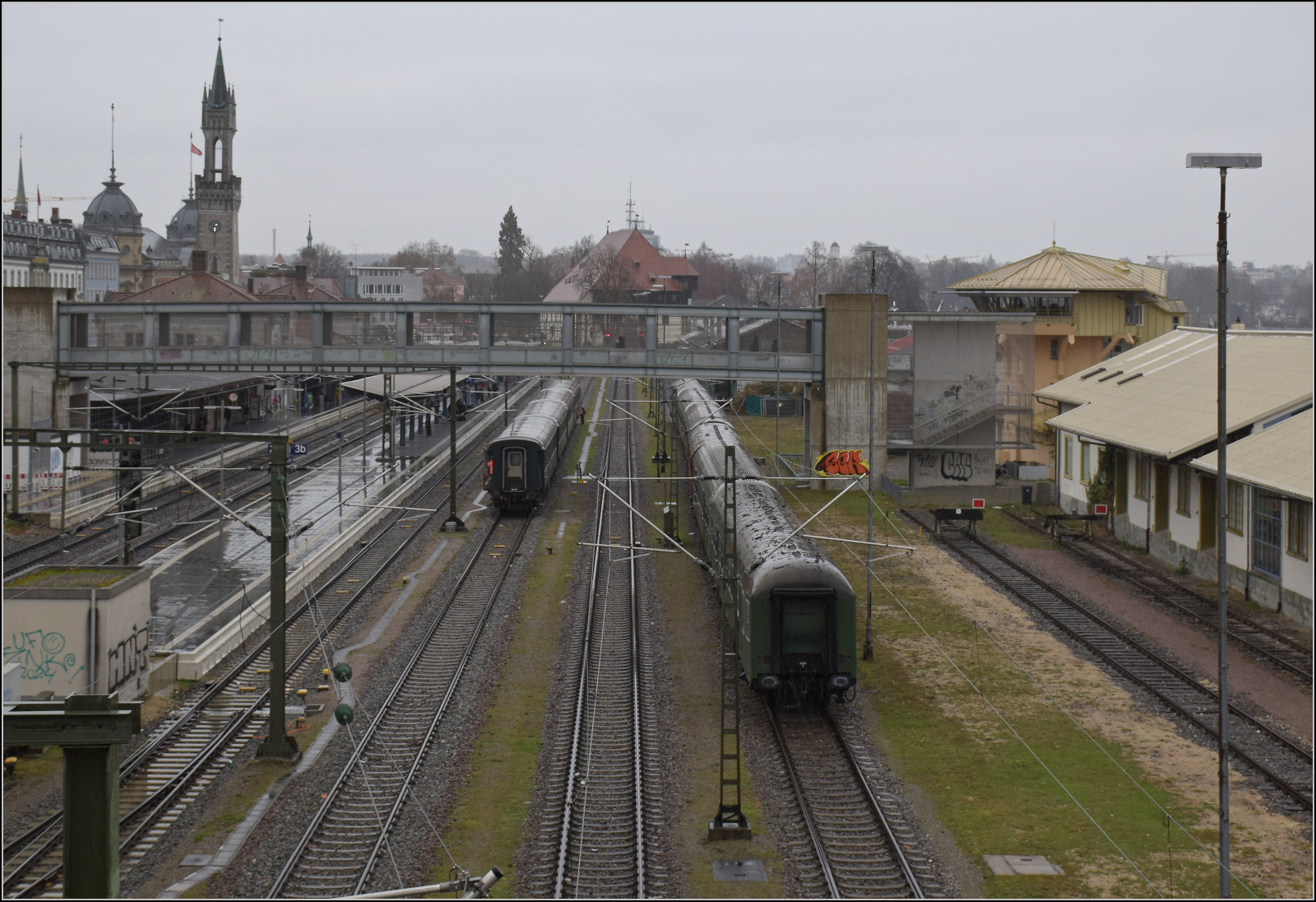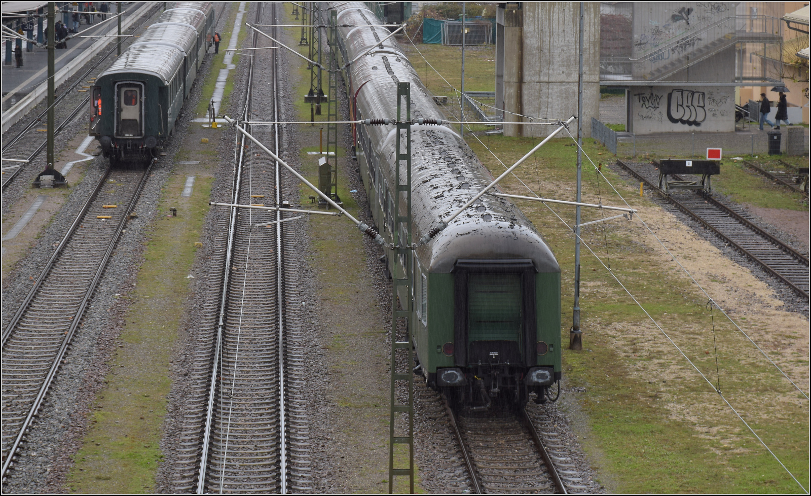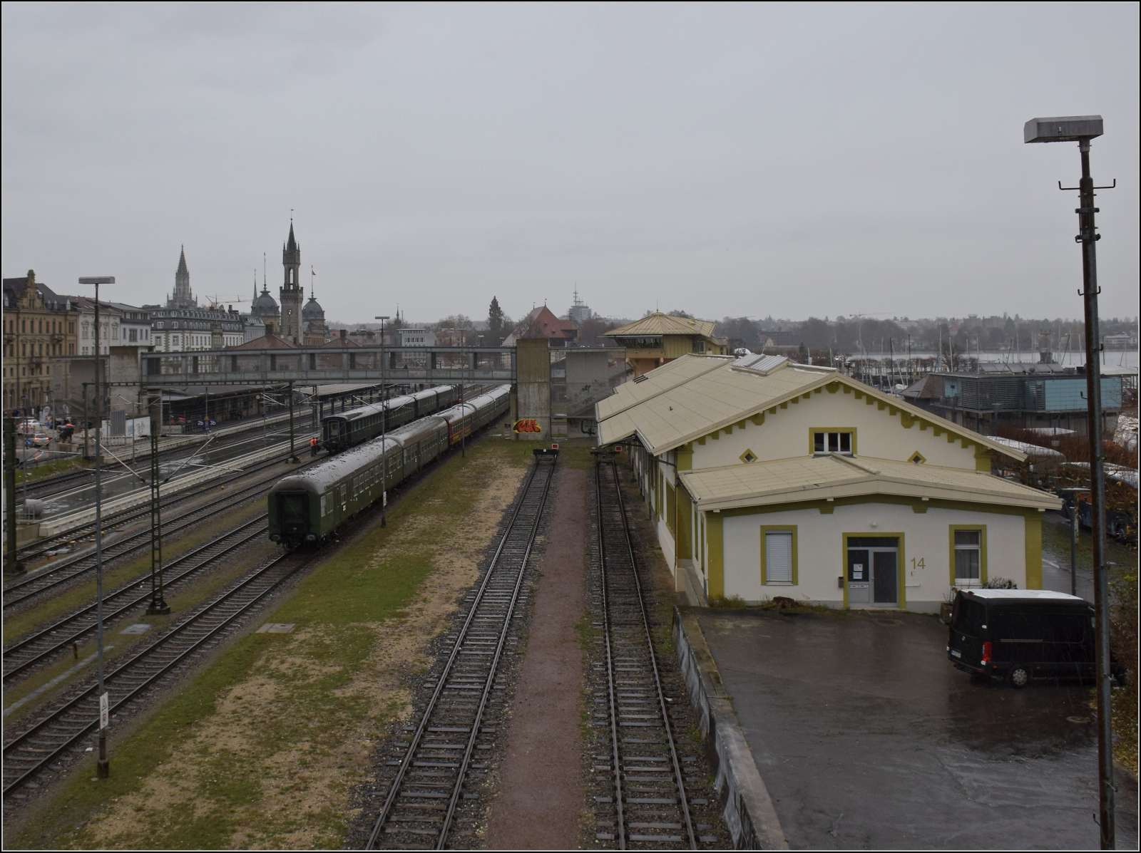 Blick über den Bahnhof Konstanz mit den abgestellten Wagen der DDF (schwere Umbau-Stahlwagen) und der EFZ mit den Wegmannwagen, einem Mitropa-Speisewagen und neu einem Schnellzughalbgepäckwagen. Dezember 2024. km0