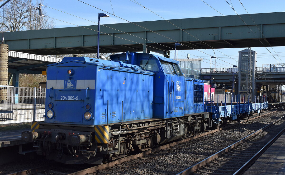Eisenbahnbau- und Betriebsgesellschaft Pressnitztalbahn mbH, Jöhstadt (PRESS) mit ihrer "204 009-9" [NVR-Nummer: 98 80 3202 439-6 D-PRESS] und zwei firmeneigenen Rungenflachwagen am Haken am 07.03.25urchfahrt Bahnhof Berlin Hohenschönhausen. Lothar Stöckmann